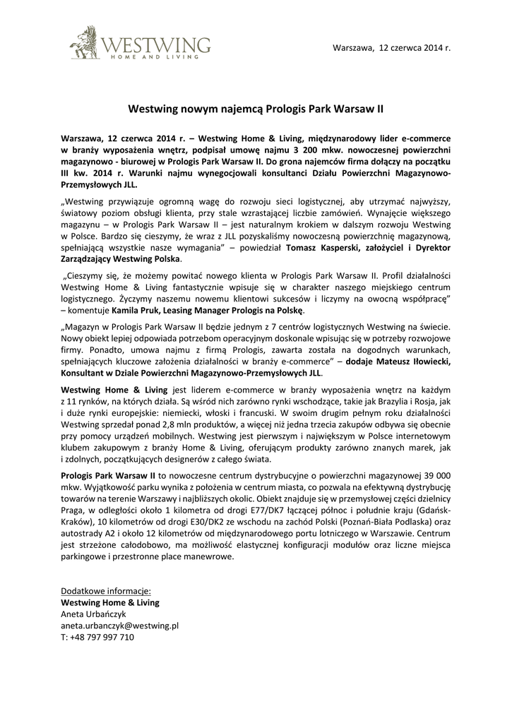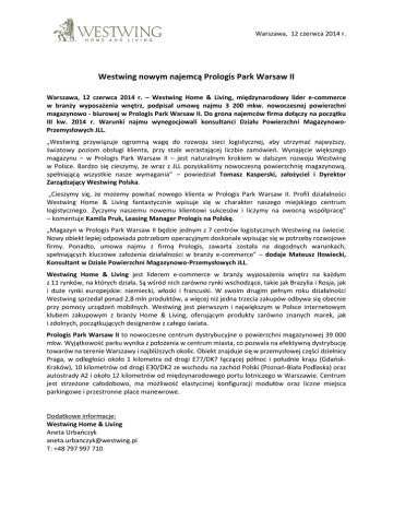 Warszawa, 12 czerwca 2014 r. Westwing nowym najemcą Prologis Park Warsaw II Warszawa, 12 czerwca 2014 r. – Westwing Home & Living, międzynarodowy lider e-commerce w branży wyposażenia wnętrz, podpisał umowę najmu 3 200 mkw. nowoczesnej powierzchni magazynowo - biurowej w Prologis Park Warsaw II. Do grona najemców firma dołączy na początku III kw. 2014 r. Warunki najmu wynegocjowali konsultanci Działu Powierzchni MagazynowoPrzemysłowych JLL. „Westwing przywiązuje ogromną wagę do rozwoju sieci logistycznej, aby utrzymać najwyższy, światowy poziom obsługi klienta, przy stale wzrastającej liczbie zamówień. Wynajęcie większego magazynu – w Prologis Park Warsaw II – jest naturalnym krokiem w dalszym rozwoju Westwing w Polsce. Bardzo się cieszymy, że wraz z JLL pozyskaliśmy nowoczesną powierzchnię magazynową, spełniającą wszystkie nasze wymagania” – powiedział Tomasz Kasperski, założyciel i Dyrektor Zarządzający Westwing Polska. „Cieszymy się, że możemy powitać nowego klienta w Prologis Park Warsaw II. Profil działalności Westwing Home & Living fantastycznie wpisuje się w charakter naszego miejskiego centrum logistycznego. Życzymy naszemu nowemu klientowi sukcesów i liczymy na owocną współpracę” – komentuje Kamila Pruk, Leasing Manager Prologis na Polskę. „Magazyn w Prologis Park Warsaw II będzie jednym z 7 centrów logistycznych Westwing na świecie. Nowy obiekt lepiej odpowiada potrzebom operacyjnym doskonale wpisując się w potrzeby rozwojowe firmy. Ponadto, umowa najmu z firmą Prologis, zawarta została na dogodnych warunkach, spełniających kluczowe założenia działalności w branży e-commerce” – dodaje Mateusz Iłowiecki, Konsultant w Dziale Powierzchni Magazynowo-Przemysłowych JLL. Westwing Home & Living jest liderem e-commerce w branży wyposażenia wnętrz na każdym z 11 rynków, na których działa. Są wśród nich zarówno rynki wschodzące, takie jak Brazylia i Rosja, jak i duże rynki europejskie: niemiecki, włoski i francuski. W swoim drugim pełnym roku działalności Westwing sprzedał ponad 2,8 mln produktów, a więcej niż jedna trzecia zakupów odbywa się obecnie przy pomocy urządzeń mobilnych. Westwing jest pierwszym i największym w Polsce internetowym klubem zakupowym z branży Home & Living, oferującym produkty zarówno znanych marek, jak i zdolnych, początkujących designerów z całego świata. Prologis Park Warsaw II to nowoczesne centrum dystrybucyjne o powierzchni magazynowej 39 000 mkw. Wyjątkowość parku wynika z położenia w centrum miasta, co pozwala na efektywną dystrybucję towarów na terenie Warszawy i najbliższych okolic. Obiekt znajduje się w przemysłowej części dzielnicy Praga, w odległości około 1 kilometra od drogi E77/DK7 łączącej północ i południe kraju (GdańskKraków), 10 kilometrów od drogi E30/DK2 ze wschodu na zachód Polski (Poznań-Biała Podlaska) oraz autostrady A2 i około 12 kilometrów od międzynarodowego portu lotniczego w Warszawie. Centrum jest strzeżone całodobowo, ma możliwość elastycznej konfiguracji modułów oraz liczne miejsca parkingowe i przestronne place manewrowe. Dodatkowe informacje: Westwing Home & Living Aneta Urbańczyk [email protected] T: +48 797 997 710 __________________________________________________________________________________________ Westwing to międzynarodowy lider e-commerce z branży home & living, który oferuje swoim użytkownikom wyjątkowe produkty do dekoracji i wyposażenia wnętrz w atrakcyjnych cenach. Westwing działa obecnie w 10 krajach, a siedziba główna firmy znajduje się w Monachium, w Niemczech. Firma została założona w 2011 r. i otrzymała ponad 100 mln USD od grupy inwestorów, wśród których są m.in. Access Industries, Holtzbrinck Ventures, Investment AB Kinnevik i Summit Partners. JLL jest międzynarodową firmą doradczą świadczącą kompleksowe usługi na rynku nieruchomości komercyjnych. JLL obsługuje klientów w 75 krajach na świecie. Dochód firmy w 2013 roku wyniósł ponad 4,0 mld USD. JLL zarządza obiektami o łącznej powierzchni ok. 280 mln mkw. W 2013 r. firma zrealizowała na całym świecie transakcje o łącznej wartości 99 mld USD. LaSalle Investment Management (spółka w ramach grupy), zarządza aktywami o łącznej wartości ok. 48 mld USD. W celu uzyskania dodatkowych informacji, zapraszamy do odwiedzenia naszej strony internetowej www.jll.pl