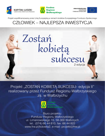 Projekt współfinansowany przez Unię Europejską w ramach środków Europejskiego Funduszu Społecznego Człowiek – najlepsza inwestycja Zostań kobietą sukcesu 2 edycja Projekt „ZOSTAŃ KOBIETĄ SUKCESU- edycja II” realizowany przez Fundusz Regionu Wałbrzyskiego zs. w Wałbrzychu Biuro projektu: Fundusz Regionu Wałbrzyskiego ul. Limanowskiego 15, 58-300 Wałbrzych tel.: (074) 66 44 810, fax: 66 44 822 www.frw.pl/kobieta2, e-mail: [email protected] Projekt „ZOSTAŃ KOBIETĄ SUKCESU- edycja II” realizowany przez Fundusz Regionu Wałbrzyskiego zs. w Wałbrzychu Celem projektu jest przygotowanie 40 uczestniczek do rozpoczęcia i prowadzenia własnej działalności gospodarczej poprzez udział w szkoleniach, ogólnym doradztwie grupowym i indywidualnym oraz przekazanie wsparcia finansowego (inwestycyjnego i pomostowego) dla 36 z nich. Projekt skierowany jest wyłącznie do kobiet, w tym zwłaszcza powracających oraz wchodzących po raz pierwszy na rynek pracy po przerwie związanej z urodzeniem i wychowaniem dzieci, zamierzających rozpocząć działalność gospodarczą (z wyłączeniem osób, które posiadały zarejestrowaną działalność gospodarczą w okresie 1 roku przed przystąpieniem do projektu), które nie są zarejestrowane w PUP oraz które uczą się, pracują lub zamieszkują na terenie następujących powiatów: milicki, legnicki, bolesławiecki, kamiennogórski, wołowski, strzeliński, polkowicki, lwówecki, górowski, jaworski, lubański, złotoryjski, dzierżoniowski, kłodzki, ząbkowicki. Rodzaje wsparcia udzielonego w ramach projektu: 1. Wsparcie szkoleniowo-doradcze dla osób zainteresowanych rozpoczęciem działalności gospodarczej. 2. Przekazanie jednorazowej dotacji inwestycyjnej w wysokości 30.000 PLN – środki finansowe przeznaczone na sfinansowanie wydatków związanych z rozpoczęciem działalności gospodarczej. 3. Wsparcie pomostowe: • Podstawowe wsparcie pomostowe w wysokości 600 PLN miesięcznie przez okres pierwszych 6 miesięcy, • Przedłużone wsparcie pomostowe w wysokości 600 PLN miesięcznie prze okres następnych 6 miesięcy. 4. Doradztwo indywidualne i pomoc w efektywnym wykorzystaniu dotacji po założeniu działalności gospodarczej (4 h konsultacji dla jednego uczestnika). Projekt zakłada zorganizowanie 4 cykli szkoleniowo-doradczych. W każdym będzie uczestniczyć 10 osób. Jeden cykl przewiduje 5 dni szkolenia po 4 godziny dziennie oraz 5 dni doradztwa grupowego po 4 godziny dziennie. Po zakończeniu etapu szkoleniowo-doradczego, uczestniczki będą miały możliwość ubiegania się o przyznanie środków na rozwój działalności oraz o otrzymanie wsparcia pomostowego. Środki finansowe na rozwój przedsiębiorczości będą przyznane tylko tym uczestniczkom, które zakończyły udział w etapie szkoleniowo-doradczym (otrzymały zaświadczenie) oraz zarejestrowały działalność gospodarczą. W tym celu będą musiały sporządzić biznes plan swojego przedsięwzięcia na najbliższe 2 lata oraz złożyć wniosek o przyznanie środków finansowych na rozwój przedsiębiorczości. Projekt przewiduje przekazanie wsparcia finansowego w wysokości 30.000 PLN dla 36 uczestniczek projektu. Osoba, która otrzyma wsparcie zobowiązana będzie do wniesienia wkładu własnego (w formie rzeczowej lub pieniężnej) w wysokości 10% przyznanej dotacji inwestycyjnej. Uczestniczkom zapewniamy catering oraz zwrot kosztów dojazdu. Szczegółowe warunki uczestnictwa w projekcie oraz zasady ubiegania się o uzyskanie wsparcia finansowego i pomostowego znajdują się na stronie internetowej www.frw.pl. Uwaga!!! Rekrutacja do I cyklu szkoleniowo-doradczego rozpocznie się w styczniu 2012 roku, a cykl szkoleniowo-doradczy wystartuje w lutym 2012 roku. Szczegółowe warunki uczestnictwa w projekcie oraz zasady ubiegania się o uzyskanie wsparcia finansowego i pomostowego znajdują się na stronie: www.frw.pl/ kobieta2. Planowane terminy rekrutacji: Rekrutacji do I bloku: 09.01.2012 – 13.01.2012 Rekrutacji do II bloku: 06.02.2012 – 10.02.2012 Rekrutacji do III bloku: 05.03.2012 – 09.03.2012 Rekrutacji do IV bloku: 02.04.2012 – 06.04.2012 Biuro projektu: Fundusz Regionu Wałbrzyskiego ul. Limanowskiego 15, 58-300 Wałbrzych tel.: (074) 66 44 810, fax: 66 44 822 www.frw.pl/kobieta2, e-mail: [email protected]