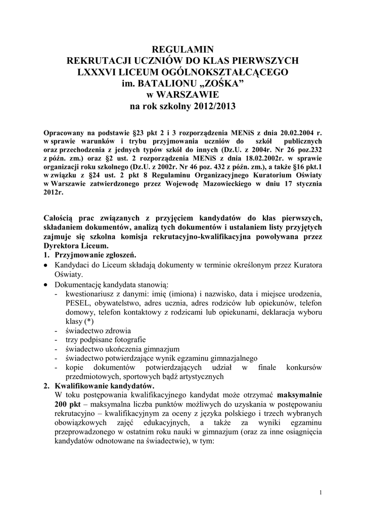 REGULAMIN REKRUTACJI UCZNIÓW DO KLAS PIERWSZYCH LXXXVI LICEUM OGÓLNOKSZTAŁCĄCEGO im. BATALIONU „ZOŚKA” w WARSZAWIE na rok szkolny 2012/2013 Opracowany na podstawie §23 pkt 2 i 3 rozporządzenia MENiS z dnia 20.02.2004 r. w sprawie warunków i trybu przyjmowania uczniów do szkół publicznych oraz przechodzenia z jednych typów szkół do innych (Dz.U. z 2004r. Nr 26 poz.232 z późn. zm.) oraz §2 ust. 2 rozporządzenia MENiS z dnia 18.02.2002r. w sprawie organizacji roku szkolnego (Dz.U. z 2002r. Nr 46 poz. 432 z późn. zm.), a także §16 pkt.1 w związku z §24 ust. 2 pkt 8 Regulaminu Organizacyjnego Kuratorium Oświaty w Warszawie zatwierdzonego przez Wojewodę Mazowieckiego w dniu 17 stycznia 2012r. Całością prac związanych z przyjęciem kandydatów do klas pierwszych, składaniem dokumentów, analizą tych dokumentów i ustalaniem listy przyjętych zajmuje się szkolna komisja rekrutacyjno-kwalifikacyjna powoływana przez Dyrektora Liceum. 1. Przyjmowanie zgłoszeń. Kandydaci do Liceum składają dokumenty w terminie określonym przez Kuratora Oświaty. Dokumentację kandydata stanowią: - kwestionariusz z danymi: imię (imiona) i nazwisko, data i miejsce urodzenia, PESEL, obywatelstwo, adres ucznia, adres rodziców lub opiekunów, telefon domowy, telefon kontaktowy z rodzicami lub opiekunami, deklaracja wyboru klasy (*) - świadectwo zdrowia - trzy podpisane fotografie - świadectwo ukończenia gimnazjum - świadectwo potwierdzające wynik egzaminu gimnazjalnego - kopie dokumentów potwierdzających udział w finale konkursów przedmiotowych, sportowych bądź artystycznych 2. Kwalifikowanie kandydatów. W toku postępowania kwalifikacyjnego kandydat może otrzymać maksymalnie 200 pkt – maksymalna liczba punktów możliwych do uzyskania w postępowaniu rekrutacyjno – kwalifikacyjnym za oceny z języka polskiego i trzech wybranych obowiązkowych zajęć edukacyjnych, a także za wyniki egzaminu przeprowadzonego w ostatnim roku nauki w gimnazjum (oraz za inne osiągnięcia kandydatów odnotowane na świadectwie), w tym: 1 100 pkt – liczba punktów możliwych do uzyskania za egzamin przeprowadzany w ostatnim roku nauki w gimnazjum. Szczegółowe wyniki egzaminu wyrażone w skali procentowej dla zadań z zakresu: - języka polskiego, - historii i wiedzy o społeczeństwie, - matematyki, - przedmiotów przyrodniczych: geografii, biologii, chemii, fizyki, - języka obcego nowożytnego na poziomie podstawowym, - wynik procentowy z zakresu przelicza się na punkty przyjmując współczynnik 0,2. 100 pkt – liczba punktów możliwych do uzyskania za oceny na świadectwie ukończenia gimnazjum z języka polskiego i trzech obowiązkowych zajęć edukacyjnych wskazanych w statucie szkoły oraz za inne osiągnięcia ucznia odnotowane na świadectwie ukończenia gimnazjum: sposób przeliczania na punkty stopni z języka polskiego i trzech obowiązkowych zajęć edukacyjnych wskazanych w statucie szkoły: - 18 punktów – stopień: celujący - 14 punktów – stopień: bardzo dobry - 10 punktów – stopień: dobry 6 punktów – stopień : dostateczny 2 punkty - stopień: dopuszczający sposób przeliczania na punkty osiągnięć ucznia wymienionych na świadectwie ukończenia gimnazjum: 13 punktów – liczba punktów za tytuł finalisty w co najmniej jednym konkursie, którego program obejmuje w całości lub poszerza treści podstawy programowej co najmniej jednego przedmiotu, organizowanym przez kuratora oświaty, co najmniej na szczeblu wojewódzkim lub za tytuł laureata, finalisty innych konkursów organizowanych przez kuratora oświaty – zasady organizacji tych konkursów i olimpiad określone zostały w rozporządzeniu Ministra Edukacji Narodowej i Sportu z dnia 29 stycznia 2002 r. w sprawie organizacji oraz sposobu przeprowadzania konkursów, turniejów i olimpiad (Dz.U. z 2002r Nr 13, poz.125). Finalista więcej niż jednego konkursu uzyskuje tylko 13 punktów, 3 punkty – liczba punktów za uzyskane wysokie miejsca – nagradzane lub honorowane zwycięskim tytułem – w zawodach wiedzy, artystycznych i sportowych organizowanych przez kuratora oświaty albo organizowanych co najmniej na szczeblu wojewódzkim przez inne podmioty działające na terenie szkół, niezależnie od liczby zawodów, w których kandydat brał udział, 2 punkty – liczba punktów za uzyskane wysokie miejsca – nagradzane lub honorowane zwycięskim tytułem – w zawodach wiedzy, artystycznych i sportowych organizowanych przez kuratora oświaty albo organizowanych 2 co najmniej na szczeblu powiatowym przez inne podmioty działające na terenie szkół, niezależnie od liczby zawodów, w których kandydat brał udział, 2 punkty – liczba punktów za osiągnięcia w aktywności na rzecz innych ludzi, zwłaszcza w formie wolontariatu lub środowiska szkolnego, 2 punkty – liczba z wyróżnieniem, punktów za świadectwo ukończenia gimnazjum do 6 punktów – liczba punktów za średnią arytmetyczną zaokrągloną do trzech miejsc po przecinku, uzyskaną z obowiązkowych zajęć edukacyjnych i dodatkowych zajęć edukacyjnych, wymienionych na świadectwie ukończenia gimnazjum oraz religii lub etyki ( w przypadku braku oceny z wymienionych wyżej zajęć edukacyjnych, zajęć tych nie uwzględnia się przy obliczaniu średniej arytmetycznej). Przy obliczaniu średniej arytmetycznej przyjmuje się następujące wartości punktowe dla stopni: - 6 punktów - stopień: celujący - 5 punktów - stopień: bardzo dobry - 4 punkty - stopień: dobry - 3 punkty - stopień: dostateczny - 2 punkty - stopień: dopuszczający 3. Wyniki rekrutacji. Suma punktów uzyskanych przez kandydata decyduje o jego miejscu na liście. Komisja Rekrutacyjno – Kwalifikacyjna decydując o umieszczeniu ucznia na liście zwraca uwagę na ocenę zachowania. Ostateczną listę przyjętych do poszczególnych klas ustala Komisja Rekrutacyjno – Kwalifikacyjna na podstawie liczby uzyskanych punktów i ilości m