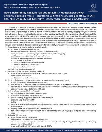 Zapraszamy na szkolenia organizowane przez Instytut Studiów Podatkowych Modzelewski i Wspólnicy Nowe instrumenty nadzoru nad podatnikami – klauzula przeciwko unikaniu opodatkowania – zagrożenia w firmie na gruncie podatków PIT,CIT, VAT, PCC; jednolity plik kontrolny – nowy rodzaj kontroli u podatników Organizator – Oddział Małopolski 13 maja br. uchwalono nowelizację Ordynacji podatkowej, która wprowadza do polskiego prawa klauzulę mającą przeciwdziałać unikaniu opodatkowania. Zadaniem klauzuli jest uniemożliwianie dokonywania czynności sztucznych, bez uzasadnienia gospodarczego, za pomocą których podatnicy próbowaliby ominąć przepisy i osiągnąć korzyści podatkowe. Jeśli MF uzna, że dana czynność podatnika, została podjęta przede wszystkim lub tylko i wyłącznie w celu obniżenia podatku, może wydać decyzję i określić w niej podatek do zapłaty we właściwej wysokości. MF przewiduje, że dzięki tej klauzuli do budżetu wpłynie nawet kilka miliardów złotych dodatkowego podatku. Podatnicy powinny przeanalizować swoje dotychczasowe i planowe transakcje pod kątem istnienia ich uzasadnienia biznesowego i gospodarczego i jego udowodnienia na wypadek kontroli. Klauzula może mieć zastosowanie do transakcji na udziałach, sprzedaży nieruchomości, znaków towarowych, umów spółek itp. Szkolenie pozwoli przygotować się do tych nowych wyzwań stawianych przedsiębiorcom. 1. Nowa klauzula przeciwko unikaniu opodatkowania : – od kiedy obowiązuje i kogo dotyczy? – przesłanki stosowania – definicja działania w sposób sztuczny – czym jest korzyść podatkowa i jaki jest jej dopuszczalny ustawowy próg – skutki podatkowe jej zastosowania dla podatników – studium przypadku zastosowanie klauzuli na gruncie: - podatków dochodowych - podatku od czynności cywilnoprawnych - podatku od spadków i darowizna - podatku od nieruchomości czyli jakie transakcje są zagrożone? 2. Klauzula obejścia a podatek od towarów i usług – nowe przepisy w podatku od towarów i usług dotyczące nadużycia prawa – definicja nadużycie prawa – skutki podatkowe nadużycia prawa 3. Nowy rodzaj postępowania podatkowego w przypadku unikania opodatkowania – organy właściwe do wydania decyzji podatkowej – tryb wszczęcia, przejęcie i prowadzenia postępowania – kiedy na wniosek kiedy z urzędu; – opinia Rady do Spraw Przeciwdziałania Unikaniu Opodatkowania i zasady jej działania w toku postępowania; – postępowania a prawo do korekty deklaracji 4. Opinie zabezpieczające Ministra Finansów – ochrona podatnika wynikająca z wydanej opinii – procedura ubiegania się o wydanie opinii – jakich transakcji mogę dotyczyć opinie zabezpieczające – spotkania uzgodnieniowe z MF – opłaty – złożenie wniosku o wydanie opinii zabezpieczającej a czynności sprawdzające, kontrola podatkowa, postępowanie podatkowego – terminy ustawowe na wydanie opinii zabezpieczającej – tryb skarżenia opinii zabezpieczających- czy na opinie zabezpieczające przysługuje skarga do sądu administracyjnego 5. Jednolity plik kontrolny – nowy sposób kontroli podatników – kogo dotyczą nowe przepisy – okres przejściowy – nowe obowiązki informacyjne dla podatników zobowiązanych wdrożyć jednolity plik kontrolny zmiany w Ordynacji podatkowej od 1 lipca 2016 r. – nowa treść ewidencji VAT zmiany od 1 stycznia 2017 r. Doradco Podatkowy, uczestnicząc w naszym szkoleniu zdobywasz 5 punktów do oceny podnoszenia kwalifikacji zawodowych INFORMACJE ORGANIZACYJNE Szkolenie poprowadzą: Anna Resiak – Doradca podatkowy, nr wpisu 12440. Z wykształcenia prawnik, absolwentka Wydziału Prawa i Administracji Uniwersytetu Jagiellońskiego. Doktorantka na Wydziale Prawa i Administracji Uniwersytetu Śląskiego. Konsultant podatkowy w Małopolskim Instytucie Studiów Podatkowych. Wcześniej przez klika lat zatrudniona w jednej z polskich spółek doradztwa podatkowego, gdzie do jej obowiązków należało bieżące doradztwo z zakresu podatków pośrednich na rzecz dużych i średnich przedsiębiorstw m.in. z branży produkcyjnej, petrochemicznej, transportowej i energetycznej, sporządzanie opinii podatkowych, przeglądy podatkowe, uczestnictwo w postępowaniach podatkowych i sądowo - administracyjnych. Posiada ponad 300 godzin doświadczenia w zakresie prowadzenia szkoleń z zakresu podatku VAT, w tym szkoleń specjalistycznych i branżowych (m.in. zmiany w podatku VAT, podatek VAT w szkolnictwie wyższym, podatek VAT w branży wodociągowo – kanalizacyjnej i energetycznej, podatek VAT w bankach spółdzielczych). Autorka licznych artykułów publikowanych w prasie branżowej oraz współautor wydawnictw książkowych: „Leksykon VAT. Praktyka, teoria, orzecznictwo.” wyd. C.H. Beck oraz „Podatek VAT w branży TSL. Prawne i podatkowe aspekty transportu, spedycji i logistyki.” wyd. Wolters Kluwer Polska. Justyna Zając-Wysocka – radca prawny, doradca podatkowy, doktorantka w Zakładzie Prawa Finansowego na Wydziale Prawa i Administracji Uniwersytetu Jagiellońskiego, Dyrektor Departamentu Doradztwa Podatkowego i członek zarządu w Małopolskim Instytucie Studiów Podatkowych sp. z o.o. Wieloletni współpracownik polskich i międzynarodowych firm doradczych. Jeden z założycieli Stowarzyszenia Doktorantów i Doktorów Prawa Podatkowego z siedzibą w Krakowie. Członek polskiego Oddziału IFA (Internati onal Fiscal Associati on). Uczestnik licznych konferencji naukowych z zakresu prawa podatkowego. Specjalizuje się w obsłudze podmiotów gospodarczych w zakresie doradztwa prawno-podatkowego oraz obsługi sporów podatkowych. Interesuje się również opodatkowaniem spółek kapitałowych oraz procedurą sądowo-administracyjną. Jest autorką licznych publikacji eksperckich z zakresu prawa podatkowego oraz uznanym wykładowcą problematyki podatku od towarów i usług. Uznana za jednego z najlepszych doradców podatkowych w zakr