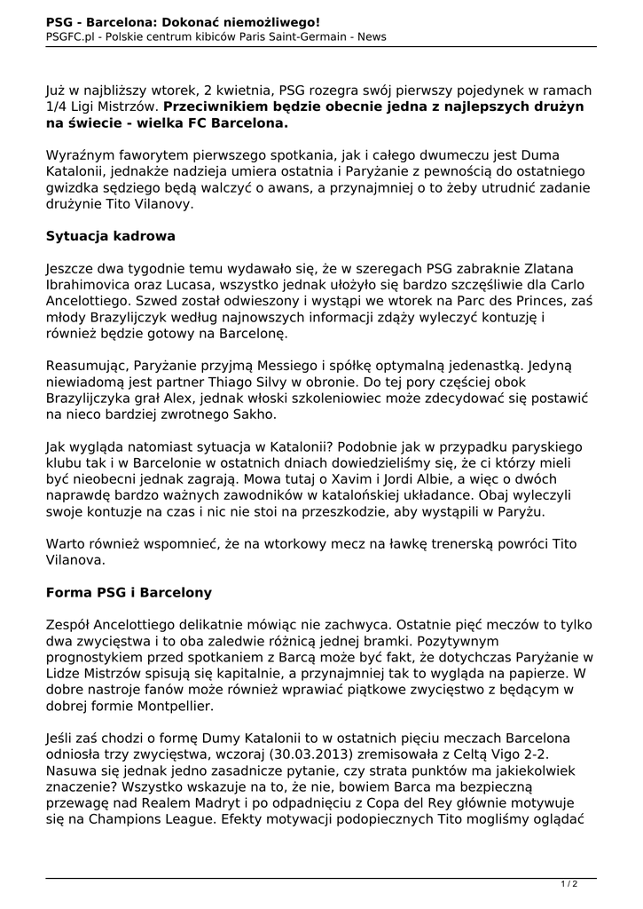 PSG - Barcelona: Dokonać niemożliwego! PSGFC.pl - Polskie centrum kibiców Paris Saint-Germain - News Już w najbliższy wtorek, 2 kwietnia, PSG rozegra swój pierwszy pojedynek w ramach 1/4 Ligi Mistrzów. Przeciwnikiem będzie obecnie jedna z najlepszych drużyn na świecie - wielka FC Barcelona. Wyraźnym faworytem pierwszego spotkania, jak i całego dwumeczu jest Duma Katalonii, jednakże nadzieja umiera ostatnia i Paryżanie z pewnością do ostatniego gwizdka sędziego będą walczyć o awans, a przynajmniej o to żeby utrudnić zadanie drużynie Tito Vilanovy. Sytuacja kadrowa Jeszcze dwa tygodnie temu wydawało się, że w szeregach PSG zabraknie Zlatana Ibrahimovica oraz Lucasa, wszystko jednak ułożyło się bardzo szczęśliwie dla Carlo Ancelottiego. Szwed został odwieszony i wystąpi we wtorek na Parc des Princes, zaś młody Brazylijczyk według najnowszych informacji zdąży wyleczyć kontuzję i również będzie gotowy na Barcelonę. Reasumując, Paryżanie przyjmą Messiego i spółkę optymalną jedenastką. Jedyną niewiadomą jest partner Thiago Silvy w obronie. Do tej pory częściej obok Brazylijczyka grał Alex, jednak włoski szkoleniowiec może zdecydować się postawić na nieco bardziej zwrotnego Sakho. Jak wygląda natomiast sytuacja w Katalonii? Podobnie jak w przypadku paryskiego klubu tak i w Barcelonie w ostatnich dniach dowiedzieliśmy się, że ci którzy mieli być nieobecni jednak zagrają. Mowa tutaj o Xavim i Jordi Albie, a więc o dwóch naprawdę bardzo ważnych zawodników w katalońskiej układance. Obaj wyleczyli swoje kontuzje na czas i nic nie stoi na przeszkodzie, aby wystąpili w Paryżu. Warto również wspomnieć, że na wtorkowy mecz na ławkę trenerską powróci Tito Vilanova. Forma PSG i Barcelony Zespół Ancelottiego delikatnie mówiąc nie zachwyca. Ostatnie pięć meczów to tylko dwa zwycięstwa i to oba zaledwie różnicą jednej bramki. Pozytywnym prognostykiem przed spotkaniem z Barcą może być fakt, że dotychczas Paryżanie w Lidze Mistrzów spisują się kapitalnie, a przynajmniej tak to wygląda na papierze. W dobre nastroje fanów może również wprawiać piątkowe zwycięstwo z będącym w dobrej formie Montpellier. Jeśli zaś chodzi o formę Dumy Katalonii to w ostatnich pięciu meczach Barcelona odniosła trzy zwycięstwa, wczoraj (30.03.2013) zremisowała z Celtą Vigo 2-2. Nasuwa się jednak jedno zasadnicze pytanie, czy strata punktów ma jakiekolwiek znaczenie? Wszystko wskazuje na to, że nie, bowiem Barca ma bezpieczną przewagę nad Realem Madryt i po odpadnięciu z Copa del Rey głównie motywuje się na Champions League. Efekty motywacji podopiecznych Tito mogliśmy oglądać 1/2 PSG - Barcelona: Dokonać niemożliwego! PSGFC.pl - Polskie centrum kibiców Paris Saint-Germain - News w rewanżowym pojedynku z Milanem, który skończył się pogromem 4-0. Podsumowując, na wtorkowy mecz oba zespoły będą miały niemal kompletne składy oraz jeden cel - zapewnić sobie dobrą sytuację przed rewanżem. Zdecydowanym faworytem jak wspominałem we wstępie jest FC Barcelona, jednak to paradoksalnie może pomóc Paryżanom. Na zakończenie przypomnijmy jeszcze datę spotkania i miejsce spotkania - 2 kwiecień 2013, godzina 20:45, Parc des Princes. Autor: dumel 2/2 Powered by TCPDF (www.tcpdf.org)