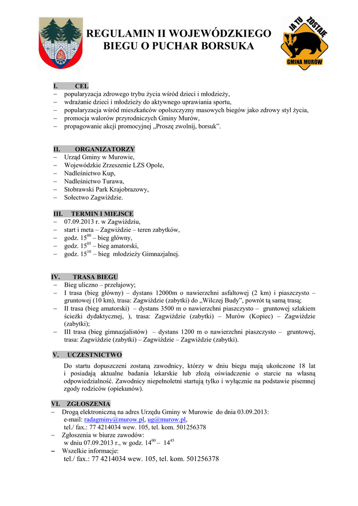 REGULAMIN II WOJEWÓDZKIEGO BIEGU O PUCHAR BORSUKA I. − − − − − CEL popularyzacja zdrowego trybu Ŝycia wśród dzieci i młodzieŜy, wdraŜanie dzieci i młodzieŜy do aktywnego uprawiania sportu, popularyzacja wśród mieszkańców opolszczyzny masowych biegów jako zdrowy styl Ŝycia, promocja walorów przyrodniczych Gminy Murów, propagowanie akcji promocyjnej „Proszę zwolnij, borsuk”. II. − − − − − − ORGANIZATORZY Urząd Gminy w Murowie, Wojewódzkie Zrzeszenie LZS Opole, Nadleśnictwo Kup, Nadleśnictwo Turawa, Stobrawski Park Krajobrazowy, Sołectwo Zagwiździe. III. TERMIN I MIEJSCE − 07.09.2013 r. w Zagwiździu, − start i meta – Zagwiździe – teren zabytków, − godz. 1500 – bieg główny, − godz. 1505 – bieg amatorski, − godz. 1510 – bieg młodzieŜy Gimnazjalnej. IV. TRASA BIEGU − Bieg uliczno – przełajowy; − I trasa (bieg główny) – dystans 12000m o nawierzchni asfaltowej (2 km) i piaszczysto – gruntowej (10 km), trasa: Zagwiździe (zabytki) do „Wilczej Budy”, powrót tą samą trasą; − II trasa (bieg amatorski) – dystans 3500 m o nawierzchni piaszczysto – gruntowej szlakiem ścieŜki dydaktycznej, ), trasa: Zagwiździe (zabytki) – Murów (Kopiec) – Zagwiździe (zabytki); − III trasa (bieg gimnazjalistów) – dystans 1200 m o nawierzchni piaszczysto – gruntowej, trasa: Zagwiździe (zabytki) – Zagwiździe – Zagwiździe (zabytki). V. UCZESTNICTWO Do startu dopuszczeni zostaną zawodnicy, którzy w dniu biegu mają ukończone 18 lat i posiadają aktualne badania lekarskie lub złoŜą oświadczenie o starcie na własną odpowiedzialność. Zawodnicy niepełnoletni startują tylko i wyłącznie na podstawie pisemnej zgody rodziców (opiekunów). VI. ZGŁOSZENIA − Drogą elektroniczną na adres Urzędu Gminy w Murowie do dnia 03.09.2013: e-mail: [email protected], [email protected], tel./ fax.: 77 4214034 wew. 105, tel. kom. 501256378 − Zgłoszenia w biurze zawodów: w dniu 07.09.2013 r., w godz. 1400 – 1445 − Wszelkie informacje: tel./ fax.: 77 4214034 wew. 105, tel. kom. 501256378 VII. KLASYFIKACJA − generalna męŜczyzn: 12000 m − kat. M wiek: 18 – 35 lat − kat. M wiek: 36 – 55 lat − kat. M wiek: powyŜej 55 lat – generalna kobiet: 12000 m – kat. K wiek: 18 – 35 lat – kat. K wiek: 36 – 55 lat – kat. M wiek: powyŜej 55 lat − ogólna: 3500 m − kat. M wiek: 18 –50 lat − kat. M wiek: powyŜej 50 lat – ogólna: 3500 m – kat. K wiek: 18 –50 lat – kat. K wiek: powyŜej 50 lat − 1200 m – młodzieŜ gimnazjalna VIII. NAGRODY − klasyfikacja generalna: MęŜczyzn I miejsce Puchar + Bon* o wartości 300,00 PLN II miejsce Puchar + „ 200,00 PLN III miejsce Puchar + „ 150,00 PLN − klasyfikacja generalna: Kobiet I miejsce Puchar + Bon o wartości 300,00 PLN II miejsce Puchar + „ 200,00 PLN III miejsce Puchar + „ 150,00 PLN − − − − − puchar dla najstarszego uczestnika, w kategoriach wiekowych przewidziane są statuetki, młodzieŜ gimnazjalna – I, II, III miejsce: puchar i nagrody rzeczowe, pierwszych 60 zapisanych uczestników otrzyma medal pamiątkowy oraz koszulkę z logo borsuka, dla wszystkich uczestników inne pamiątki okolicznościowe, * bon do zrealizowania w sklepie sportowym. IX. SPRAWY FINANSOWE − koszty organizacyjne ponoszą organizatorzy, − koszty osobowe uczestnicy lub jednostki delegujące. − − − − − − − − − − − − − X. POSTANOWIENIA KOŃCOWE ostateczne interpretacje Regulaminu naleŜą do organizatorów, impreza odbędzie się bez względu na warunki atmosferyczne, odbiór numeru startowego jest równoznaczny z akceptacją Regulaminu biegu, uczestnicy startują w koszulkach organizatora (do wyczerpania), zawodnik ponosi pełną odpowiedzialność za własne działania i zachowanie stosowne do przepisów ruchu drogowego oraz kodeksu cywilnego, bieg odbywa się przy ograniczonym ruchu drogowym, imprezy towarzyszące: biegi dzieci i młodzieŜy, festyn rekreacyjny, gastronomia oraz inne atrakcje, ogłoszenie wyników i rozdanie nagród po zakończeniu biegu głównego, kategoria jest uznana jeśli wystartuje min. 5 zawodników, biuro zawodów: Zagwiździe zabytki (start i meta), zaplecze sanitarne, na trasie będą ustawione punkty z niegazowaną wodą, zapewniona pomoc medyczna. ORGANIZATOR