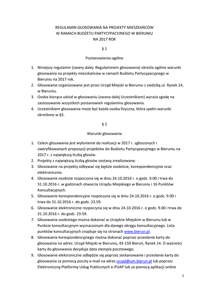 REGULAMIN GŁOSOWANIA NA PROJEKTY MIESZKAŃCÓW W RAMACH BUDŻETU PARTYCYPACYJNEGO W BIERUNIU NA 2017 ROK §1 Postanowienia ogólne 1. Niniejszy regulamin (zwany dalej: Regulaminem głosowania) określa ogólne warunki głosowania na projekty mieszkańców w ramach Budżetu Partycypacyjnego w Bieruniu na 2017 rok. 2. Głosowanie organizowane jest przez Urząd Miejski w Bieruniu z siedzibą ul. Rynek 14, w Bieruniu. 3. Osoba biorąca udział w głosowaniu (zwana dalej Uczestnikiem) wyraża zgodę na zastosowanie wszystkich postanowień regulaminu głosowania. 4. Uczestnikiem głosowania może być każda osoba fizyczna, która spełni warunki określone w §3. §2 Warunki głosowania 1. Celem głosowania jest wyłonienie do realizacji w 2017 r. zgłoszonych i zweryfikowanych propozycji projektów do Budżetu Partycypacyjnego w Bieruniu na 2017 r. z największą liczbą głosów. 2. Projekty z największą liczbą głosów zostaną zrealizowane. 3. Głosowanie na projekty odbywać się będzie osobiście, korespondencyjnie oraz elektronicznie. 4. Głosowanie osobiste rozpoczyna się w dniu 24.10.2016 r. o godz. 9.00 i trwa do 31.10.2016 r. w godzinach otwarcia Urzędu Miejskiego w Bieruniu i 16 Punktów Konsultacyjnych. 5. Głosowanie korespondencyjne rozpoczyna się w dniu 24.10.2016 r. o godz. 9.00 i trwa do 31.10.2016 r. do godz. 23.59. 6. Głosowanie elektroniczne rozpoczyna się w dniu 24.10.2016 r. o godz. 9.00 i trwa do 31.10.2016 r. do godz. 23:59. 7. Głosowania osobistego można dokonać w Urzędzie Miejskim w Bieruniu lub w Punkcie konsultacyjnym wyznaczonym dla danego okręgu konsultacyjnego. Lista punktów konsultacyjnych znajduje się na stronach www.bierun.pl. 8. Głosowania korespondencyjnego można dokonać poprzez przesłanie karty do głosowania na adres: Urząd Miejski w Bieruniu, 43-150 Bieruń, Rynek 14. O ważności karty do głosowania decyduje data stempla pocztowego. 9. Głosowanie elektroniczne odbędzie się poprzez zeskanowanie i przesłanie karty do głosowania za pomocą poczty e-mail na adres [email protected] lub poprzez Elektroniczną Platformę Usług Publicznych e-PUAP lub za pomocą aplikacji online 1 uruchomionej przez Organizatora i umieszczonej na stronie www.bierun.pl w dniu rozpoczęcia głosowania o godz. 9.00. 10. Formularze do głosowania osobistego/korespondencyjnego można pobrać w kancelarii Urzędu Miejskiego w Bieruniu, Punktach Konsultacyjnych oraz na stronie www.bierun.pl (każdy okręg konsultacyjny ma własny wzór formularza). §3 Zasady głosowania 1. Głosować mogą osoby zamieszkałe w Bieruniu, które w dniu oddania głosu ukończyły 16 lat. 2. Aby zagłosować osobiście lub korespondencyjnie należy: - wypełnić formularz głosowania podając następujące dane: Imię i Nazwisko, Adres Zamieszkania, własny numer PESEL, własnoręczny podpis; - zaakceptować Regulamin głosowania oraz wyrazić zgodę na przetwarzanie swoich danych osobowych przez Organizatora w celu niezbędnym do przeprowadzenia głosowania, zgodnie z ustawą z dnia 29.08.1997 r. o ochronie danych osobowych (Dz.U. z 2016 r. poz. 922); - zaznaczyć projekty, na które mieszkaniec chce oddać swój głos z uwzględnieniem punktacji dla poszczególnych projektów; - złożyć formularz w dowolnym Punkcie Konsultacyjnym lub wysłać na adres : Urząd Miejski w Bieruniu, ul. Rynek 14, 43-150 Bieruń z dopiskiem „Budżet Partycypacyjny na 2017 r.” 3. Aby zagłosować internetowo należy wejść na stronę www.bierun.pl i skorzystać z umieszczonej tam platformy do głosowania. 4. W przypadku głosowania korespondencyjnego o ważności głosu decyduje data stempla pocztowego. 5. Każda mieszkaniec okręgu konsultacyjnego może głosować wyłącznie raz. W przypadku zagłosowania w dwóch lub więcej okręgach konsultacyjnych lub poprzez oddanie głosu dwa razy w danym okręgu, głosy te uznaje się za nieważne. 6. W przypadku nieczytelnie wypełnionych formularzy papierowych uniemożliwiających wprowadzenia danych do systemu oraz w przypadku błędnych danych w formularzu papierowym (np. nieprawidłowy adres zamieszkania, nieprawidłowy numer PESEL, projekty z niewłaściwego okręgu konsultacyjnego, zbyt duża liczba przyznanych punktów) głos będzie uznany za nieważny. 7. Wybierać można jedynie projekty należące do okręgu, którego jest się mieszkańcem. 8. Głosującemu przysługuje 10 punktów, które może dowolnie rozdzielić pomiędzy projekty znajdujące się na liście. 9. Możliwe jest oddanie całej puli punktów na jeden projekt. 2 10. W dniach 24.-31.10.2016 r. w godzinach pracy Urzędu Miejskiego w Bieruniu oraz w godzinach: 15.00-20.00 uruchomiona zostanie infolinia dotycząca głosowania pod numerami telefonów: 32 324 24 18; 662 783 142. 11. W razie problemów z oddaniem głosu poprzez platformę internetową prosimy o kontakt pod adres mailowy: [email protected] §4 Weryfikacja głosowania 1. Nad prawidłowym przebiegiem głosowania czuwać będą oddelegowani pracownicy Urzędu Miejskiego zajmujący się Budżetem Partycypacyjnym. Weryfikacja poprawności oddanych przez Uczestników głosów będzie miała miejsce w trakcie trwania głosowania oraz po jego zakończeniu. 2. Weryfikacja poprawności głosowania będzie przebiegała na podstawie: - imienia i nazwiska; - adresu zamieszkania; - numeru PESEL. §5 Przedstawienie wyników głosowania 1. Po zakończonym głosowaniu, zostanie przygotowany protokół z głosowania, który zostanie zamieszczony do publicznej wiadomości na stronie www.bierun.pl. 3