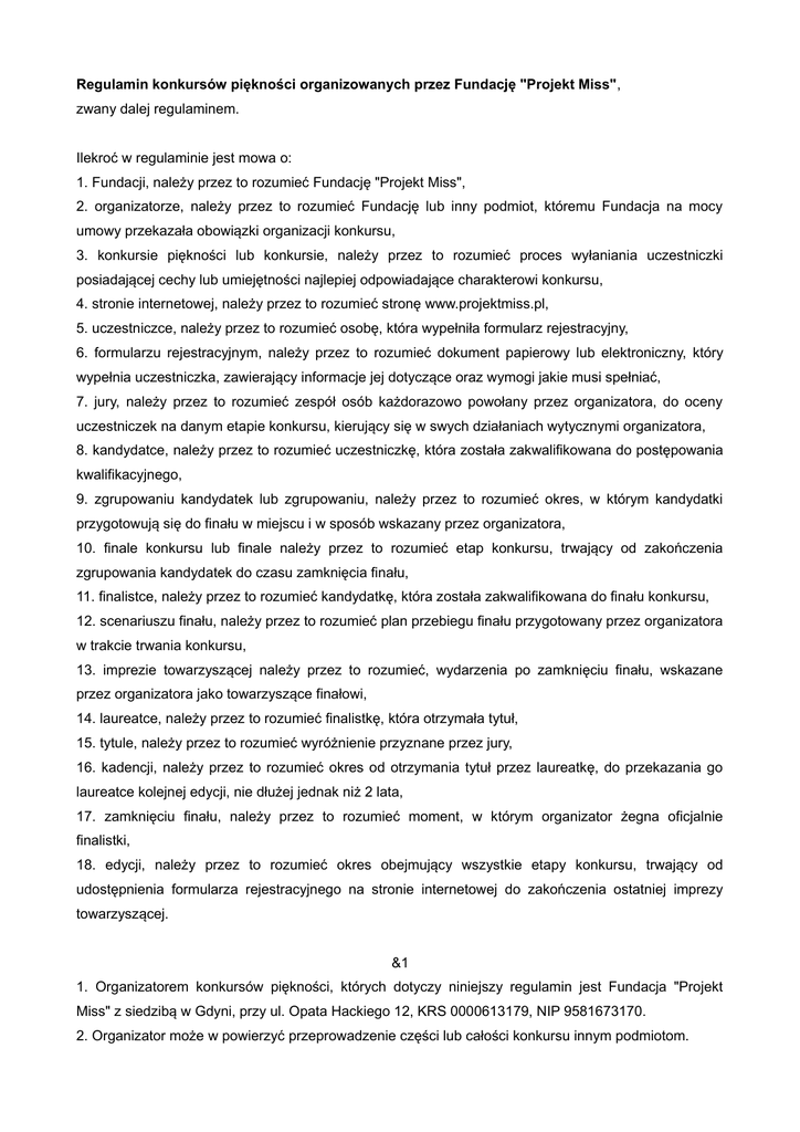 Regulamin konkursów piękności organizowanych przez Fundację "Projekt Miss", zwany dalej regulaminem. Ilekroć w regulaminie jest mowa o: 1. Fundacji, należy przez to rozumieć Fundację "Projekt Miss", 2. organizatorze, należy przez to rozumieć Fundację lub inny podmiot, któremu Fundacja na mocy umowy przekazała obowiązki organizacji konkursu, 3. konkursie piękności lub konkursie, należy przez to rozumieć proces wyłaniania uczestniczki posiadającej cechy lub umiejętności najlepiej odpowiadające charakterowi konkursu, 4. stronie internetowej, należy przez to rozumieć stronę www.projektmiss.pl, 5. uczestniczce, należy przez to rozumieć osobę, która wypełniła formularz rejestracyjny, 6. formularzu rejestracyjnym, należy przez to rozumieć dokument papierowy lub elektroniczny, który wypełnia uczestniczka, zawierający informacje jej dotyczące oraz wymogi jakie musi spełniać, 7. jury, należy przez to rozumieć zespół osób każdorazowo powołany przez organizatora, do oceny uczestniczek na danym etapie konkursu, kierujący się w swych działaniach wytycznymi organizatora, 8. kandydatce, należy przez to rozumieć uczestniczkę, która została zakwalifikowana do postępowania kwalifikacyjnego, 9. zgrupowaniu kandydatek lub zgrupowaniu, należy przez to rozumieć okres, w którym kandydatki przygotowują się do finału w miejscu i w sposób wskazany przez organizatora, 10. finale konkursu lub finale należy przez to rozumieć etap konkursu, trwający od zakończenia zgrupowania kandydatek do czasu zamknięcia finału, 11. finalistce, należy przez to rozumieć kandydatkę, która została zakwalifikowana do finału konkursu, 12. scenariuszu finału, należy przez to rozumieć plan przebiegu finału przygotowany przez organizatora w trakcie trwania konkursu, 13. imprezie towarzyszącej należy przez to rozumieć, wydarzenia po zamknięciu finału, wskazane przez organizatora jako towarzyszące finałowi, 14. laureatce, należy przez to rozumieć finalistkę, która otrzymała tytuł, 15. tytule, należy przez to rozumieć wyróżnienie przyznane przez jury, 16. kadencji, należy przez to rozumieć okres od otrzymania tytuł przez laureatkę, do przekazania go laureatce kolejnej edycji, nie dłużej jednak niż 2 lata, 17. zamknięciu finału, należy przez to rozumieć moment, w którym organizator żegna oficjalnie finalistki, 18. edycji, należy przez to rozumieć okres obejmujący wszystkie etapy konkursu, trwający od udostępnienia formularza rejestracyjnego na stronie internetowej do zakończenia ostatniej imprezy towarzyszącej. &1 1. Organizatorem konkursów piękności, których dotyczy niniejszy regulamin jest Fundacja "Projekt Miss" z siedzibą w Gdyni, przy ul. Opata Hackiego 12, KRS 0000613179, NIP 9581673170. 2. Organizator może w powierzyć przeprowadzenie części lub całości konkursu innym podmiotom. 3. Konkurs może posiadać własne przepisy szczegółowe, podane na stronie internetowej. &2 1. Fundacja organizuje konkursy piękności w celu realizacji swoich celów statutowych. 2. Fundacja dołoży wszelkich starań aby organizowane konkursy piękności były prowadzone w sposób profesjonalny, a uczestniczki czuły się komfortowo w trakcie ich trwania. &3 1. Konkurs przebiega w etapach wymienionych w niniejszym regulaminie. Organizator może w trakcie trwania konkursu zadecydować o przeprowadzeniu dodatkowego etapu lub o rezygnacji z przeprowadzenia któregoś z etapów o czym powiadomi na stronie internetowej. 2. Konkurs może mieć kilka edycji. 3. Termin, każdego etapu podawany jest na stronie internetowej. Termin może ulec zmianie na 7 dni przed jego datą, o czym organizator powiadomi poprzez publikację informacji na stronie internetowej. &4 1. W konkursie mogą brać udział osoby, które wypełnią formularz rejestracyjny konkursu i spełniają wymogi w nim przewidziane. 2. W szczególności organizator może wymagać spełnienia następujących kryteriów: • posiadania danych cech fizycznych lub osobowościowych, • bycia stanu wolnego i nie bycia rozwódką lub wdową, • nieposiadania potomstwa, • posiadania obywatelstwa polskiego, • ukończenia lub nieukończenia danego wieku, • bycia niekaraną, • nie posiadania widocznych tatuaży. 3. Formularz rejestracyjny dostępny jest w siedzibie Fundacji lub na stronie internetowej. 4. Przed dopuszczeniem do konkursu uczestniczka umożliwi organizatorowi wgląd do dokumentu tożsamości, w celu weryfikacji danych z formularza rejestracyjnego. &5 1. Organizator może nie dopuścić osoby do uczestniczenia w konkursie lub wykluczyć uczestniczkę na każdym etapie konkursu, jeśli: • dane zawarte w formularzu rejestracyjnym są niezgodne z prawdą, • postępuje ona niezgodnie z regulaminem, • nie posiada cech lub umiejętności koniecznych ze względu na charakter konkursu. 2. Organizator ma prawo zakończyć konkurs w przypadku małej ilości uczestniczek lub braku finansowania. &6 1. Uczestniczka przystępując do konkursu zobowiązuje się do przestrzegania postanowień niniejszego regulaminu oraz do wypełniania poleceń organizatora w zakresie uczestnictwa w konkursie. 2. Uczestniczka zobowiązuje się do uczestnictwa we wszystkich etapach konkursu, do których została zakwalifikowana. 3. Uczestniczka zobowiązuje się do zachowania w tajemnicy wszelkich informacji o przebiegu konkursu. 4. Uczestniczka współpracuje z przedstawicielami organizatora oraz innymi uczestniczkami w celu osiągnięcia jak najlepszego efektu. 5. Uczestniczka przekazuje organizatorowi nieograniczone prawo do posługiwania się jej wizerunkiem, w szczególności do wykorzystywania zdjęć i nagrań pozyskanych podczas trwania konkursu. &7 1. Organizator może zobowiązać uczestniczkę do podpisania umowy określającej warunki współpracy w trakcie trwania konkursu lub po jego zakończeniu. 2. Umowa przekazuje organizatorowi prawo do wykorzystywania wizerunku uczestniczki, zob