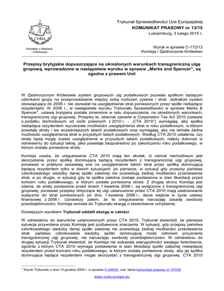 Trybunał Sprawiedliwości Unii Europejskiej KOMUNIKAT PRASOWY nr 13/15 Luksemburg, 3 lutego 2015 r. Wyrok w sprawie C-172/13 Komisja / Zjednoczone Królestwo Kontakty z Mediami i Informacja Przepisy brytyjskie dopuszczające na określonych warunkach transgraniczną ulgę grupową, wprowadzone w następstwie wyroku w sprawie „Marks and Spencer”, są zgodne z prawem Unii W Zjednoczonym Królestwie system grupowych ulg podatkowych pozwala spółkom będącym członkami grupy na przeprowadzanie między sobą rozliczeń zysków i strat. Jednakże system obowiązujący do 2006 r. nie zezwalał na uwzględnienie strat poniesionych przez spółki niebędące rezydentami. W 2006 r., w następstwie wyroku Trybunału Sprawiedliwości w sprawie Marks & Spencer1, ustawa brytyjska została zmieniona w celu dopuszczenia, na określonych warunkach, transgranicznej ulgi grupowej. Przepisy te, obecnie zawarte w Corporation Tax Act 2010 (ustawie o podatku dochodowym od osób prawnych z 2010 r. - „CTA 2010”) wymagają, aby spółka niebędąca rezydentem wyczerpała możliwości uwzględnienia strat w roku podatkowym, w którym powstały straty i we wcześniejszych latach podatkowych oraz wymagają, aby nie istniała żadna możliwość uwzględnienia strat w przyszłych latach podatkowych. Według CTA 2010 ustalenia, czy straty będą mogły zostać uwzględnione w przyszłych latach podatkowych, należy dokonać w odniesieniu do sytuacji takiej, jaka powstaje bezpośrednio po zakończeniu roku podatkowego, w którym zostały poniesione straty. Komisja uważa, że uregulowania CTA 2010 mają ten skutek, iż niemal niemożliwym jest skorzystanie przez spółkę dominującą będącą rezydentem z transgranicznej ulgi grupowej, ponieważ w praktyce zezwalają one na uwzględnienie takich strat przez spółkę dominującą będącą rezydentem tylko w dwóch sytuacjach: po pierwsze, w sytuacji gdy przepisy państwa członkowskiego siedziby danej spółki zależnej nie przewidują żadnej możliwości przeniesienia strat, a po drugie, w sytuacji gdy ta spółka zależna zostaje postawiona w stan likwidacji przed końcem roku podatkowego, w którym została poniesiona strata. Z drugiej strony Komisja jest zdania, że straty poniesione przed dniem 1 kwietnia 2006 r. są wyłączone z transgranicznej ulgi grupowej, ponieważ przepisy dotyczące tej ulgi ustanowione przez CTA 2010 mają zastosowanie wyłącznie do strat poniesionych po dniu 1 kwietnia 2006 r., dacie wejścia w życie ustawy finansowej z 2006 r. Uznawszy zatem, że te uregulowania naruszają zasadę swobody przedsiębiorczości, Komisja wniosła do Trybunału skargę o stwierdzenie uchybienia. Dzisiejszym wyrokiem Trybunał oddalił skargę w całości. W odniesieniu do warunków ustanowionych przez CTA 2010, Trybunał stwierdził, że pierwsza sytuacja przywołana przez Komisję jest pozbawiona znaczenia. W sytuacji, gdy przepisy państwa członkowskiego siedziby danej spółki zależnej nie przewidują żadnej możliwości przeniesienia strat, państwo członkowskie siedziby spółki dominującej może odmówić przyznania transgranicznej ulgi grupowej, nie naruszając swobody przedsiębiorczości. W odniesieniu do drugiej sytuacji Trybunał stwierdził, że Komisja nie wykazała wiarygodności swojego twierdzenia, zgodnie z którym CTA 2010 wymaga postawienia w stan likwidacji spółki zależnej niebędącej rezydentem przed końcem roku podatkowego, w którym zostały poniesione straty, aby jej spółka dominująca będąca rezydentem mogła skorzystać z transgranicznej ulgi grupowej. CTA 2010 1 Wyrok Trybunału z dnia 13 grudnia 2005 r. w sprawie C-446/03, zob. także komunikat prasowy nr 107/05. www.curia.europa.eu w żaden sposób nie wymaga bowiem postawienia w stan likwidacji danej spółki zależnej przed końcem roku podatkowego, w którym zostały poniesione straty. Trybunał przypomniał ponadto, że ostateczny charakter – w rozumieniu wyroku Marks & Spencer – strat poniesionych przez spółkę zależną niebędącą rezydentem można stwierdzić tylko wtedy, gdy nie osiąga ona już przychodów w państwie członkowskim siedziby. Jak długo bowiem ta spółka zależna nadal osiąga przychody – nawet nieznaczne – istnieje możliwość, że poniesione straty zostaną jeszcze zrekompensowane przyszłymi zyskami osiągniętymi w państwie członkowskim jej siedziby. Poprzez powołanie się na konkretny przykład spółki dominującej będącej rezydentem, która skorzystała z transgranicznej ulgi grupowej, Zjednoczone Królestwo potwierdziło, że ostateczny charakter strat poniesionych przez spółkę zależną niebędącą rezydentem może zostać wykazany, jeżeli bezpośrednio po zakończeniu roku podatkowego, w którym zostały poniesione straty, owa spółka zależna zaprzestała działalności gospodarczej i sprzedała lub pozbyła się wszystkich swoich aktywów przynoszących przychody. Odnośnie do możliwości skorzystania przez spółkę z transgranicznej ulgi grupowej za okres sprzed dnia 1 kwietnia 2006 r., Trybunał stwierdził, że Komisja nie wykazała istnienia sytuacji, w których transgraniczna ulga grupowa nie została przyznana w odniesieniu do strat poniesionych przed tą datą. UWAGA : Skarga o stwierdzenie uchybienia państwa członkowskiego jest kierowana przeciwko państwu członkowskiemu, które uchybiło zobowiązaniom wynikającym z prawa Unii, przez Komisję lub inne państwo członkowskie. Jeżeli Trybunał Sprawiedliwości stwierdzi uchybienie, państwo, którego to dotyczy, powinno jak najszybciej zastosować się do wyroku. Jeżeli Komisja uzna, że państwo członkowskie nie zastosowało się do wyroku, może wnieść nową skargę i domagać się sankcji finansowych. Jednak w sytuacji nieprzekazania Komisji krajowych środków transpozycji dyrektywy Trybunał Sprawiedliwości może, na jej wniosek, nakładać kary pieniężne już na etapie pierwszego wyroku. Dokument nieoficjalny, 