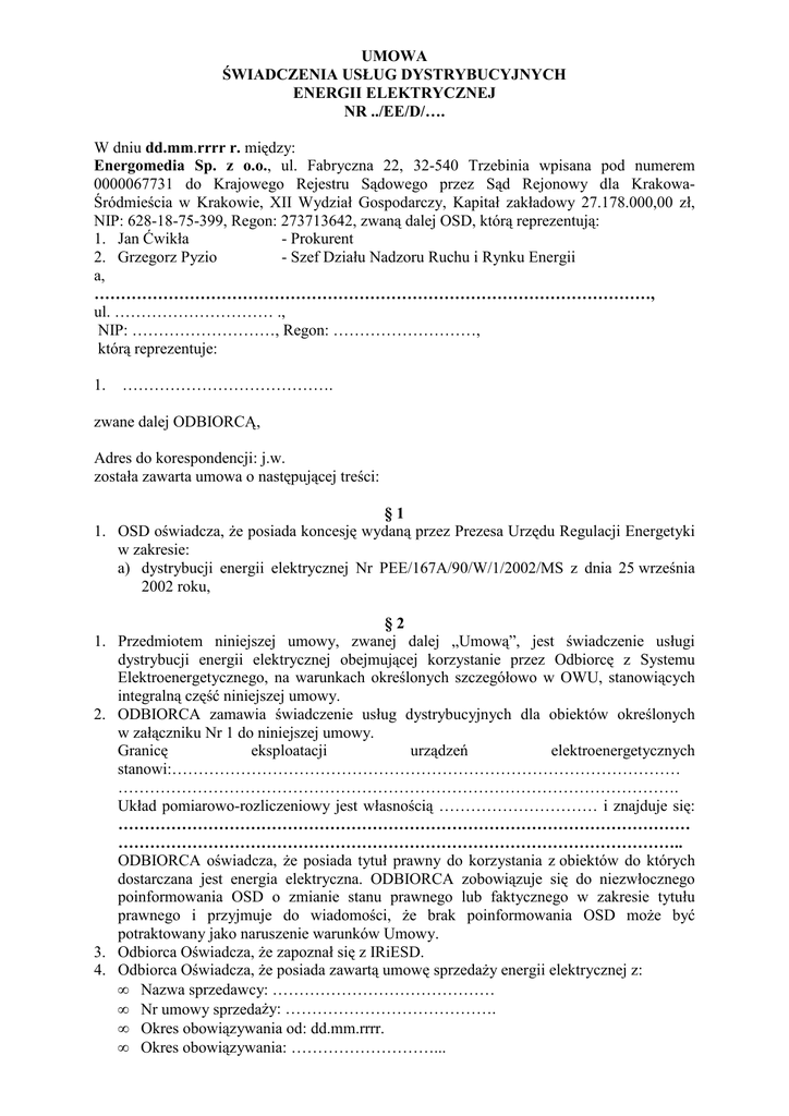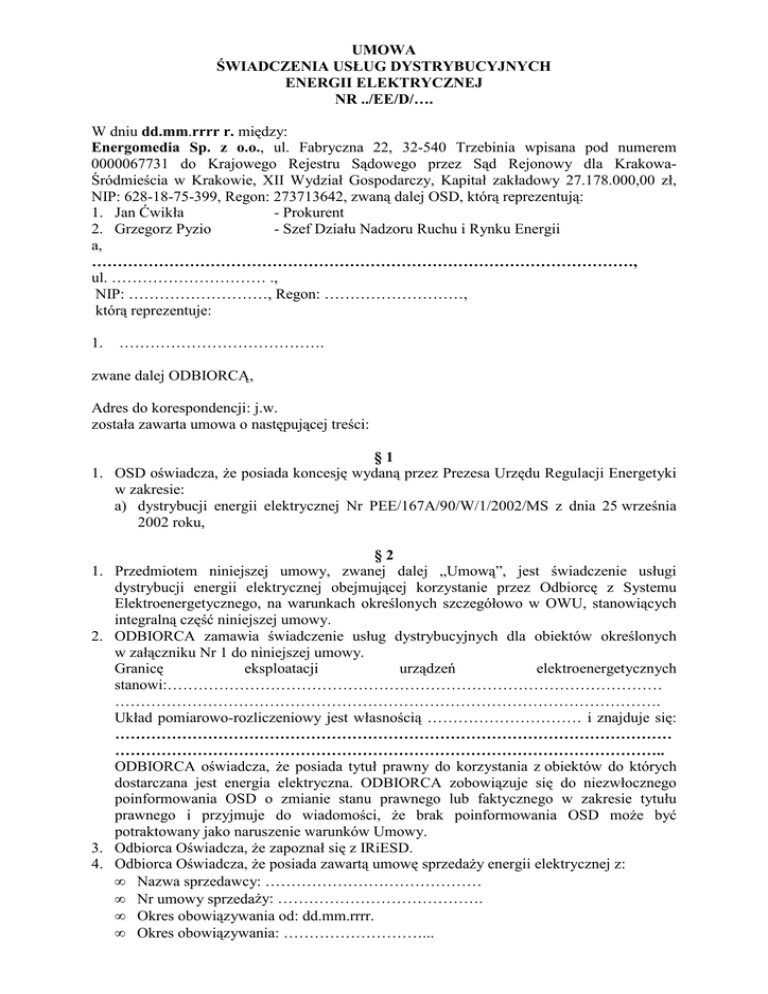 UMOWA ŚWIADCZENIA USŁUG DYSTRYBUCYJNYCH ENERGII ELEKTRYCZNEJ NR ../EE/D/…. W dniu dd.mm.rrrr r. między: Energomedia Sp. z o.o., ul. Fabryczna 22, 32-540 Trzebinia wpisana pod numerem 0000067731 do Krajowego Rejestru Sądowego przez Sąd Rejonowy dla KrakowaŚródmieścia w Krakowie, XII Wydział Gospodarczy, Kapitał zakładowy 27.178.000,00 zł, NIP: 628-18-75-399, Regon: 273713642, zwaną dalej OSD, którą reprezentują: 1. Jan Ćwikła - Prokurent 2. Grzegorz Pyzio - Szef Działu Nadzoru Ruchu i Rynku Energii a, ……………………………………………………………………………………………, ul. ………………………… ., NIP: ………………………, Regon: ………………………, którą reprezentuje: 1. …………………………………. zwane dalej ODBIORCĄ, Adres do korespondencji: j.w. została zawarta umowa o następującej treści: §1 1. OSD oświadcza, że posiada koncesję wydaną przez Prezesa Urzędu Regulacji Energetyki w zakresie: a) dystrybucji energii elektrycznej Nr PEE/167A/90/W/1/2002/MS z dnia 25 września 2002 roku, §2 1. Przedmiotem niniejszej umowy, zwanej dalej „Umową”, jest świadczenie usługi dystrybucji energii elektrycznej obejmującej korzystanie przez Odbiorcę z Systemu Elektroenergetycznego, na warunkach określonych szczegółowo w OWU, stanowiących integralną część niniejszej umowy. 2. ODBIORCA zamawia świadczenie usług dystrybucyjnych dla obiektów określonych w załączniku Nr 1 do niniejszej umowy. Granicę eksploatacji urządzeń elektroenergetycznych stanowi:…………………………………………………………………………………… ……………………………………………………………………………………………. Układ pomiarowo-rozliczeniowy jest własnością ………………………… i znajduje się: ……………………………………………………………………………………………… …………………………………………………………………………………………….. ODBIORCA oświadcza, że posiada tytuł prawny do korzystania z obiektów do których dostarczana jest energia elektryczna. ODBIORCA zobowiązuje się do niezwłocznego poinformowania OSD o zmianie stanu prawnego lub faktycznego w zakresie tytułu prawnego i przyjmuje do wiadomości, że brak poinformowania OSD może być potraktowany jako naruszenie warunków Umowy. 3. Odbiorca Oświadcza, że zapoznał się z IRiESD. 4. Odbiorca Oświadcza, że posiada zawartą umowę sprzedaży energii elektrycznej z: • Nazwa sprzedawcy: …………………………………… • Nr umowy sprzedaży: …………………………………. • Okres obowiązywania od: dd.mm.rrrr. • Okres obowiązywania: ………………………... • Nazwa URB: …………………………………… W przypadku zmiany sprzedawcy aktualizacja powyższych danych nie wymaga formy aneksu, a jedynie zgłoszenia do OSD zgodnie z IRiESD. 5. Odbiorca oświadcza, że instalacja w obiekcie jest w dobrym stanie, odpowiada wymaganiom technicznym określonych w przepisach i nie zawiera przeróbek umożliwiających nielegalny pobór energii elektrycznej. 6. Odbiorca oświadcza, że nie jest przedsiębiorstwem energetycznym przyłączonym do sieci OSD świadczącym usługi dystrybucji energii elektrycznej dla odbiorców przyłączonych do jego sieci korzystających z systemu energetycznego. Nie jest operatorem systemu dystrybucyjnego, przed podpisaniem Umowy otrzymał Taryfę OSD aktualną na dzień zawarcia Umowy oraz wyraża zgodę na udostępnianie przez OSD danych pomiarowych , wybranemu przez odbiorcę sprzedawcy oraz POB sprzedawcy. §3 1. ODBIORCA zalicza się do grupy taryfowej opłat za usługę dystrybucyjną: ……….. zgodnie z załącznikiem nr 1 do niniejszej umowy. 2. Odczyty wskazań układów pomiarowych będą dokonywane w okresach miesięcznych. 3. Rozliczenia między Stronami za usługi dystrybucyjne, dokonywane będą w oparciu o aktualną Taryfę OSD dla dystrybucji energii elektrycznej i wskazania układów pomiarowych. 4. ODBIORCA nie będzie obciążany opłatami za przekroczenie mocy umownej powstałe na skutek awarii w sieci OSD oraz uzgodnionych wyłączeń dla potrzeb OSD. 5. OSD ma prawo kontroli poboru mocy i zainstalowania urządzeń ograniczających pobór mocy do wielkości mocy umownej. §4 1. Umowa wchodzi w życia z dniem dd.mm.rrrr, nie wcześniej jednak niż w dniu podpisania umowy przez obie strony i obowiązuje na czas nieokreślony. 2. Integralną część niniejszej umowy stanowią: - „Ogólne warunki umowy sprzedaży energii elektrycznej i świadczenia usług dystrybucyjnych oraz umowy świadczenia usług dystrybucyjnych energii elektyrcznej (OWU); - taryfa cen i stawek opłat (dostępna na stronie internetowej OSD); - zapotrzebowania na moc i energię elektryczną (Załącznik Nr 1). 3. ODBIORCA oświadcza, iż zapoznał się Ogólnymi Warunkami Umowy, o których mowa w ust. 2. §5 Niniejszą umowę sporządzono w dwóch jednobrzmiących egzemplarzach po jednym dla każdej ze Stron. OSD ODBIORCA 2