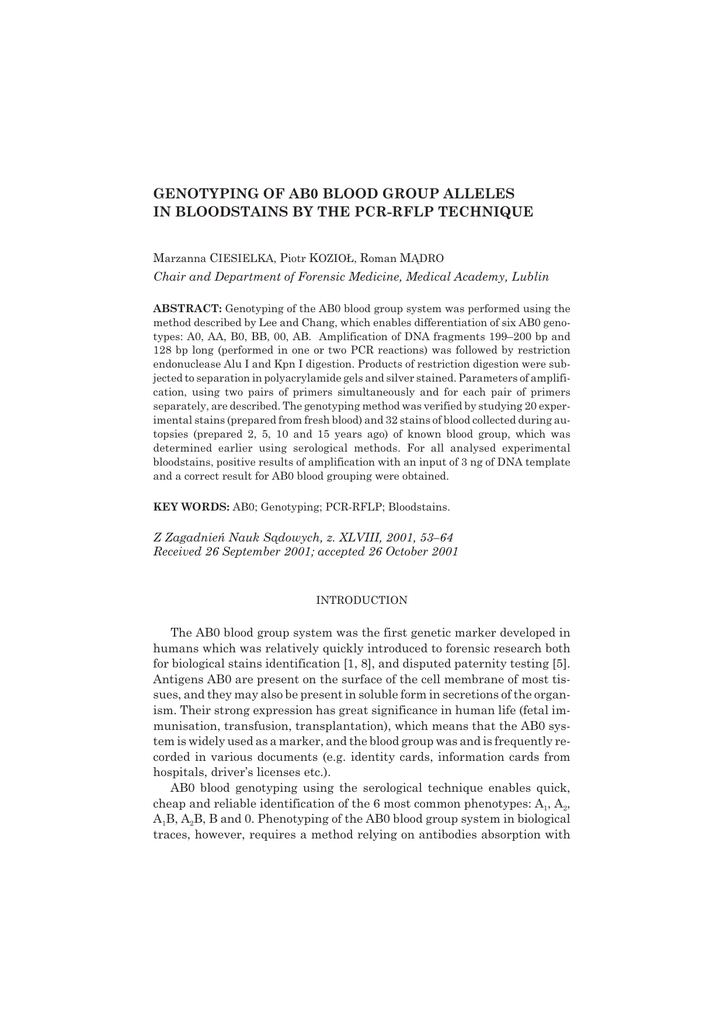 GENOTYPING OF AB0 BLOOD GROUP ALLELES IN BLOODSTAINS BY THE PCR-RFLP TECHNIQUE Marzanna CIESIELKA, Piotr KOZIO£, Roman M¥DRO Chair and Department of Forensic Medicine, Medical Academy, Lublin ABSTRACT: Genotyping of the AB0 blood group system was performed using the method described by Lee and Chang, which enables differentiation of six AB0 genotypes: A0, AA, B0, BB, 00, AB. Amplification of DNA fragments 199–200 bp and 128 bp long (performed in one or two PCR reactions) was followed by restriction endonuclease Alu I and Kpn I digestion. Products of restriction digestion were subjected to separation in polyacrylamide gels and silver stained. Parameters of amplification, using two pairs of primers simultaneously and for each pair of primers separately, are described. The genotyping method was verified by studying 20 experimental stains (prepared from fresh blood) and 32 stains of blood collected during autopsies (prepared 2, 5, 10 and 15 years ago) of known blood group, which was determined earlier using serological methods. For all analysed experimental bloodstains, positive results of amplification with an input of 3 ng of DNA template and a correct result for AB0 blood grouping were obtained. KEY WORDS: AB0; Genotyping; PCR-RFLP; Bloodstains. Z Zagadnieñ Nauk S¹dowych, z. XLVIII, 2001, 53–64 Received 26 September 2001; accepted 26 October 2001 INTRODUCTION The AB0 blood group system was the first genetic marker developed in humans which was relatively quickly introduced to forensic research both for biological stains identification [1, 8], and disputed paternity testing [5]. Antigens AB0 are present on the surface of the cell membrane of most tissues, and they may also be present in soluble form in secretions of the organism. Their strong expression has great significance in human life (fetal immunisation, transfusion, transplantation), which means that the AB0 system is widely used as a marker, and the blood group was and is frequently recorded in various documents (e.g. identity cards, information cards from hospitals, driver’s licenses etc.). AB0 blood genotyping using the serological technique enables quick, cheap and reliable identification of the 6 most common phenotypes: A1, A2, A1B, A2B, B and 0. Phenotyping of the AB0 blood group system in biological traces, however, requires a method relying on antibodies absorption with 54 P. Ciesielka, P. Kozio³, R. M¹dro agglutinogens, the results of which depend not only on the amount of glycolipid and glycoprotein antigens, but also on their degree of degradation. The presence of similar structures to these antigens on microorganisms is an additional problem. Consequently, there exists a possibility of unspecific absorption of specific antibodies, especially in the case of stains degraded by biological factors [2]. In 1990 Yamamoto et al. [11] cloned and sequenced cDNA of the genes of a1 ® 3N acetylgalactosaminyl-transferase and a1 ® 3 galactosyltransferase, which determine antigens A and B. They identified seven nucleotide substitutions (positions: 297, 526, 657, 703, 796, 803 and 930), resulting in four aminoacid substitutions in the catalytic domain of proteins, which enable differentiation of allele A from allele B. Allele A differs from allele 0 by a single deletion in position 261, which is responsible for the arising of the functionally inactive form of transferase 0 [11]. Allele A includes a few subtypes, of which the most frequent are A1 and A2. The coding sequence of transferase A2 differs from that of transferase A1 by nucleotide substitution in position 467 and deletion in position 1060 [12]. These individual DNA mutations can be detected by application of molecular biology methods and the PCR technique, which enables determination of the AB0 blood group in various tissues, from tiny amounts of even heavily degraded biological traces. The aim of this work was optimisation of PCR conditions for amplification of genes determining the AB0 blood group system and verification of the obtained results of genotyping by their comparison to previously obtained results using serological methods. Reliability and efficiency of the applied technique were also verified. MATERIALS AND METHODS Genotypes AB0 were identified in 52 experimental bloodstains, whose blood groups had been determined previously by the serological method. Twenty bloodstains were prepared from fresh blood in the year 2000, and 32 additional bloodstains – from blood taken from dead bodies (8 blood samples collected in years 1985, 1990, 1995 and 1998). Blood samples were chosen to represent various AB0 phenotypes. DNA was extracted with a kit intended for genomic DNA isolation from biological traces (A & A Biotechnology). The amount of extracted DNA was assessed by the dot-blot and hybridisation method with D17Z1 biotin marked probe, using the commercial kit Quantitation System, Gibco BRL, in accordance with the manufacturer’s directions. Amplification was carried out using PCR primers according to Lee and Chang [4]: Genotyping of AB0 blood group alleles ... 55 For DNA fragment 199 (or 200) bp: – primer 1: 5’ – CA CCG TTG AAG GAT GTC CTC – 3’, – primer 2: 5’ – AAT GTC CAC AGT CAC TCG CC – 3’, and for DNA fragment 128 bp: – primer 3: 5’ – TGG AGA TCC TGA CTC CGC TG – 3’ – primer 4: 5’ – GTA GAA ATC GCC TCG TCC TT – 3’. At the first stage of the study PCR conditions were established. In the process of optimisation of the PCR reaction, concentrations of template DNA in the range from 0.5 ng to 100 ng and primer concentrations in the range: 5, 10, 15, 20, 25, 30 pM were taken into account. Parameters of amplification were optimised for multiplex reaction (simultaneous amplification of both DNA fragments: 199–200 bp and 128 bp) and for singleplex amplifications. MgCl2 concentration was optimised only for the multiplex reaction in the range: 1.5 mM, 2 mM, 2.5 mM, 3 mM, 3.5 mM, 4 mM. In the case of singleplex reactions
