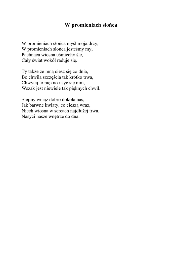 W promieniach słońca W promieniach słońca myśl moja drży, W promieniach słońca jesteśmy my, Pachnąca wiosna uśmiechy śle, Cały świat wokół raduje się. Ty także ze mną ciesz się co dnia, Bo chwila szczęścia tak krótko trwa, Chwytaj to piękno i syć się nim, Wszak jest niewiele tak pięknych chwil. Siejmy wciąż dobro dokoła nas, Jak barwne kwiaty, co cieszą wraz, Niech wiosna w sercach najdłużej trwa, Nasyci nasze wnętrze do dna.