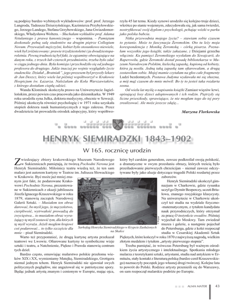 są podpisy bardzo wybitnych wykładowców: prof. prof. Jerzego Langroda, Tadeusza Dziurzyńskiego, Kazimierza Przybyłowskiego, Jerzego Landego, Stefana Grzybowskiego, Jana Gwiazdomorskiego, Władysława Woltera. – Słuchałam wykładów prof. Adama Vetulaniego z prawa kanonicznego – wspomina. – Pamiętam doskonale pełną salę studentów na drugim piętrze Collegium Novum. Przeważali mężczyźni, kobiet było stosunkowo niewiele, wiek był zróżnicowany: prawie trzydziestoletni i ja dwudziestoparoletnia. Pewną trudnością był fakt, że egzaminy obowiązujące na danym roku, z trzech lub czterech przedmiotów, trzeba było zdać w ciągu jednego dnia. Była komisja i przechodziło się od jednego profesora do drugiego. Jakże inaczej po wojnie wyglądało życie studenckie. Działał „Bratniak”, jego prezesem był przyszły lekarz dr Jan Deszcz, który wiele lat później współtworzył w Krakowie Hospicjum św. Łazarza. Należałam do Koła Warszawiaków, z którego dostałam ciepłą odzież. Wanda Klominek skończyła prawo na Uniwersytecie Jagiellońskim, przez pewien czas pracowała jako dziennikarka. W 1949 roku urodziła syna Julka, doktora medycyny, obecnie w Szwecji. Później ukończyła również psychologię i w 1971 roku uzyskała stopień doktora nauk humanistycznych z tego zakresu. Przez dwadzieścia lat prowadziła ośrodek adopcyjny, który współtwo- rzyła 45 lat temu. Kiedy synowi urodziło się kolejno troje dzieci, wkrótce po stanie wojennym, zdecydowała się, jak sama twierdzi, nostryfikować swój dyplom z psychologii, pchając wózki w parku jako polska babcia. Nitka przewodnia mojego życia? – stawiam sobie czasem to pytanie. Może to fascynacja Żeromskim. Oto tu leży moja korespondencja z Moniką Żeromską – córką pisarza. Poznałam wszystkie jego książki, także zakazane, z Dziejami grzechu włącznie. Ku pamięci Żeromskiego wysłałam do Szwajcarii, do Raperswilu, gdzie Żeromski dostał posadę bibliotekarza w Muzeum Narodowym Polskim, kielecką zapaskę, kupioną od kobiety, która ją nosiła. Jedną taką zapaskę tam ofiarowałam, a drugą zostawiłam sobie. Mojej mamie czytałam na głos całe fragmenty Ludzi bezdomnych. Postawa Judyma wydawała mi się słuszna, a mój mąż czasem do mnie mówił: Bo ty to jesteś taka rozdarta sosna. Od wielu lat myślę o napisaniu książki Zamiast więzów krwi, opisującej losy dzieci adoptowanych i ich rodzin. Piętrzyły się liczne przeszkody, sprawiające, że nie mogłam tego do tej pory zrealizować. Ale może jeszcze zdążę... Marzena Florkowska HENRYK SIEMIRADZKI 1843–1902 W 165. rocznicę urodzin Z A.Wojnar wiedzający zbiory krakowskiego Muzeum Narodowego który był carskim generałem, zawsze podkreślał swoją polskość, w Sukiennicach pamiętają, że twórcą Pochodni Nerona jest a dramatyczne w swym przesłaniu obrazy, których treścią było Henryk Siemiradzki. Miłośnicy teatru wiedzą też, że ten sam prześladowanie pierwszych chrześcijan – niemal zawsze odczymalarz jest autorem kurtyny w Teatrze im. Juliusza Słowackiego tywane były jako aluzje dotyczące tragedii Polski rozdartej przez w Krakowie. Być może już mniej znazaborców. nym jest fakt, że podarowane KrakoHenryk Siemiradzki ukończył gimwowi Pochodnie Nerona, prezentowanazjum w Charkowie, gdzie rysunku ne w Sukiennicach z okazji jubileuszu uczył go Dymitr Bezperczy, uczeń BriuJózefa Ignacego Kraszewskiego w roku łowa, znanego rosyjskiego klasycysty. 1879, stanowią zaczątek Narodowej Na uniwersytecie w Charkowie ukońGalerii Sztuki. – Musiałem ten obraz czył też studia na wydziale fizycznodarować, bo myśl jego, że męczeństwo, -matematycznym, z tytułem kandydata cierpliwość, wytrwałość prowadzą do nauk przyrodniczych, który otrzymał zwycięstwa... to musiałem obraz wyraza pracę O instynkcie owadów. Później żający tę myśl zostawić tym, dla których wyjechał do Moskwy. Tam zwiedzał tę myśl wyraża. Jeżeli mogłem krajowi muzea i galerie, a następnie pojechał coś podarować... to tylko szczęście dla Sarkofag Henryka Siemiradzkiego w Krypcie Zasłużonych do Petersburga, gdzie z kolei rozpoczął na Skałce mnie – pisał Siemiradzki. studia w Cesarskiej Akademii Sztuk Warto też przypomnieć, że drugą kurtynę artysta przekazał Pięknych, które kończył w roku 1870 z najwyższą nagrodą, wielkim teatrowi we Lwowie. Ofiarowane kurtyny to symboliczne wizje złotym medalem i tytułem „artysty pierwszego stopnia”. sztuki i teatru, a Natchnienie, Piękno i Prawda stanowią centrum Trzeba pamiętać, że wówczas Petersburg był ważnym ośrodtych dzieł. kiem życia artystycznego i intelektualnego. Spotkania młodego Bardzo często, omawiając malarstwo polskie przełomu wie- malarza z teoretykami sztuki, artystami, studia nad antykiem w Erków XIX i XX, wymieniamy Matejkę, Siemiradzkiego, Grottgera mitażu, stały kontakt z literaturą polską (bardzo cenił Kraszewskieniemal jednym tchem. Henryk Siemiradzki nie ujawniał swych go) naznaczyły początek jego własnej drogi twórczej. Kolejne lata politycznych poglądów, nie angażował się w patriotyczne spory. to powrót do Polski. Rodzice artysty przenieśli się do Warszawy, Będąc jednak artystą znanym i cenionym w Europie, mając ojca, on sam rozpoczął malarskie podróże po Europie. ALMA MATER 43 Rozpoczął je od Krakowa, gdzie potem często powracał, pojechał do Monachium, Drezna, a przez Innsbruck, Weronę, Wenecję i Florencję dotarł do Rzymu. Z miastem tym Henryk Siemiradzki związał swe życie. Trudno w krótkim tekście opisać życie artysty w czasie, gdy jego dzieła przynosiły mu nie tylko wielką popularność i sławę, ale także liczne nagrody i ogromny prestiż w twórczym środowisku Europy. Wkrótce po wybudowaniu willi w Rzymie Henryk Siemiradzki nabył w Strzałkowie, nieopodal Częstochowy, nieduży dworek. Często tam bywał, spędzał wakacje z 