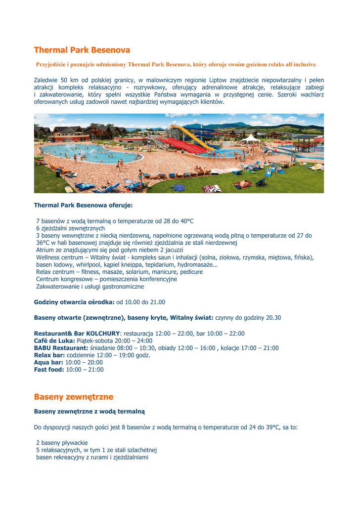 Thermal Park Besenova Przyjedźcie i poznajcie odmieniony Thermal Park Besenova, który oferuje swoim gościom relaks all inclusive. Zaledwie 50 km od polskiej granicy, w malowniczym regionie Liptow znajdziecie niepowtarzalny i pełen atrakcji kompleks relaksacyjno - rozrywkowy, oferujący adrenalinowe atrakcje, relaksujące zabiegi i zakwaterowanie, który spełni wszystkie Państwa wymagania w przystępnej cenie. Szeroki wachlarz oferowanych usług zadowoli nawet najbardziej wymagających klientów. Thermal Park Besenowa oferuje: 7 basenów z wodą termalną o temperaturze od 28 do 40°C 6 zjeżdżalni zewnętrznych 3 baseny wewnętrzne z niecką nierdzewną, napełnione ogrzewaną wodą pitną o temperaturze od 27 do 36°C w hali basenowej znajduje się również zjeżdżalnia ze stali nierdzewnej Atrium ze znajdującymi się pod gołym niebem 2 jacuzzi Wellness centrum – Witalny świat - kompleks saun i inhalacji (solna, ziołowa, rzymska, miętowa, fińska), basen lodowy, whirlpool, kąpiel kneippa, tepidarium, hydromasaże... Relax centrum – fitness, masaże, solarium, manicure, pedicure Centrum kongresowe – pomieszczenia konferencyjne Zakwaterowanie i usługi gastronomiczne Godziny otwarcia ośrodka: od 10.00 do 21.00 Baseny otwarte (zewnętrzne), baseny kryte, Witalny świat: czynny do godziny 20.30 Restaurant& Bar KOLCHURY: restauracja 12:00 – 22:00, bar 10:00 – 22:00 Café de Luka: Piątek-sobota 20:00 – 24:00 BABU Restaurant: śniadanie 08:00 – 10:30, obiady 12:00 – 16:00 , kolacje 17:00 – 21:00 Relax bar: codziennie 12:00 – 19:00 godz. Aqua bar: 10:00 – 20:00 Fast food: 10:00 – 21:00 Baseny zewnętrzne Baseny zewnętrzne z wodą termalną Do dyspozycji naszych gości jest 8 basenów z wodą termalną o temperaturze od 24 do 39°C, sa to: 2 baseny pływackie 5 relaksacyjnych, w tym 1 ze stali szlachetnej basen rekreacyjny z rurami i zjeżdżalniami 7 basenów otwartych jest całorocznie. W basenach relaksacyjnych znajdują się różnego rodzaje atrakcje - podwodne ławy z systemem masaży , wodne fontanny , wodny grzyb, wodna czasza. NOWOŚĆ 2008 ROKU 5 nowych basenów zewnętrznych z materiału antykorozyjnego z przejrzystą ,ogrzewaną wodą, o temperaturze od 24 do 37°C. Baseny czynne są w okresie letnim – dla wszystkich naszych gości bez względu na wiek. Czeka tu na Państwa: 25m basen pływacki - powierzchnia 336 m2, z wyznaczonymi torami, słupkami startowymi oraz liniami nawrotowymi basen relaksacyjny - powierzchnia 600m2, na jego obwodzie znajduje się ławy i leżanki z systemem masaży wodnych basen dla dzieci - powierzchnia 100 m2, atrakcje - fontanny w kształcie grzyba i różnorodnych zwierzątek „Dzika rzeka“ - powierzchnia 125 m2, z 9 specjalnymi urządzeniamiwytwarzającymi prąd wodny, który unosi pływających z prędkością 1,6 - metrów na sekundę adrenalinowy basen ze zjeżdżalniami ( traficie tu zjeżdżając trzytorową zjeżdżalnią lub żółtą albo niebieską rurą) Baseny wewnętrzne Godne polecenia są całoroczne baseny wewnętrzne udostępnione w 2006 roku odpowiednie są dla wszystkich bez względu na wiek. Wszystkie baseny wewnątrz wykonane zostały ze stali nierdzewnej, napełnione są wodą pitną o temperaturze 27 - 39 stopni Celsjusza. Znajdziecie tu Państwo: podświetlany basen z miejscami siedzącymi i mnóstwem atrakcji: podwodną ławą, ławą powietrzną, natryskami masującymi, miotaczami wodnymi, urządzeniem wytwarzającym bąbelki, temperatura wody w basenie to 36 - 40 stopni Celsjusza duży basen pływacki, a w nim: rurę ze stali nierdzewnej, miotacze wodne, natryski basen dla dzieci – zjeżdżalnia, grzybek wodny, jeż wodny atrium z whirlpoolem ze stali nierdzewnej pod gołym niebem również czynne przez cały rok