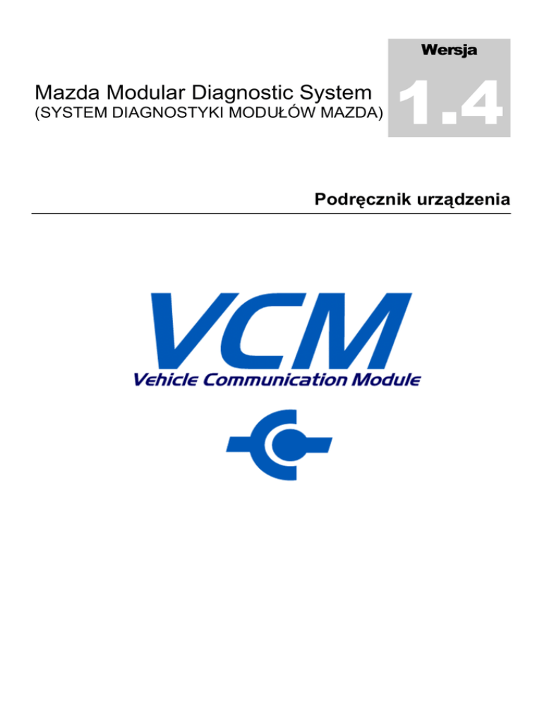 Wersja Mazda Modular Diagnostic System (SYSTEM DIAGNOSTYKI MODUŁÓW MAZDA) 1.4 Podręcznik urządzenia Podręcznik urządzenia VCM Znaki handlowe Snap-on to zarejestrowany znak handlowy Snap-on Technologies, Inc. (USA i Kanada). Prawa autorskie Podręcznik urządzenia VCM ©2005 Mazda Motor Corporation. Wszelkie prawa zastrzeżone Informacje, specyfikacje i ilustracje, zawarte w niniejszym podręczniku oparte są na materiale aktualnym w momencie druku. Mazda Motor Corporation zastrzega sobie prawo do wprowadzania w dowolnym momencie zmian bez powiadomienia. Spis treści DEFINICJE, AKRONIMY I SKRÓTY.................................................................................. 1 OPIS VCM............................................................................................................................ 2 BEZPIECZEŃSTWO UŻYTKOWANIA .............................................................................. 3 SZCZEGÓLNIE ISTOTNE ZASADY BEZPIECZEŃSTWA............................................... 5 KONTROLKI STANU .......................................................................................................... 6 ROZWIĄZYWANIE PROBLEMÓW.................................................................................... 7 SPECYFIKACJE TECHNICZNE VCM ............................................................................... 8 KONSERWACJA ................................................................................................................ 9 INSTRUKCJE POMOCY................................................................................................... 10 V C M H A R D W A R E M A N U A L Definicje, akronimy i skróty • • • • • • • • • • CAN CARB DLC ISO ISO-9141 LAN LED P-PC PC PCMCIA • • • • • PDS SCP SW USB VCM Magistrala komunikacyjna California Air Resources Board (agencja rządowa w USA) Diagnostyczne złącze danych w pojeździe, SAE J1962 (pojazdy OBDII) Organizacja standardów międzynarodowych Protokół komunikacji szeregowej, stosowany w pojazdach Ford i wersjach CARB Lokalna sieć komputerowa Dioda świetlna Kieszonkowy PC Komputer osobisty Personal Computer Memory Card International Association Rodzaj karty rozszerzenia Przenośny system oprogramowania diagnostycznego Standardowy protokół korporacji Oprogramowanie Uniwersalna magistrala szeregowa Moduł komunikacyjny pojazdu 1 P O D R Ę C Z N I K U R Z Ą D Z E N I A V C M Opis VCM M oduł komunikacyjny pojazdu (VCM) to wysoce wydajne, odporne na wstrząsy urządzenie do szeregowej komunikacji z pojazdem. Urządzenie udostępnia wiele szeregowych interfejsów komunikacyjnych, spełniających wymagania pojazdów Mazda Motor Corporation. Urządzenie VCM umieszczone jest w magnezowej obudowie z twardą, plastikową pokrywą ochronną na gniazdo rozszerzenia PCMCIA, które może być używane do podłączenia bezprzewodowej sieci LAN lub dodatkowej pamięci. Urządzenie VCM zawiera pięć diod kontrolnych stanu, umożliwiając użytkownikowi wizualną kontrolę nad działaniem VCM, pojazdu i urządzenia głównego (np. PC, P-PC, Laptop). VCM posiada także doczepiane przewody do podłączenia przemysłowych, szybkich interfejsów urządzeń głównych oraz testowanego pojazdu. 2 P O D R Ę C Z N I K U R Z Ą D Z E N I A 1 Rozdział Chapter V C M Bezpieczeństwo użytkowania P rzed przystąpieniem do instalacji, montażu i użytkowania tego urządzenia należy przeczytać ze zrozumieniem poniższe informacje. Niniejsze urządzenie zostało zaprojektowane, wyprodukowane i przetestowane zgodnie z wymogami bezpieczeństwa, jednak, podobnie jak w przypadku wszelkich innych urządzeń, należy zachować ostrożność podczas jego instalacji i użytkowania. Należy bezwzględnie przestrzegać zasad bezpieczeństwa oznaczonych poniższymi symbolami ostrzegawczymi: Ten symbol informuje o możliwości wystąpienia sytuacji niebezpiecznej, która, jeżeli się jej nie uniknie, może być przyczyną poważnych obrażeń. Ten symbol informuje o możliwości wystąpienia sytuacji niebezpiecznej, która, jeżeli się jej nie uniknie, może być przyczyną uszkodzenia modułu VCM, pojazdu lub innych urządzeń podłączonych do modułu VCM, lub też awarii oprogramowania. Sposób poprawnej instalacji i użytkowania Niniejsze wyposażenie może być używane wyłącznie przez osoby odpowiednio przeszkolone. Przewodów połączeniowych nie wolno prowadzić w miejscach, gdzie mogą zostać uwięzione, przetarte, przecięte na ostrych krawędziach lub stwarzać jakiekolwiek zagrożenie bezpieczeństwa. W przypadku użytkowania modułu VCM w pojeździe będącym w ruchu, należy upewnić się, że ani VCM ani przewody nie przeszkadzają kierowcy ani też nie stanowią żadnego zagrożenia bezpieczeństwa. 3 P O D R Ę C Z N I K U R Z Ą D Z E N I A V C M Nie wolno dopuścić do zaplątania przewodów wokół operatora lub elementów sterowniczych pojazdu. Grozi to zakłóceniem czynności prowadzenia pojazdu i może być przyczyną wypadku. Niniejsze urządzenie należy bezwzględnie używać zgodnie z instrukcją obsługi. Przed przystąpieniem do czynności serwisowych lub czyszczenia modułuVCM, należy sprawdzić, czy nie jest on podłączony do zasilania, pojazdu lub komputera. Do czyszczenia należy używać wyłącznie delikatnych, nieściernych środków czystości mocno rozpuszczonych w wodzie, nakładanych za pomocą miękkiej, gładkiej szmatki. NIE WOLNO stosować środków czystości w formie koncentratu nakładanego bezpośrednio na powierzchnię urządzenia ani też nadmiernie moczyć szmatki. Nie wolno dopuścić do przedostania się środka czyszczącego do gniazd urządzenia. NIE WOLNO narażać urządzenia na kontakt z rozlanymi cieczami. NIE WOLNO użytkować urządzenia w przypadku JAKICHKOLWIEK wątpliwości co do jego poprawnego funkcjonowania lub w przypadku jakiegokolwiek uszkodzenia urządzenia. W takim przypadku, należy skontaktować się z lini