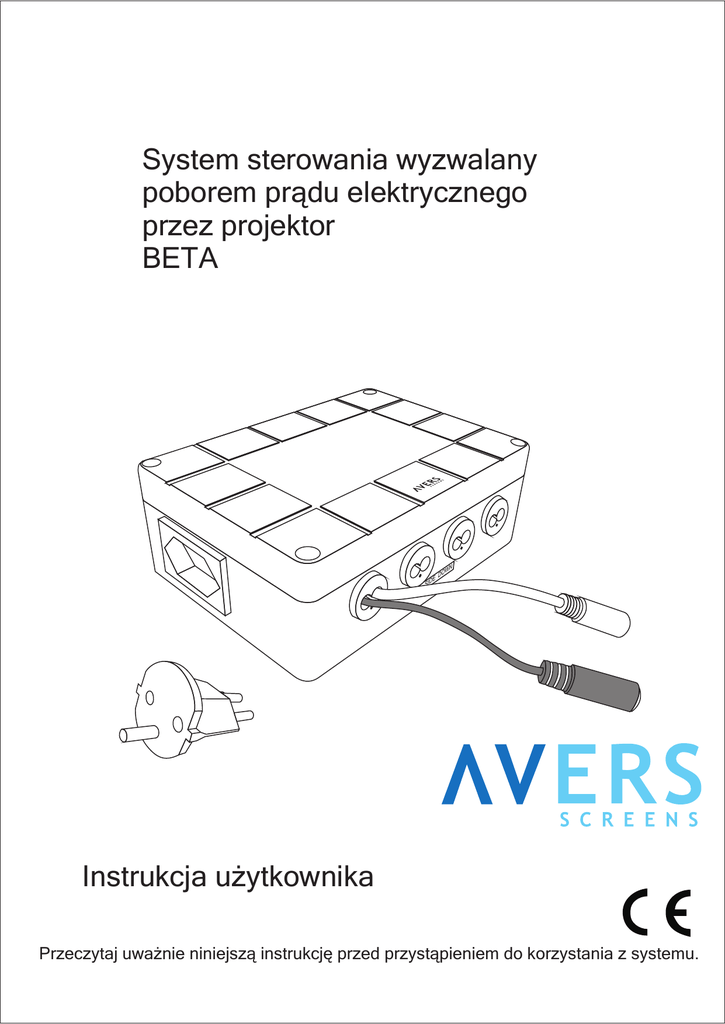 System sterowania wyzwalany poborem prądu elektrycznego przez projektor BETA Instrukcja użytkownika Przeczytaj uważnie niniejszą instrukcję przed przystąpieniem do korzystania z systemu. Szanowni Państwo, Dziękujemy za zakup naszego systemu zdalnego sterowania dwoma urządzeniami np. ekranem i windą. Niniejsza instrukcja obsługi zawiera wszystkie informacje, które mogą być potrzebne do korzystania z systemu. Mamy nadzieję, że pomoże ci ona w optymalnym wykorzystaniu twojego nowego systemu sterowania. Życzymy przyjemnego korzystania z nowego systemu sterowania ekranem elektrycznym marki Avers Screens. INFORMACJE DOTYCZĄCE BEZPIECZEŃSTWA UWAGA: Ważne informacje dotyczące bezpieczeństwa. Ze względu na zachowanie bezpieczeństwa osób, należy postępować zgodnie z zaleceniami opisanymi w niniejszej instrukcji. Po przeczytaniu należy zachować instrukcję w celu wykorzystania jej w przyszłości. UWAGA: URZĄDZENIE MUSI BYĆ UZIEMIONE. OSTRZEŻENIE: 1) Należy odłączyć zasilanie urządzenia jeżeli nie będzie ono wykorzystywane przez dłuższy okres czasu. 2) Nie wolno otwierać obudowy urządzenia aby uniknąć porażenia prądem elektrycznym. Wewnątrz obudowy nie ma żadnych podzespołów obsługiwanych przez użytkownika. Czynności serwisowe należy pozostawić wykwalifikowanemu personelowi centrum serwisowego. Spis treści: 1. Zasady bezpieczeństwa 1.1 Deklaracja zgodności CE 2. Opis produktu 2.1 Zawartość opakowania 2.2 Dane techniczne 3. Opis instalacji 3.1 Zalecenia dotyczące instalacji 3.2 Instalacja sterownika 3.3 Podłączenie do instalacji elektrycznej 3.4 Programowanie sterowania 4. Obsługa systemu sterowania 4.1 Obsługa automatyczna 4.2 Obsługa manualna 4.3 Konserwacja systemu sterowania 4.4 Zanim zadzwonisz do serwisu 5. Warunki gwarancji 1. Zasady bezpieczeństwa INFORMACJE DOTYCZĄCE BEZPIECZEŃSTWA UWAGA: Ważne informacje dotyczące bezpieczeństwa. Ze względu na zachowanie bezpieczeństwa osób należy postępować zgodnie z zaleceniami opisanymi w niniejszej instrukcji. Po przeczytaniu należy zachować instrukcję w celu wykorzystania jej w przyszłości Nie można pozwalać dzieciom na zabawę nadajnikiem systemu sterowania (pilotem zdalnego sterowania). Nie wolno pozostawiać pilota/pilotów zdalnego sterowania w zasięgu dzieci. 2 Należy okresowo przeprowadzać kontrolę instalacji sterownika systemu zdalnego w celu wykrycia nieprawidłowości lub uszkodzeń. W przypadku ich wykrycia należy zaniechać korzystania z systemu do czasu ich usunięcia.Nie wolno stać w pobliżu sterowanego ekranu podczas zwijania oraz rozwijania powierzchni projekcyjnej. Grozi to kontuzjami lub poranieniem. Wszelkie prace instalacyjne powinny być wykonywane przez wykwalifikowanego instalatora. Niepoprawnie przeprowadzona instalacja może grozić uszkodzeniem produktu oraz utratą zdrowia. Nie wolno wykonywać żadnych czynności, które mogą spowodować uszkodzenie kabli połączeniowych. Korzystanie z urządzenia z uszkodzonym kablem zasilającym może spowodować porażenie prądem elektrycznym, zwarcia w instalacji oraz pożar w ich efekcie. Nie wolno dotykać sznura sieciowego oraz wtyczki sieciowej mokrymi rękami. Nie wolno dopuścić do zalania kontrolera i ani sterownika ekranu wodą, grozi to porażeniem prądem elektrycznym. . Nie wolno wkładać metalowych przedmiotów do wnętrza sterownika przez szczeliny w obudowie, grozi to porażeniem prądem elektrycznym. Należy zawsze postępować zgodnie z zaleceniami opisanymi w niniejszej instrukcji obsługi. 1.1 Deklaracja zgodności CE Deklaracja zgodności producenta CE AVERS Screens Sp. z o.o. Ponosząc pełną odpowiedzialność oświadcza, że: Wszystkie wytwarzane ekrany projekcyjne są produkowane zgodnie z głównymi wymogami bezpieczeństwa zawartymi w Dyrektywie 98/79/WE Systemy sterowania: ALFA TRIGGER, ALFA TRIGGER BEZPRZEWODOWY, ALFA IR, ALFA RADIO, BETA, DELTA Wyżej wymienione produkty pozostają w zgodności z wymogami Dyrektyw Europejskich, a w szczególności z normami: PN-EN 55014-1:2007(U) PN-EN 50082-1:1997 PN-EN 60335-1:2004 PN-EN 61000-3-2:2007 PN-EN 61000-3-3:1997 IEC 60335-2-97:2007 2. Opis produktu System sterowania BETA przeznaczony jest do zdalnego sterowania elektrycznymi ekranami projekcyjnymi Avers Screens, windami do projektorów Avers ProLift, systemami zasłon elektrycznych Avers Virgo oraz innymi urządzeniami elektrycznymi sterownymi poprzez podanie napięcia sieciowego na wejścia sterujące. System został zaprojektowany z myślą o zastosowaniu w stałych instalacjach projekcyjnych do celów biznesowych lub kina domowego. Sterowanie podłączonymi urządzeniami odbywa się automatycznie na podstawie analizy poboru energii elektrycznej przez projektor podłączony do gniazdka zasilającego zainstalowanego na obudowie systemu sterowania. W przypadku uszkodzenia sterownika ekranu możliwe jest manualne sterowanie przy pomocy przełącznika ściennego. System umożliwia podłączenie w trybie wykonawczym (slave) do zewnętrznych systemów sterujących (instalacje budynków inteligentnych). System BETA jest dodatkowo wyposażony w akcesoria umożliwiające przesłanie sygnałów sterujących wysyłanych w podczerwieni przez pilot zdalnego sterowania do projektora zainstalowanego na windzie i oddzielonego od pilota sufitem. 3 2.1 Zawartość opakowania Upewnij się, że system sterowania nie uległ uszkodzeniom w czasie transportu. Sprawdź, czy w opakowaniu ekranu znajdują się wszystkie akcesoria i materiały opisane poniżej: x2 x1 Jednostka główna x 1 Konwerter gniazda x 1 Akcesoria Ir Instrukcja użytkownika x 1 2.2 Dane techniczne Jednostka główna: Wymiary: 153 x 108 x 58 mm Zasilanie: prąd przemienny 220-240V, 50Hz Sterowanie: prąd przemienny 220-240V, 50Hz Maksymalny prąd sterowania: 1,5A Programowany poziom poboru energii wyzwalający działanie sterowania Nadajnik / Odbiornik Ir Wymiary: Ø13 x 40mm (13x8x5mm) Długość przewodu: 145cm Wid