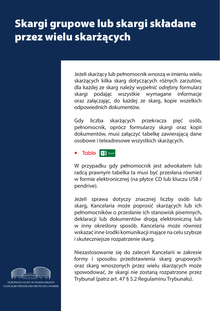 Skargi grupowe lub skargi składane przez wielu skarżących Jeżeli skarżący lub pełnomocnik wnoszą w imieniu wielu skarżących kilka skarg dotyczących różnych zarzutów, dla każdej ze skarg należy wypełnić odrębny formularz skargi podając wszystkie wymagane informacje oraz załączając, do każdej ze skarg, kopie wszelkich odpowiednich dokumentów. Gdy liczba skarżących przekracza pięć osób, pełnomocnik, oprócz formularzy skargi oraz kopii dokumentów, musi załączyć tabelkę zawierającą dane osobowe i teleadresowe wszystkich skarżących. Table W przypadku gdy pełnomocnik jest adwokatem lub radcą prawnym tabelka ta musi być przesłana również w formie elektronicznej (na płytce CD lub kluczu USB / pendrive). Jeżeli sprawa dotyczy znacznej liczby osób lub skarg, Kancelaria może poprosić skarżących lub ich pełnomocników o przesłanie ich stanowisk pisemnych, deklaracji lub dokumentów drogą elektroniczną lub w inny określony sposób. Kancelaria może również wskazać inne środki komunikacji mające na celu szybsze i skuteczniejsze rozpatrzenie skarg. Niezastosowanie się do zaleceń Kancelarii w zakresie formy i sposobu przedstawienia skarg grupowych oraz skarg wnoszonych przez wielu skarżących może spowodować, że skargi nie zostaną rozpatrzone przez Trybunał (patrz art. 47 § 5.2 Regulaminu Trybunału).