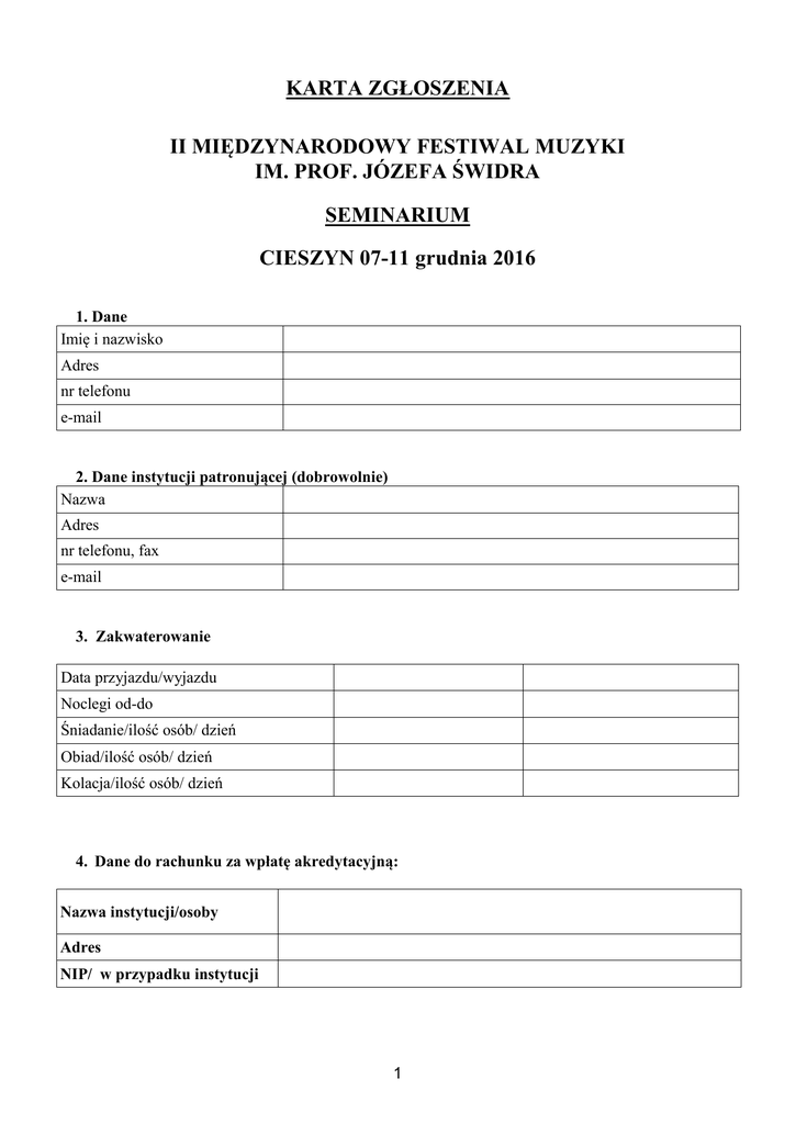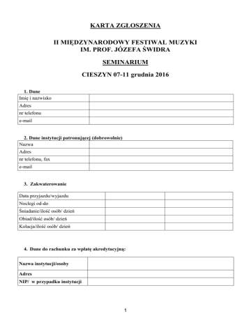 KARTA ZGŁOSZENIA II MIĘDZYNARODOWY FESTIWAL MUZYKI IM. PROF. JÓZEFA ŚWIDRA SEMINARIUM CIESZYN 07-11 grudnia 2016 1. Dane Imię i nazwisko Adres nr telefonu e-mail 2. Dane instytucji patronującej (dobrowolnie) Nazwa Adres nr telefonu, fax e-mail 3. Zakwaterowanie Data przyjazdu/wyjazdu Noclegi od-do Śniadanie/ilość osób/ dzień Obiad/ilość osób/ dzień Kolacja/ilość osób/ dzień 4. Dane do rachunku za wpłatę akredytacyjną: Nazwa instytucji/osoby Adres NIP/ w przypadku instytucji 1 5. Przyjmujemy warunki określone w Regulaminie Podpis przedstawiciela instytucji patronującej (dobrowolnie) Podpis prezesa Podpis dyrygenta Czytelnie wypełnioną kartę należy przesłać pocztą na adres: KONTAKT: BIURO ORGANIZACYJNE I MIĘDZYNARODOWEGO FESTIWALU MUZYKI IM. JÓZEFA ŚWIDRA INSTYTUT MUZYKI UL. NIEMCEWICZA 2 43-400 CIESZYN e-mail: [email protected] 6. Zgłoszenia uczestnictwa w seminarium prosimy przesłać do 30 września 2016 na adres elektroniczny [email protected] 2