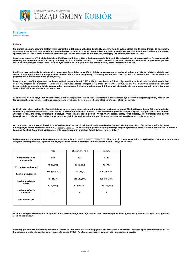 Historia 2014-03-26 11:30:03 Historia Najstarsza udokumentowana historycznie wzmianka o Kobiórze pochodzi z 1467r. XV-wieczny Kobiór był niewielką osadą zagrodniczą, do początków następnego stulecia liczącą zaledwie 9 gospodarstw. Wygląd XVII -wiecznego Kobióra przybliża mapa pszczyńskiego wolnego państwa stanowego sporządzona w 1636r. przez Andreasa Hindenberga. Można zauważyć na niej folwark, istniejący już prawdopodobnie w XVI w. Jeszcze na początku XVIII wieku istniała w Kobiórze stadnina, w której hodowano około 200 koni dla potrzeb książąt pszczyńskich. Po przeniesieniu stadniny do oddalonej o 20 km Wisły Wielkiej, w latach czterdziestych XIX wieku, kobiórski folwark został zlikwidowany, a pozostałe po nim zabudowania przejęła służba leśna. Dziś na tym terenie znajdują się obiekty nadleśnictwa, które utworzono w 1820r. Okoliczne lasy zachęcały do polowań i wypoczynku. Doceniając to, w 1861r. książęta pszczyńscy wybudowali pałacyk myśliwski, służący właśnie tym celom. Z Pszczyny wiodła doń wysadzona dębami aleja, której fragmenty zachowały się do dziś, tworząc wraz z "zameczkiem" zespół zabytków przyrodniczo-kulturowych ziemi pszczyńskiej. Znacząco na rozwój miejscowości wpłynęła wybudowana w latach 1862 - 1863 szosa łącząca Kobiór z Tychami i Murckami, a także zbudowanie linii kolejowej między Szopienicami i Dziedzicami. Pierwszy pociąg przejechał tą trasą 24 czerwca 1870r. Dzięki tej inwestycji uzyskano, bowiem bezpośrednie połączenie z koleją warszawsko - wiedeńską. Z chwilą uruchomienia linii kolejowej skończyła się era poczty konnej i dzięki temu od 1884 roku Kobiór ma własny urząd pocztowy. W 1905 roku Kobiór liczył 1250 mieszkańców. Funkcję wójta pełnił Franciszek Jastrzemski, a sekretarzem był kierownik miejscowej szkoły Kroker. On tez zajmował się sprawami lokalnego urzędu stanu cywilnego i stał na czele kobiórskiej ochotniczej straży pożarnej. W 1914 roku, kiedy wybuchła I Woja Światowa do szeregów cesarskiej armii niemieckiej zaciągnięto ponad 200 kobiórzan. Ponad 50 z nich poległo. Mieszkańcy wyraźnie odczuwali skutki wojny, bowiem wprowadzono obowiązkowe oddawanie płodów rolnych i żywca. Dla potrzeb armii zabrano większość koni. Do pracy brakowało mężczyzn, więc ciężkie prace polowe wykonywały dzieci, starcy oraz kobiety. Po wprowadzeniu kartek żywnościowych pojawiły się osoby z poza miejscowości, by tu w drodze handlu wymiennego uzyskać pozakartkowe artykuły spożywcze. W trudnym okresie powstań śląskich, w których również uczestniczyli Kobiórzanie w walkach o Stare Koźle, Bierawe, Zakrzów, Leśnicę, Góra św. Anny funkcję wójta pełnił Paweł Machalica #℣佐⌡⌀㤀㤀†ጀ 㤀㈀㈀⌡⍃倣℣. W okresie tym powstawały organizacje niepodległościowe takie jak Rada Robotniczo – Chłopska, komórka Polskiej Organizacji Wojskowej, koło Narodowego Stronnictwa Robotników, czy też „Sokół”. Podczas plebiscytu Kobiór miał dwa obwody głosowania #℣佐⌡⌀眀椀攁嬀 椀 漀戀猀稀愀爀 搀眀漀爀猀欀椀⌡⍃倣℣ i każda z nich miała własne listy swych wyborców oraz odrębną urnę. Oficjalne wyniki plebiscytu ogłosiła Międzysojusznicza Komisja Rządząca i Plebiscytowa w dniu 7 maja 1921 roku: Uprawnionych do głosowania wieś obszar dworski razem 989 333 1322 76 (7,7%) 17 (5,1%) 93 (7%) 974 (98,5%) 317 (95,2) 1291 (97,7%) 797 (82%) 256 (80,8%) 1053 (81,6%) 175(18%) 61 (19,2%) 236 (18,4%) 2 - 2 W tym tzw. emigranci Liczba głosujących Liczba głosów za Polską Liczba głosów za Niemcami Głosy nieważne W latach 20-tych zlikwidowano odrębność obszaru dworskiego i od tego czasu Kobiór stanowił jedna zwartą jednostkę administracyjną liczącą ponad 2450 mieszkańców. Pierwszy preliminarz budżetowy powstał w Gminie w 1925 roku. Po stronie wpływów pochodzących z podatków i różnych opłat przewidziano 6272 zł (miesięczna pensja kierownika szkoły wynosiła ponad 100zł). Po stronie rozchodów znalazły się następujące pozycje: strona 1/3 Utrzymanie administracyjne gminy Utrzymanie dróg gminnyc Utrzymanie szkoły bez płac Ochrona przeciwpożarowa Pomoc ubogim Inne wydatki 2740 zł 300 1500 132 1400 200 zł zł zł zł zł W 1919 roku erygowano parafię katolicką. Jednak Kościół wzniesiony kilka lat wcześniej wymagał jednak dalszych nakładów finansowych. Koszty ponosili parafianie oraz Gmina. Pieniądze jednak nie wystarczyły na całkowity remont, wówczas proboszcz wystarał się w Kurii o pożyczkę w wysokości 5000zł. Natomiast w 1934 roku wydano z budżetu gminy 500 zł na pierwsze dzwony kościelne. Do najpoważniejszych przedsięwzięć okresu międzywojennego zaliczyć można elektryfikację Kobióra. Koszty ponosiła gmina, która tez została właścicielem sieci energetycznej. W związku z dużymi kosztami wystąpiono o pożyczkę w kwocie 20 000 zł. Przez długie lata biuro kobiórskiej gminy mieściło się w prywatnych domach. W styczniu 1930 roku uchwalono wzniesienie budynku gminnego. Prace budowlane rozpoczęto w 1935 roku, obiekt ten do dziś pełni siedzibę urzędu gminy z przerwą w latach 1977 – 1991. W okresie tym w Kobiórze istniał posterunek Policji Wojewódzkiej, który w swoim zakresie obejmował tylko Kobiór. W 1939 roku w przygotowaniach do obrony na skraju Kobióra saperzy zaczęli budować umocnienia. Przygotowywano zawały leśne, zasieki z drutu kolczastego, kopano okopy. Pluton saperów zakwaterowano na terenie tartaku. W obronie Kobióra zginęło 13 polskich żołnierzy, a 42 zostało rannych. Po wycofaniu się żołnierzy z terenu Kobióra, do miejscowości wkroczyli Niemcy i zamordowali bezbronnych mężczyzn, spalono domy, wzięto zakładników, których przetrzymywano w wiezieniu. Z chwilą wejścia do Kobióra Wehrmachtu zaczęto organizować niemiecki urząd gminy. W czasie okupacji większość k