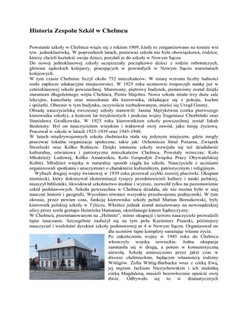 Historia Zespołu Szkół w Chełmcu Powstanie szkoły w Chełmcu wiąże się z rokiem 1909, kiedy to zorganizowano na terenie wsi tzw. jednoklasówkę. W poprzednich latach, ponieważ szkoła nie była obowiązkowa, rodzice, którzy chcieli kształcić swoje dzieci, posyłali je do szkoły w Nowym Sączu. Do nowej jednoklasowej szkoły uczęszczały początkowo dzieci z rodzin robotniczych, głównie sądeckich kolejarzy, pracujących w powstałych w Nowym Sączu warsztatach kolejowych. W tym czasie Chełmiec liczył około 752 mieszkańców. W miarę wzrostu liczby ludności rosło zaplecze edukacyjne miejscowości. W 1925 roku uczniowie rozpoczęli naukę już w czteroklasowej szkole powszechnej. Murowany, piętrowy budynek, postawiony został dzięki staraniom długoletniego wójta Chełmca, Piotra Majchra. Nowa szkoła miała trzy duże sale lekcyjne, kancelarię oraz mieszkanie dla kierownika, składające się z pokoju, kuchni i spiżarki. Obecnie w tym budynku, oczywiście rozbudowanym, mieści się Urząd Gminy. Obsadę nauczycielską ówczesnej szkoły stanowili: Janina Mężykówna (córka pierwszego kierownika szkoły), a końcem lat trzydziestych i podczas wojny Eugeniusz Chorbiński oraz Stanisława Grodkowska. W 1925 roku kierownikiem szkoły powszechnej został Jakub Bodziony. Był on nauczycielem wiejskim i traktował swój zawód, jako misję życiową. Pracował w szkole w latach 1925-1939 oraz 1945-1948. W latach międzywojennych szkoła chełmiecka stała się jedynym miejscem, gdzie mogły pracować lokalne organizacje społeczne, takie jak: Ochotnicza Straż Pożarna, Związek Strzelecki oraz Kółko Rolnicze. Dzięki istnieniu szkoły rozwijała się też działalność kulturalna, oświatowa i patriotyczna mieszkańców Chełmca. Powstały wówczas: Koło Młodzieży Ludowej, Kółko Amatorskie, Koło Gospodyń Związku Pracy Obywatelskiej Kobiet. Młodzież wiejska w naturalny sposób ciągła ku szkole. Nauczyciele z uczniami organizowali spotkania i uroczystości o charakterze kulturalnym, patriotycznym i religijnym. Wybuch drugiej wojny światowej w 1939 roku przerwał szybki rozwój placówki. Okupant niemiecki, który dokonywał eksterminacji tysięcy przedstawicieli kultury i nauki polskiej, niszczył biblioteki, likwidował szkolnictwo średnie i wyższe, zezwolił tylko na pozostawienie szkół podstawowych. Szkoła powszechna w Chełmcu działała, ale nie można było w niej nauczać historii i geografii. Wycofano również wszystkie przedwojenne podręczniki. W tym okresie, przez pewien czas, funkcję kierownika szkoły pełnił Marian Borsukowski, były kierownik polskiej szkoły w Tyliczu. Wkrótce jednak został aresztowany na nowosądeckiej ulicy przez szefa gestapo Heinricha Hamanna, określanego katem Sądecczyzny. W Chełmcu, przemianowanym na „Helmitz”, mimo okupacji i terroru nauczyciele prowadzili tajne nauczanie. Szczególnie zasłużył się na tym polu Kazimierz Pisarski, późniejszy nauczyciel i wieloletni dyrektor szkoły podstawowej nr 4 w Nowym Sączu. Organizował on dla uczniów tajne komplety narażając własne życie. Po zakończeniu wojny w 1945 roku do Chełmca wkroczyły wojska sowieckie. Jedna okupacja zamieniła się w drugą, a potem w komunistyczną niewolę. Szkołę umieszczono przez jakiś czas w dworze chełmieckim, będącym własnością rodziny Wittigów. Zofia Wittig-Barbacka wraz z córką Ewą, jej mężem Jackiem Nieżychowskim i ich maleńką córką Magdaleną, musieli bezzwłocznie opuścić swój dwór. Odbywało się to w dramatycznych okolicznościach, podobnie jak w innych rejonach Polski, na której tereny wkraczała Armia Czerwona. Uczniowie szkoły rozpoczęli naukę według nowych programów, zatwierdzonych przez komunistyczne władze, a jako przedmiot obowiązkowy pojawił się język rosyjski. W dniu 19 września 1966 roku podjęto decyzję o budowie nowej szkoły w Chełmcu. Termin budowy wyznaczono na 26 czerwiec 1967 rok. Wmurowano wtedy Akt Erekcyjny pod budowę szkoły, która została oddana do użytku w 1968 roku. Na podstawie Zarządzenia Ministerstwa Oświaty i Wychowania z dnia 17 stycznia 1973 roku utworzono Zbiorcze Szkoły Gminne i placówka w Chełmcu dołączyła do takich szkół. W 1989 roku Polska odzyskała swoją wolność i niezależność. Zmiany polityczne w kraju wpłynęły również na zmiany programów szkolnych i reorganizację całego szkolnictwa. W 1999 roku, w związku z reformą polskiej oświaty, w szkole w Chełmcu utworzono gimnazjum i powołano do życia Zespół Szkół w Chełmcu. Obecnie Zespół Szkół w Chełmcu imieniem Mikołaja Kopernika jest dużą i bardzo dobrze funkcjonującą placówką. Wcześniej szkołą kierowali: 1967 – 1973 Jan Nowak 1974-1975 Krystyna Salamon 1975 – 1979 Stanisław Świderski 1979 – 1984 Barbara Pasiut 1984 – 1989 Julian Kozak 1989 – 2013 Stanisław Mrzygłód Od 1 września 2013 roku obowiązki dyrektora Zespołu Szkół w Chełmcu sprawuje Krzysztof Groń. Dziś szkoła w Chełmcu posiada: 27 sal lekcyjnych, w tym 12 pracowni przedmiotowych (2 historyczne, 2 geograficzne, 2 matematyczne, 2 komputerowe, biologiczną, fizyczną, chemiczną, językową), a także bibliotekę, świetlicę i stołówkę. Opracowała mgr Monika Żytkowicz