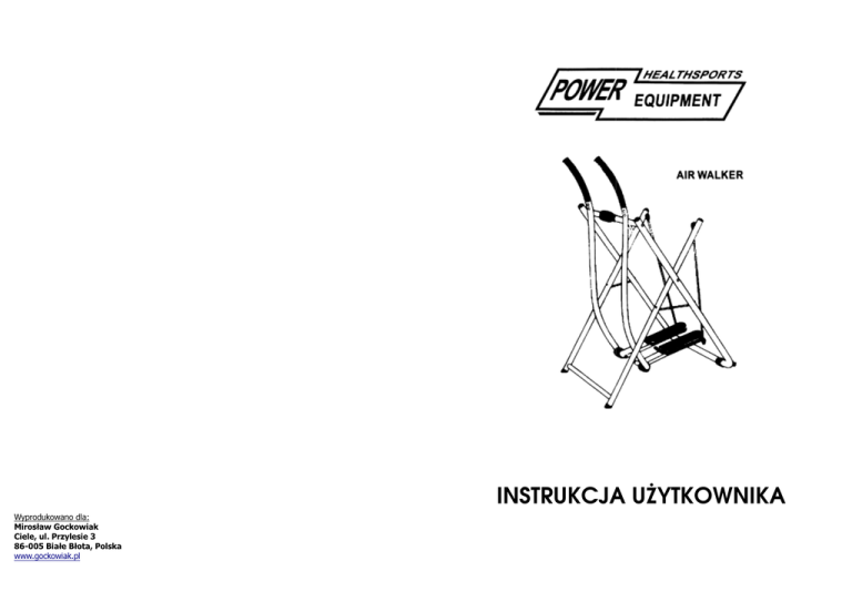 INSTRUKCJA UŻYTKOWNIKA UŻ Wyprodukowano dla: Mirosław Gockowiak Ciele, ul. Przylesie 3 86-005 Białe Błota, Polska www.gockowiak.pl Specyfikacja i instrukcja montażu Specyfikacja: Wymiary (rozłożony): 1110x740x1365 mm Wymiary (złożony): 1400x740 mm Waga: 20,5 kg Maksymalna waga użytkownika : 120kg Instrukcja montażu: 1. Wyciągnij ą sprzęt ęt z kartonu i postaw na podłogę podłogę. 2. Włóż uchwyty w ruchome ramiona. 3. Przy użyciu śrub zamontuj tuj uchwyty w ruchomych ramionach. Po instalacji montaż jest zakończony. Ważne wskazówki ę ćwiczeń skonsultuj się ę z lekarzem. 1. Przed rozpoczęciem 2. Przed każdorazowym żdorazowym rozpoczęciem rozpoczę ćwiczeń ć ń sprawdźź czy urządzenie ądzenie jest kompletne i sprawne. Nie zaczynaj jeśli urządzeniu ądzeniu brakuje elementów. 3. Rozpocznij ćwiczenia powoli. Dostosuj tempo ćwiczeń ć ń do swoich możliwości, ż ści, tak abyś czuł się ę komfortowo. 4. Nie przeciążaj ążaj organizmu ćwiczeniami. ć Słuchaj swojego ciała i reaguj na każde żde niepokojące niepokoją objawy. 5. Urządzenie ądzenie ma przeznaczenie przeznacze jedynie takie jak opisane w tej instrukcji. 6. Ostrożnie ż zaczynaj ćwiczenia i kończ. koń Dopilnuj aby urządzenie ądzenie stało na stabilnej, równej poziomej powierzchni. 7. Trzymaj palce, włosy oraz luźne luź części ęś odzieży ż w odpowiedniej odległości od ruchomych części częś urządzenia. ą 8. Urządzenie ądzenie zdecydowanie nie jest przeznaczone dla dzieci. Przechowuj urządzenie ądzenie z dala od dzieci. NA SPODZIE SPRZĘTU ZOSTAŁA UMIESZCZONA PLOMBA AUTENTYCZNOŚCI NIEZBĘDNA DO UWZGLĘDNIENIA EW. REKLAMACJI. NARUSZENIE SZENIE PLOMBY WIĄŻE SIĘ Z UTRATĄ GWARANCJI NA SPRZĘT. 2 7 Możliwe utrudnienia, rozwiązania AIR WALKER może hałasować. 1. Sprawdź czy wszystkie śruby, łączenia ączenia oraz zaś zaślepki są ą prawidłowo zamontowane. ż zabezpieczyć ć urządzenie ą smarując ąc smarami 2. Można Np. WD-40. 40. Działanie takie najprawdopodobniej zmniejszy tarcie oraz dobiegający ą hałas. Należy ży smarować ruchome łączenia w urządzeniu. Przechowywanie Urządzenie w prosty sposób można złożyć na płasko tak aby ułatwić przechowywanie. Jak używać żywać AIR WALKER Przede wszystkim należy ży stworzyć dla urządzenia ą i ćwiczącego ć ą przestrzeń, która zapewni komfortowe oraz bezpieczne wykonywanie ćwiczeń oraz wchodzenie i schodzenie z urządzenia. Wchodzenie 1. Przytrzymaj się przedniej poprzeczki urządzenia. 2. Połóż ostrożnie prawą stopę na prawej platformie, a następnie wsuń lewą stopę w lewą platformę. 3. Trzymaj się przedniej poprzeczki do momentu aż będziesz ę pewien, ze stoisz stabilnie. Teraz możesz moż zaczynać ć swoje ćwiczenia. ć Nauka „ślizgania” ślizgania” 1. Stań ń na platformach trzymając trzymają się ę przedniej poprzeczki. 2. Zacznij ćwiczenia ć od powolnego tempa od gładkich prostych kroków aby zapoznać się ęz działaniem urządzenia. 3. Możesz żesz „ślizgać „ś ć się” ę szybciej, kiedy nabierzesz doświadczenia świadczenia i zapoznasz się z działaniem urządzenia. Schodzenie 1. Zakończ powoli ćwiczenia. 2. Upewnij się, że platformy są ustawione poziomo, a Ty stoisz stabilnie. 3. Powoli zdejmuj stopy z platform jedna za drugą. 6 3 Pozycje rąk W zależności ż ś od poziomu ćwiczeń, ć ń można żna stosować kilka różnych ż pozycji rąk na urządzeniu. 1. Przednia poprzeczka Trzymaj się ę przedniej poprzeczki między ędzy ruchomymi ramionami (rys.1). Freestyle rys.1 2. Neutralnie Trzymaj uchwyty tak jak pokazano na rysunku poniż poniżej (rys.2). Ta pozycja pomoże ż Twojemu ciału robić ć ćwiczenia w pełnej harmonii. Podstawowy krok Kontroluj prędkość kroków Zmieniaj swoja postawę robiąc małe kroki Zmień postawę podnosząc pięty do góry rys.2 3. Nisko Trzymaj uchwyty nisko tak jak na rysunku poniż poniżej (rys.3). Pozycja ta wymusi, aby bardziej intensywnie ć ćwiczyły dolne partie ciała. rys.3 rys.4 4. Wolne dłonie Jeśli ś osiągniesz ą równowagę ę ciała możesz żesz odchylić ręce ę swobodnie tym samym zwiększysz ększysz poziom ćwiczeń ćwiczeń. 4 Wydłuż kroki zmieniając środek ciężkości Rób kroki coraz większe wię Poruszaj ramionami aż do największego ę tak jakbyś normalnie szedł 5