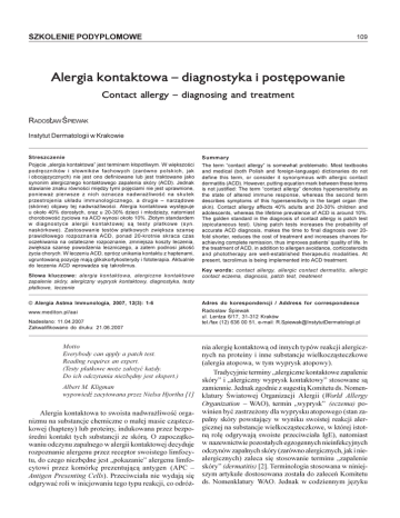 piewak R. Alergia kontaktowa diagnostyka i postêpowanie SZKOLENIE PODYPLOMOWE 109 Alergia kontaktowa diagnostyka i postêpowanie Contact allergy diagnosing and treatment RADOS£AW PIEWAK Instytut Dermatologii w Krakowie Streszczenie Pojêcie alergia kontaktowa jest terminem k³opotliwym. W wiêkszoci podrêczników i s³owników fachowych (zarówno polskich, jak i obcojêzycznych) nie jest ono definiowane lub jest traktowane jako synonim alergicznego kontaktowego zapalenia skóry (ACD). Jednak stawianie znaku równoci miêdzy tymi pojêciami nie jest uprawnione, poniewa¿ pierwsze z nich oznacza nadwra¿liwoæ na skutek przestrojenia uk³adu immunologicznego, a drugie narz¹dowe (skórne) objawy tej nadwra¿liwoci. Alergia kontaktowa wystêpuje u oko³o 40% doros³ych, oraz u 20-30% dzieci i m³odzie¿y, natomiast chorobowoæ ¿yciowa na ACD wynosi oko³o 10%. Z³otym standardem w diagnostyce alergii kontaktowej s¹ testy p³atkowe (syn. naskórkowe). Zastosowanie testów p³atkowych zwiêksza szansê prawid³owego rozpoznania ACD, ponad 20-krotnie skraca czas oczekiwania na ostateczne rozpoznanie, zmniejsza koszty leczenia, zwiêksza szansê powodzenia leczniczego, a zatem podnosi jakoæ ¿ycia chorych. W leczeniu ACD, oprócz unikania kontaktu z haptenami, ugruntowan¹ pozycjê maj¹ glikokortykosterydy i fototerapia. Aktualnie do leczenia ACD wprowadza siê takrolimus. S³owa kluczowe: alergia kontaktowa, alergiczne kontaktowe zapalenie skóry, alergiczny wyprysk kontaktowy, diagnostyka, testy p³atkowe, leczenie Summary The term contact allergy is somewhat problematic. Most textbooks and medical (both Polish and foreign-language) dictionaries do not define this term, or consider it synonymous with allergic contact dermatitis (ACD). However, putting equation mark between these terms is not justified: The term contact allergy denotes hypersensitivity as the state of altered immune response, whereas the second term describes symptoms of this hypersensitivity in the target organ (the skin). Contact allergy affects 40% adults and 20-30% children and adolescents, whereas the lifetime prevalence of ACD is around 10%. The golden standard in the diagnosis of contact allergy is patch test (epicutaneous test). Using patch tests increases the probability of accurate ACD diagnosis, makes the time to final diagnosis over 20fold shorter, reduces the cost of treatment and increases chances for achieving complete remission, thus improves patients quality of life. In the treatment of ACD, in addition to allergen avoidance, corticosteroids and phototherapy are well-established therapeutic modalities. At present, tacrolimus is being implemented into ACD treatment. Key words: contact allergy, allergic contact dermatitis, allergic contact eczema, diagnosis, patch test, treatment © Alergia Astma Immunologia, 2007, 12(3): 1-6 Adres do korespondencji / Address for correspondence www.mediton.pl/aai Rados³aw piewak ul. Lentza 6/17, 31-312 Kraków tel./fax (12) 636 00 51, e-mail: [email protected] Nades³ano: 11.04.2007 Zakwalifikowano do druku: 21.06.2007 Motto Everybody can apply a patch test. Reading requires an expert. (Testy p³atkowe mo¿e za³o¿yæ ka¿dy. Do ich odczytania niezbêdny jest ekspert.) Albert M. Kligman wypowied zacytowana przez Nielsa Hjortha [1] Alergia kontaktowa to swoista nadwra¿liwoæ organizmu na substancje chemiczne o ma³ej masie cz¹steczkowej (hapteny) lub proteiny, indukowana przez bezporedni kontakt tych substancji ze skór¹. O zapocz¹tkowaniu odczynu zapalnego w alergii kontaktowej decyduje rozpoznanie alergenu przez receptor swoistego limfocytu, do czego niezbêdne jest pokazanie alergenu limfocytowi przez komórkê prezentuj¹c¹ antygen (APC Antigen Presenting Cells). Przeciwcia³a nie wydaj¹ siê odgrywaæ roli w inicjowaniu tego typu reakcji, co odró¿- nia alergiê kontaktow¹ od innych typów reakcji alergicznych na proteiny i inne substancje wielkocz¹steczkowe (alergia atopowa, w tym wyprysk atopowy). Tradycyjnie terminy alergiczne kontaktowe zapalenie skóry i alergiczny wyprysk kontaktowy stosowane s¹ zamiennie. Jednak zgodnie z sugesti¹ Komitetu ds. Nomenklatury wiatowej Organizacji Alergii (World Allergy Organization WAO), termin wyprysk (eczema) powinien byæ zastrze¿ony dla wyprysku atopowego (stan zapalny skóry powstaj¹cy w wyniku swoistej reakcji alergicznej na substancje wielkocz¹steczkowe, w której istotn¹ rolê odgrywaj¹ swoiste przeciwcia³a IgE), natomiast w nazewnictwie pozosta³ych egzogennych nieinfekcyjnych odczynów zapalnych skóry (zarówno alergicznych, jak i niealergicznych) zaleca siê stosowanie terminu zapalenie skóry (dermatitis) [2]. Terminologia stosowana w niniejszym artykule dostosowana zosta³a do zaleceñ Komitetu ds. Nomenklatury WAO. Jednak w codziennym jêzyku 110 lekarzy terminy wyprysk i zapalenie skóry u¿ywane s¹ zamiennie, a zmiana tego nawyku mo¿e okazaæ siê trudna. W Polsce (i nie tylko) spor¹ popularnoci¹ wród lekarzy ciesz¹ siê sprzeczne z intencj¹ Komitetu WAO terminy atopowe zapalenie skóry oraz alergiczny wyprysk kontaktowy. Poza tym, termin zapalenie skóry sk³ada siê z 6 sylab, a s³owo wyprysk tylko z dwóch, co zapewne tak¿e wp³ywa na preferencje osób u¿ywaj¹cych tych terminów. Równie¿ w oficjalnych publikatorach Europejskiej Akademii Alergologii i Immunologii Klinicznej oraz wiatowej Organizacji Alergii nadal spotyka siê niezalecan¹ terminologiê, np. contact eczema (wyprysk kontaktowy). Definicje pojêæ stosowanych w niniejszym artykule podaje tabela I. Pojêcie alergia kontaktowa jest terminem k³opotliwym, jako ¿e w wiêkszoci podrêczników i s³owników fachowych (zarówno polskich, jak i obcojêzycznych) nie jest ono definiowane lub jest traktowane jako synonim alergicznego kontaktowego zapalenia skóry. Stawianie znaku równoci miêdzy pojêciami alergia kontaktowa i alergiczne kontaktowe zapalenie skóry nie jest uprawnione. Relacjê miêdzy tymi terminami mo¿na r