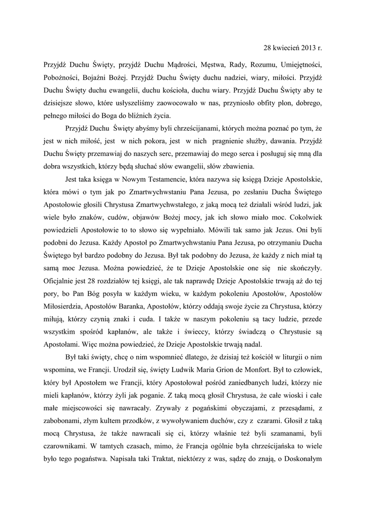 28 kwiecień 2013 r. Przyjdź Duchu Święty, przyjdź Duchu Mądrości, Męstwa, Rady, Rozumu, Umiejętności, Pobożności, Bojaźni Bożej. Przyjdź Duchu Święty duchu nadziei, wiary, miłości. Przyjdź Duchu Święty duchu ewangelii, duchu kościoła, duchu wiary. Przyjdź Duchu Święty aby te dzisiejsze słowo, które usłyszeliśmy zaowocowało w nas, przyniosło obfity plon, dobrego, pełnego miłości do Boga do bliźnich życia. Przyjdź Duchu Święty abyśmy byli chrześcijanami, których można poznać po tym, że jest w nich miłość, jest w nich pokora, jest w nich pragnienie służby, dawania. Przyjdź Duchu Święty przemawiaj do naszych serc, przemawiaj do mego serca i posługuj się mną dla dobra wszystkich, którzy będą słuchać słów ewangelii, słów zbawienia. Jest taka księga w Nowym Testamencie, która nazywa się księgą Dzieje Apostolskie, która mówi o tym jak po Zmartwychwstaniu Pana Jezusa, po zesłaniu Ducha Świętego Apostołowie głosili Chrystusa Zmartwychwstałego, z jaką mocą też działali wśród ludzi, jak wiele było znaków, cudów, objawów Bożej mocy, jak ich słowo miało moc. Cokolwiek powiedzieli Apostołowie to to słowo się wypełniało. Mówili tak samo jak Jezus. Oni byli podobni do Jezusa. Każdy Apostoł po Zmartwychwstaniu Pana Jezusa, po otrzymaniu Ducha Świętego był bardzo podobny do Jezusa. Był tak podobny do Jezusa, że każdy z nich miał tą samą moc Jezusa. Można powiedzieć, że te Dzieje Apostolskie one się nie skończyły. Oficjalnie jest 28 rozdziałów tej księgi, ale tak naprawdę Dzieje Apostolskie trwają aż do tej pory, bo Pan Bóg posyła w każdym wieku, w każdym pokoleniu Apostołów, Apostołów Miłosierdzia, Apostołów Baranka, Apostołów, którzy oddają swoje życie za Chrystusa, którzy miłują, którzy czynią znaki i cuda. I także w naszym pokoleniu są tacy ludzie, przede wszystkim spośród kapłanów, ale także i świeccy, którzy świadczą o Chrystusie są Apostołami. Więc można powiedzieć, że Dzieje Apostolskie trwają nadal. Był taki święty, chcę o nim wspomnieć dlatego, że dzisiaj też kościół w liturgii o nim wspomina, we Francji. Urodził się, święty Ludwik Maria Grion de Monfort. Był to człowiek, który był Apostołem we Francji, który Apostołował pośród zaniedbanych ludzi, którzy nie mieli kapłanów, którzy żyli jak poganie. Z taką mocą głosił Chrystusa, że całe wioski i całe małe miejscowości się nawracały. Zrywały z pogańskimi obyczajami, z przesądami, z zabobonami, złym kultem przodków, z wywoływaniem duchów, czy z czarami. Głosił z taką mocą Chrystusa, że także nawracali się ci, którzy właśnie też byli szamanami, byli czarownikami. W tamtych czasach, mimo, że Francja ogólnie była chrześcijańska to wiele było tego pogaństwa. Napisała taki Traktat, niektórzy z was, sądzę do znają, o Doskonałym Nabożeństwie do Najświętszej Maryi Panny. Napisał ten traktat pod wpływem swoich przeżyć misyjnych, przeżyć związanych też z pewnymi też doświadczeniami obecności Maryi w swoim życiu. Napisał ten Traktat żeby opisać w jaki sposób czcić Maryję i że te nabożeństwo do Maryi pomaga też skutecznie ewangelizować, głosić Chrystusa. Zachęcam też wszystkich, którzy mają też pewien szacunek, miłość do Maryi, aby to pogłębić i przeczytać właśnie ten Traktat o Doskonałym Nabożeństwie świętego Ludwika. Jest pięknie opisane właśnie to nabożeństwo do Maryi: na czym polega? Jak je przeżywać? Jak naśladować Maryję też. Jakie są cnoty Maryi? Jak Maryja się modliła, jak żyła. Przyznam, że ja osobiście też ten Traktat przeczytałem i na końcu jest taki Akt oddania się Maryi. Dobrze byłoby własnymi słowami napisać Akt oddania się Maryi. Po odbyciu takich 30 dni przygotowania się według tego nabożeństwa Maryi. Napisać ten akt. Dlaczego się oddajesz, jak bardzo, czy na całe życie, czy chcesz naśladować Maryję i potem się pod tym podpisać. Przyznam się, że ja kiedyś też to dokonałem, tego nie żałuję, nie odwołuje tego i widzę jak bardzo Maryja też jest obecna w moim życiu. Jak bardzo doświadczam, ja osobiście, obecności Maryi, tak mogę krótko powiedzieć, nie mówiąc tak szczegółów. Ale wrócę jeszcze do świętego Ludwika, który ten Traktat napisał. Był misjonarzem w XVII wieku i tą Francję, która niestety w wielu miejscach była pogańska, jeden człowiek potrafi przemienić, jeżeli też czci Maryję. Jeżeli odda swoje życie Maryi. Wiele wieków później, kilka wieków później święty Maksymilian zrobił podobnie. Jakim wielkim świętym został. Jan Paweł II czytał traktat o Doskonałym Nabożeństwie świętego Ludwika, nosił go przy sobie, często czytał. Jakim wielkim świętym był, jakim świętym misjonarzem też był. A my w kościele zastanawiamy się dlaczego owoce ewangelii głoszonej przez nas są małe albo żadne, bo często brakuje nam wsparcie w postaci obecności Maryi, prawdziwej czci do Maryi. Wiele z was się dziwi dlaczego w waszych rodzinach, domach jest tyle mroków, tyle ciemności, tyle zła, bo wasze rodziny, w sami, wasze małżeństwa, dzieci nie oddaliście się może Maryi, w sposób uroczysty, w sposób taki świąteczny, żeby cała rodzina przygotowała się może według tego Traktatu przez 30 dni, do uroczystego oddania się Maryi. Napisać akt oddania się całej rodziny, męża, żony, dzieci i potem wszyscy członkowie rodziny mogli by podpisać. Bo oprócz tego, że jest taki osobisty sposób oddania się Maryi, można to uczynić w taki sposób. Jedno małżeństwo mi opowiadało, że oni właśnie uczynili taki akt podpisania, oddania się i podpisania aktu tego zawierzenia Maryi, w trójkę, mąż, żona, syn i także teraz żartują, że teraz są bezdomni, bo ich dom, bo ich rodzina należą do Maryi. I rzeczywiście też ten akt ich przemienia. Spotykam też 