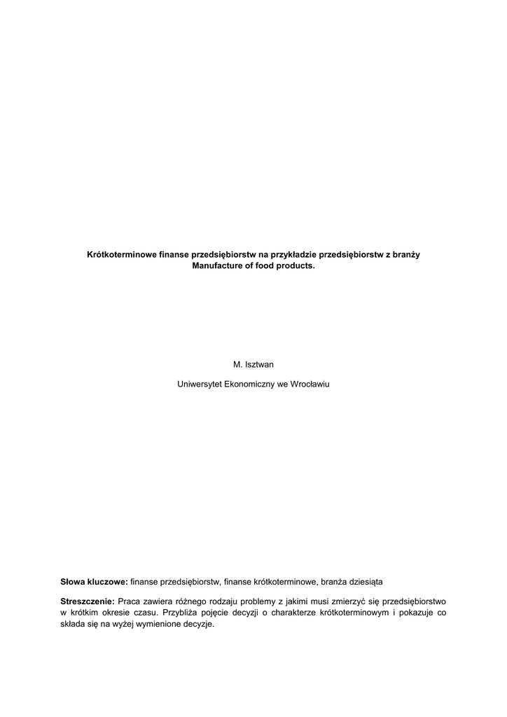 Krótkoterminowe finanse przedsiębiorstw na przykładzie