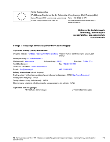 Unia Europejska Publikacja Suplementu do Dziennika Urzędowego Unii Europejskiej 2, rue Mercier, 2985 Luxembourg, Luksemburg Faks: +352 29 29 42 670 E-mail: [email protected] Informacje i formularze on-line: http:// simap.europa.eu Ogłoszenie dodatkowych informacji, informacje o niekompletnej procedurze lub sprostowanie Sekcja I: Instytucja zamawiająca/podmiot zamawiający I.1) Nazwa, adresy i punkty kontaktowe: Oficjalna nazwa: Fundacja Rozwoju Systemu Edukacji Krajowy numer identyfikacyjny: (jeżeli jest znany) _____ Adres pocztowy: ul. Mokotowska 43 Miejscowość: Warszawa Kod pocztowy: 00-551 Punkt kontaktowy: _____ Państwo: Polska (PL) Tel.: +48 224631099 Osoba do kontaktów: Sława Malinowska E-mail: [email protected] +48 224631025 Adresy internetowe: (jeżeli dotyczy) Ogólny adres instytucji zamawiającej/ podmiotu zamawiającego: (URL) http://www.frse.org.pl Adres profilu nabywcy: (URL) _____ Dostęp elektroniczny do informacji: (URL) _____ Elektroniczne składanie ofert i wniosków o dopuszczenie do udziału: (URL) _____ I.2) Rodzaj zamawiającego: Instytucja zamawiająca Podmiot zamawiający PL Formularz standardowy 14 - Ogłoszenie dodatkowych informacji, informacje o niekompletnej procedurze lub sprostowanie 1/5 Sekcja II: Przedmiot zamówienia II.1.1) Nazwa nadana zamówieniu: ZP-52/FRSE/2011 Świadczenie usługi hotelarsko-gastronomicznej w tym wynajem sal konferencyjnych z wyposażeniem podczas szkoleń dla młodzieży dla programów działających w ramach FRSE II.1.2) Krótki opis zamówienia lub zakupu:(podano w pierwotnym ogłoszeniu) 1. Przedmiotem zamówienia jest świadczenie usługi hotelarsko-gastronomicznej w tym wynajem sal konferencyjnych z wyposażeniem podczas szkoleń dla młodzieży dla programów działających w ramach FRSE. 2. Opis przedmiotu zamówienia stanowi Załącznik Nr 2, 2a do SIWZ. 3. Wszystkie wskazane w opisie terminy są terminami planowanymi, mogą ulec niewielkiej zmianie. II.1.3) Wspólny Słownik Zamówień (CPV) Główny przedmiot Dodatkowe przedmioty Słownik główny 55120000 55100000 55300000 Słownik uzupełniający (jeżeli dotyczy) PL Formularz standardowy 14 - Ogłoszenie dodatkowych informacji, informacje o niekompletnej procedurze lub sprostowanie 2/5 Sekcja IV: Procedura IV.1)Rodzaj procedury(podano w pierwotnym ogłoszeniu) Otwarta Ograniczona Ograniczona przyspieszona Negocjacyjna Negocjacyjna przyspieszona Dialog konkurencyjny Negocjacyjna z uprzednim ogłoszeniem Negocjacyjna bez uprzedniego ogłoszenia Negocjacyjna z publikacją ogłoszenia o zamówieniu Negocjacyjna bez publikacji ogłoszenia o zamówieniu Udzielenie zamówienia bez uprzedniej publikacji ogłoszenia o zamówieniu w Dzienniku Urzędowym Unii Europejskiej IV.2)Informacje administracyjne IV.2.1)Numer referencyjny: (podano w pierwotnym ogłoszeniu) ZP-52/FRSE/2011 IV.2.2)Dane referencyjne ogłoszenia w przypadku ogłoszeń przesłanych drogą elektroniczną: Pierwotne ogłoszenie przesłane przez eNotices TED eSender Login: ENOTICES_FundacjaFRSE Dane referencyjne ogłoszenia: 2011-170174 rok i numer dokumentu IV.2.3)Ogłoszenie, którego dotyczy niniejsza publikacja: Numer ogłoszenia w Dz.U.: 2011/S 238-384992 z dnia: 10/12/2011 (dd/mm/rrrr) IV.2.4)Data wysłania pierwotnego ogłoszenia: 07/12/2011 (dd/mm/rrrr) PL Formularz standardowy 14 - Ogłoszenie dodatkowych informacji, informacje o niekompletnej procedurze lub sprostowanie 3/5 Sekcja VI: Informacje uzupełniające VI.1) Ogłoszenie dotyczy: Procedury niepełnej Sprostowania Informacji dodatkowych VI.2) Informacje na temat niepełnej procedury udzielenia zamówienia: Postępowanie o udzielenie zamówienia zostało przerwane Postępowanie o udzielenie zamówienia uznano za nieskuteczne Zamówienia nie udzielono Zamówienie może być przedmiotem ponownej publikacji VI.3) Informacje do poprawienia lub dodania : VI.3.1) Zmiana oryginalnej informacji podanej przez instytucję zamawiającą Publikacja w witrynie TED niezgodna z oryginalną informacją, przekazaną przez instytucję zamawiającą Oba przypadki VI.3.2) W ogłoszeniu pierwotnym W odpowiedniej dokumentacji przetargowej (więcej informacji w odpowiedniej dokumentacji przetargowej) W obu przypadkach (więcej informacji w odpowiedniej dokumentacji przetargowej) VI.3.3) Tekst, który należy poprawić w pierwotnym ogłoszeniu Miejsce, w którym znajduje się Zamiast: zmieniany tekst: Powinno być: VI.3.4) Daty, które należy poprawić w pierwotnym ogłoszeniu Miejsce, w którym znajdują się Zamiast: zmieniane daty: 17/01/2012 Godzina: 10:00 IV.3.4) (dd/mm/rrrr) Powinno być: 20/01/2012 Godzina: 10:00 (dd/mm/rrrr) Miejsce, w którym znajdują się zmieniane daty: IV.3.8) Powinno być: 20/01/2012 Godzina: 10:15 (dd/mm/rrrr) Zamiast: 17/01/2012 Godzina: 10:15 (dd/mm/rrrr) VI.3.5) Adresy i punkty kontaktowe, które należy poprawić VI.3.6) Tekst, który należy dodać do pierwotnego ogłoszenia Miejsce, w którym należy dodać tekst: Tekst do dodania: VI.4) Inne dodatkowe informacje: Na podstawie art. 22 ust. 4 Zamawiający dokonuje zmiany kryterium oceny ofert dotyczącego właściwościi wykonawcy. Zamawiający zmienia kryteria oceny ofert w następujący sposób: 1) kryterium cena – waga 90% zgodnie ze wzorem: Pi = 90 PL Formularz standardowy 14 - Ogłoszenie dodatkowych informacji, informacje o niekompletnej procedurze lub sprostowanie 4/5 gdzie: Pi - liczba punktów jakie otrzyma oferta badana za kryterium "cena "; Cmin - najniższa cena brutto wykonania przedmiotu zamówienia spośród wszystkich ważnych i nie odrzuconych ofert; Ci - cena brutto oferty badanej; 2) kryterium dysponowania ośrodkiem szkoleniowym – waga 10% Zamawiający przyzna 10 pkt. za dysponowanie (zarządzanie) przez wykonawcę w przeciągu roku przed terminem składania ofert ośrodkiem, w którym wykonawca oferuje wykonywanie zamówienia. Dysponowanie musi mieć charakter ciągły w tym okresie. Wykonawca może być właścicielem ośrodka, korzystać z niego n