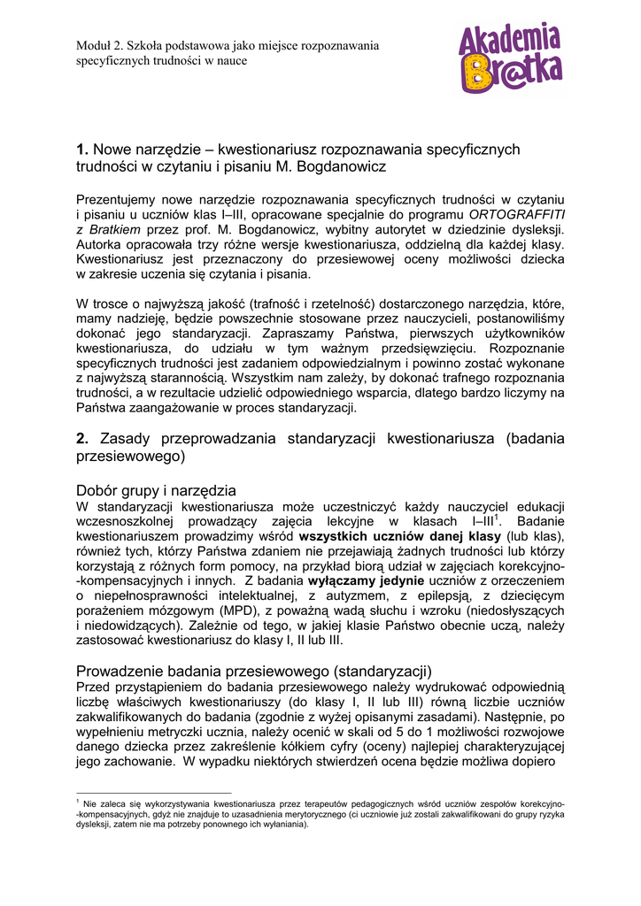Moduł 2. Szkoła podstawowa jako miejsce rozpoznawania specyficznych trudności w nauce 1. Nowe narzędzie – kwestionariusz rozpoznawania specyficznych trudności w czytaniu i pisaniu M. Bogdanowicz Prezentujemy nowe narzędzie rozpoznawania specyficznych trudności w czytaniu i pisaniu u uczniów klas I–III, opracowane specjalnie do programu ORTOGRAFFITI z Bratkiem przez prof. M. Bogdanowicz, wybitny autorytet w dziedzinie dysleksji. Autorka opracowała trzy róŜne wersje kwestionariusza, oddzielną dla kaŜdej klasy. Kwestionariusz jest przeznaczony do przesiewowej oceny moŜliwości dziecka w zakresie uczenia się czytania i pisania. W trosce o najwyŜszą jakość (trafność i rzetelność) dostarczonego narzędzia, które, mamy nadzieję, będzie powszechnie stosowane przez nauczycieli, postanowiliśmy dokonać jego standaryzacji. Zapraszamy Państwa, pierwszych uŜytkowników kwestionariusza, do udziału w tym waŜnym przedsięwzięciu. Rozpoznanie specyficznych trudności jest zadaniem odpowiedzialnym i powinno zostać wykonane z najwyŜszą starannością. Wszystkim nam zaleŜy, by dokonać trafnego rozpoznania trudności, a w rezultacie udzielić odpowiedniego wsparcia, dlatego bardzo liczymy na Państwa zaangaŜowanie w proces standaryzacji. 2. Zasady przeprowadzania standaryzacji kwestionariusza (badania przesiewowego) Dobór grupy i narzędzia W standaryzacji kwestionariusza moŜe uczestniczyć kaŜdy nauczyciel edukacji wczesnoszkolnej prowadzący zajęcia lekcyjne w klasach I–III1. Badanie kwestionariuszem prowadzimy wśród wszystkich uczniów danej klasy (lub klas), równieŜ tych, którzy Państwa zdaniem nie przejawiają Ŝadnych trudności lub którzy korzystają z róŜnych form pomocy, na przykład biorą udział w zajęciach korekcyjno-kompensacyjnych i innych. Z badania wyłączamy jedynie uczniów z orzeczeniem o niepełnosprawności intelektualnej, z autyzmem, z epilepsją, z dziecięcym poraŜeniem mózgowym (MPD), z powaŜną wadą słuchu i wzroku (niedosłyszących i niedowidzących). ZaleŜnie od tego, w jakiej klasie Państwo obecnie uczą, naleŜy zastosować kwestionariusz do klasy I, II lub III. Prowadzenie badania przesiewowego (standaryzacji) Przed przystąpieniem do badania przesiewowego naleŜy wydrukować odpowiednią liczbę właściwych kwestionariuszy (do klasy I, II lub III) równą liczbie uczniów zakwalifikowanych do badania (zgodnie z wyŜej opisanymi zasadami). Następnie, po wypełnieniu metryczki ucznia, naleŜy ocenić w skali od 5 do 1 moŜliwości rozwojowe danego dziecka przez zakreślenie kółkiem cyfry (oceny) najlepiej charakteryzującej jego zachowanie. W wypadku niektórych stwierdzeń ocena będzie moŜliwa dopiero 1 Nie zaleca się wykorzystywania kwestionariusza przez terapeutów pedagogicznych wśród uczniów zespołów korekcyjno-kompensacyjnych, gdyŜ nie znajduje to uzasadnienia merytorycznego (ci uczniowie juŜ zostali zakwalifikowani do grupy ryzyka dysleksji, zatem nie ma potrzeby ponownego ich wyłaniania). Moduł 2. Szkoła podstawowa jako miejsce rozpoznawania specyficznych trudności w nauce po wykonaniu zadania przez dziecko. W przypadkach wątpliwych warto swoją ocenę skonsultować z innymi nauczycielami lub rodzicami dziecka. Wynik otrzymujemy przez zsumowanie wszystkich ocen. Na zakończenie porównujemy wynik uzyskany przez danego ucznia z tabelą interpretacji wyników i wpisujemy w rubryce z wynikiem jego interpretację (ocena dobra lub ocena niska). Średnią ocenę ucznia liczymy, dzieląc otrzymany wynik przez liczbę stwierdzeń (39 dla klasy I, 37 dla klasy II, 31 dla klasy III). 3. Interpretacja wyników Wynik 118–195 39– 117 Wynik 111 –185 37 – 110 Wynik 93 - 155 31 – 92 Kwestionariusz rozpoznawania specyficznych trudności w czytaniu i pisaniu M. Bogdanowicz – klasa I Interpretacja oceny moŜliwości rozwojowych oraz czytania i pisania tempo nauki w normie, ocena dobra brak zagroŜenia niepowodzeniami szkolnymi prawdopodobne ocena niska niepowodzenia w nauce czytania i pisania, w tym ryzyko dysleksji rozwojowej Kwestionariusz rozpoznawania specyficznych trudności w czytaniu i pisaniu M. Bogdanowicz – klasa II Interpretacja oceny moŜliwości rozwojowych oraz czytania i pisania tempo nauki w normie, ocena dobra brak zagroŜenia niepowodzeniami szkolnymi niepowodzenia w nauce ocena niska czytania i pisania, w tym ryzyko dysleksji rozwojowej Kwestionariusz rozpoznawania specyficznych trudności w czytaniu i pisaniu M. Bogdanowicz – klasa III Interpretacja oceny moŜliwości rozwojowych oraz czytania i pisania tempo nauki w normie, ocena dobra brak zagroŜenia niepowodzeniami szkolnymi niepowodzenia w nauce ocena niska czytania i pisania, w tym dysleksja rozwojowa Moduł 2. Szkoła podstawowa jako miejsce rozpoznawania specyficznych trudności w nauce 4. Zakwalifikowanie do odpowiedniej pomocy W przypadku stwierdzenia niskiego wyniku, szczególnie gdy ujawnia się niski poziom funkcji poznawczych i ruchowych (w ocenianych funkcjach przewaŜa średnia ocena 1–2) oraz gdy jednocześnie występują nasilone trudności w czytaniu, konieczne jest udzielenie dziecku pomocy w postaci zajęć wspomagających rozwój, na przykład korekcyjno-kompensacyjnych. Mają one na celu podniesienie poziomu sprawności ocenianych funkcji oraz poprawienie umiejętności czytania i pisania. Z uwagi na fakt, Ŝe badanie przesiewowe w ramach Akademii Bratka prowadzimy w drugiej połowie roku szkolnego (prawidłowo powinno się odbyć w pierwszych dwóch miesiącach nauki), prawdopodobnie niemoŜliwe będzie udzielenie uczniowi oczekiwanej pomocy. W takim wypadku zalecenia wynikające z przeprowadzonego badania naleŜy wdroŜyć w Ŝycie od nowego roku szkolnego. Jeśli pomoc została udzielona, to zyskamy potwierdzenie, Ŝe nasze działania były słuszne. 5. Zakończenie standaryzacji Ostatnim etapem badania jest wprowadzenie wszystkich danych (oprócz imienia i nazwiska) kaŜdego ucznia, uzyskan