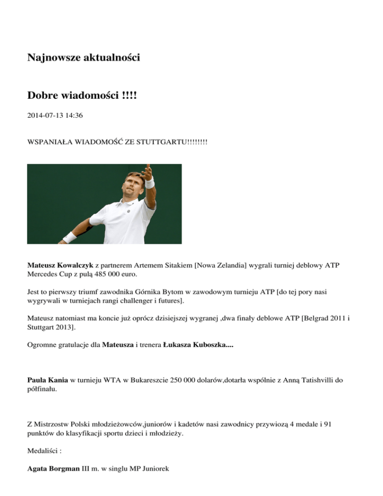Najnowsze aktualności Dobre wiadomości !!!! 2014-07-13 14:36 WSPANIAŁA WIADOMOŚĆ ZE STUTTGARTU!!!!!!!! Mateusz Kowalczyk z partnerem Artemem Sitakiem [Nowa Zelandia] wygrali turniej deblowy ATP Mercedes Cup z pulą 485 000 euro. Jest to pierwszy triumf zawodnika Górnika Bytom w zawodowym turnieju ATP [do tej pory nasi wygrywali w turniejach rangi challenger i futures]. Mateusz natomiast ma koncie już oprócz dzisiejszej wygranej ,dwa finały deblowe ATP [Belgrad 2011 i Stuttgart 2013]. Ogromne gratulacje dla Mateusza i trenera Łukasza Kuboszka.... Paula Kania w turnieju WTA w Bukareszcie 250 000 dolarów,dotarła wspólnie z Anną Tatishvilli do półfinału. Z Mistrzostw Polski młodzieżowców,juniorów i kadetów nasi zawodnicy przywiozą 4 medale i 91 punktów do klasyfikacji sportu dzieci i młodzieży. Medaliści : Agata Borgman III m. w singlu MP Juniorek Agata Borgman i Karol Krawczyński II m. mikst MP Juniorów Iga Odrzywołek II m. w deblu Młodzieżowe MP Iga Odrzywołek III m. w mikście Młodzieżowe MP. Do tego warto dodać dwa ćwierćfinały w singlu Emma Zakordoniec OOM kadetek [ma 14 lat!!] i Karol Krawczyński na MP Juniorów. Jak widać praca w naszym klubie zasługuje na uwagę ,zarówno na polu szkolenia jak i organizacji imprez[ Niedawno zakończył się turniej międzynarodowy ITF Juniors EURO HOLDING BYTOM CUP ,a za niedługo czekają nas dwa kolejne turnieje międzynarodowe ITF SENIORS CZARNE DIAMENTY oraz ATP FUTURES CARBO KOKS BYTOM OPEN.] WARTO ZOSTAĆ PARTNEREM WZOROWEGO KLUBU TENISOWEGO-GÓRNIK BYTOM!!!!!!!!! ZAPRASZAMY DO WSPÓŁPRACY... Dariusz Łukaszewski -prezes Śląskiego Związku Tenisowego i prezes d/s sportowych Górnik Bytom...501-184-225 Powered by TCPDF (www.tcpdf.org)
