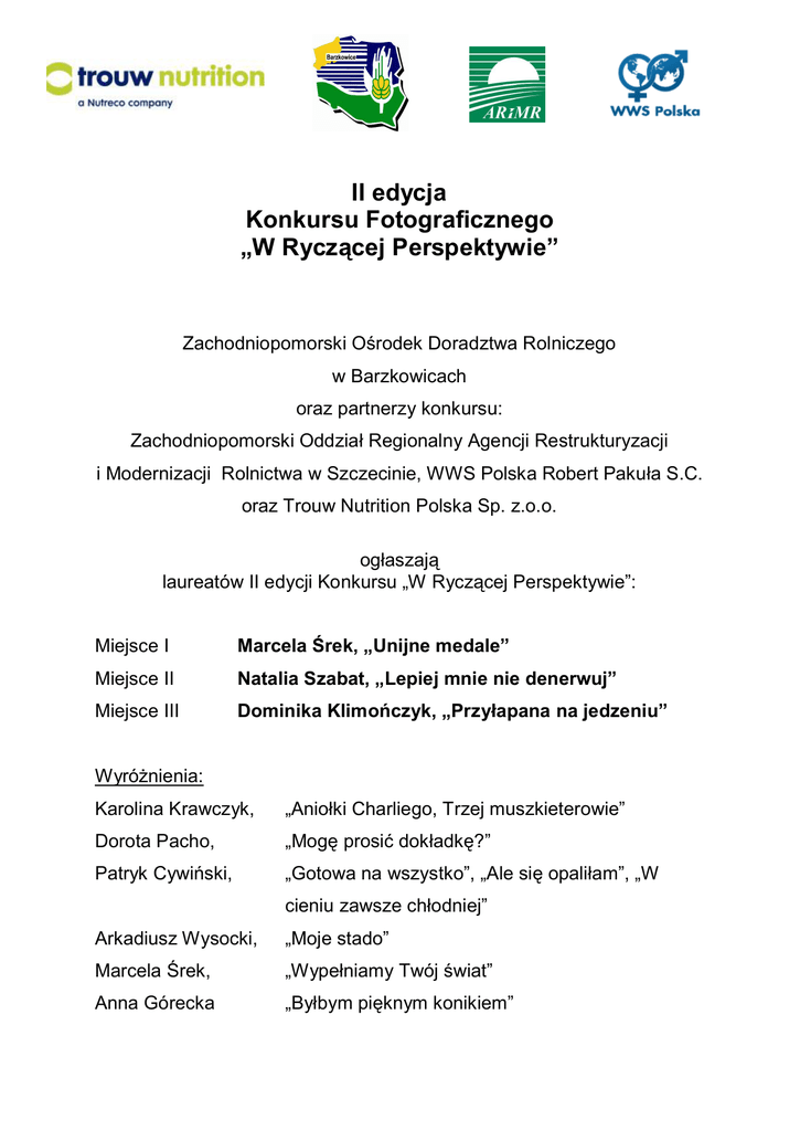 II edycja Konkursu Fotograficznego „W Rycz cej Perspektywie” Zachodniopomorski O rodek Doradztwa Rolniczego w Barzkowicach oraz partnerzy konkursu: Zachodniopomorski Oddzia Regionalny Agencji Restrukturyzacji i Modernizacji Rolnictwa w Szczecinie, WWS Polska Robert Paku a S.C. oraz Trouw Nutrition Polska Sp. z.o.o. og aszaj laureatów II edycji Konkursu „W Rycz cej Perspektywie”: Miejsce I Marcela rek, „Unijne medale” Miejsce II Natalia Szabat, „Lepiej mnie nie denerwuj” Miejsce III Dominika Klimo czyk, „Przy apana na jedzeniu” Wyró nienia: Karolina Krawczyk, „Anio ki Charliego, Trzej muszkieterowie” Dorota Pacho, „Mog prosi dok adk ?” Patryk Cywi ski, „Gotowa na wszystko”, „Ale si opali am”, „W cieniu zawsze ch odniej” Arkadiusz Wysocki, „Moje stado” Marcela rek, „Wype niamy Twój wiat” Anna Górecka „By bym pi knym konikiem” W konkursie udzia wzi li uczniowie szkó ponadgimnazjalnych z województwa zachodniopomorskiego. Nades anych zosta o 42 prac fotograficznych. Prace konkursowe przedstawia y byd o (ras mlecznych lub mi snych), w niecodziennych uj ciach na tle przyrodniczym, takim jak ki, pastwiska, lasy lub krajobraz polskiej wsi. Rozdanie nagród nast pi podczas XXVII Barzkowickich Targów Rolnych „AGRO POMERANIA 2014” w Barzkowicach w dniu 14 wrze nia 2014 roku.