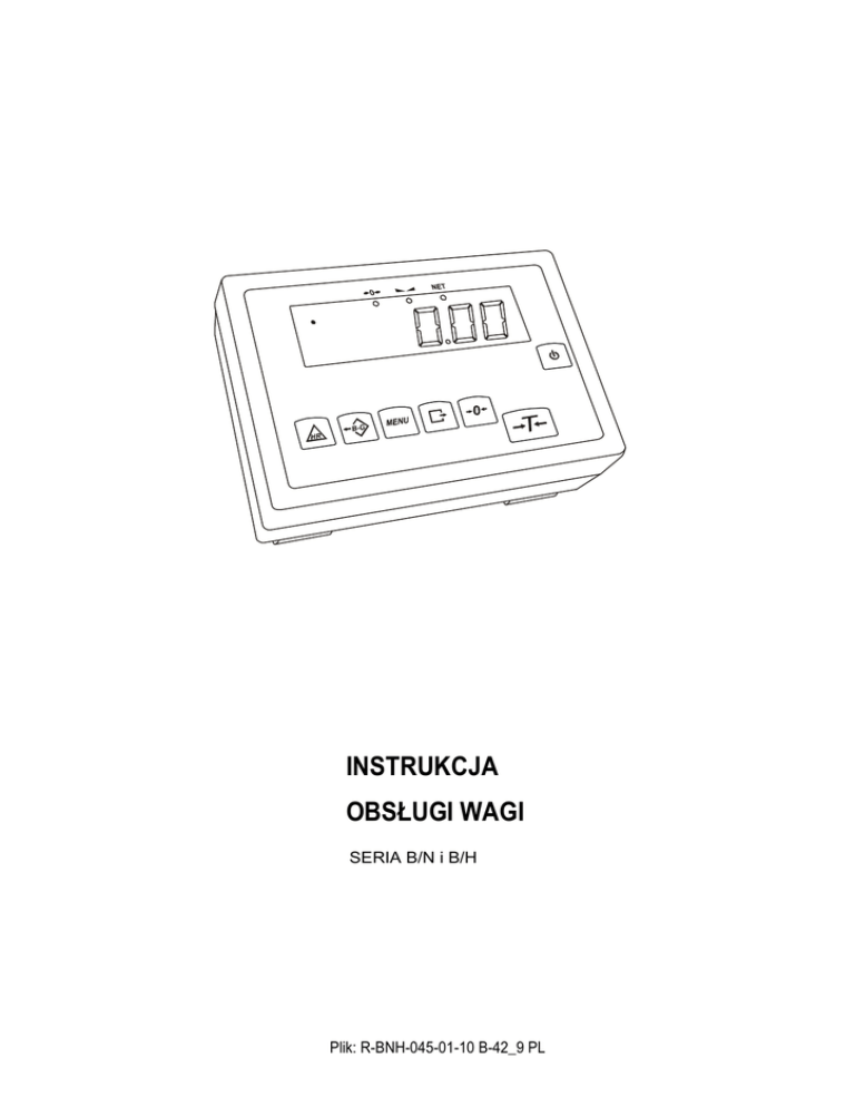 INSTRUKCJA OBSŁUGI WAGI SERIA B/N i B/H Plik: R-BNH-045-01-10 B-42_9 PL 2 INSTRUKCJA OBSŁUGI _____________________________________________________________________________________________________________________ Spis treści: 1. Opis ogólny.................................................................................................................. 3 2. Kompletacja................................................................................................................. 3 3. Dane techniczne.......................................................................................................... 4 4. Klawisze i wskaźniki wagi ............................................................................................ 5 5. Zasady bezpieczeństwa .............................................................................................. 6 6. Zasady postępowania ze zuŜytą wagą ........................................................................ 6 7. Przygotowanie wagi do pracy ...................................................................................... 7 8. Start wagi..................................................................................................................... 8 9. Zasady eksploatacji ..................................................................................................... 9 10. Sprawdzenie wagi...................................................................................................... 11 11. Adjustacja wagi.......................................................................................................... 11 12. Połączenie z komputerem lub drukarką (opcja) ......................................................... 11 13. Opis funkcji wagi........................................................................................................ 15 14. Zwykłe waŜenie ......................................................................................................... 16 15. WaŜenie z tarowaniem .............................................................................................. 16 16. Powiększanie rozdzielczości wagi ............................................................................. 16 17. Funkcja autozerowania (F..-AUt) .............................................................................. 17 18. Funkcja liczenia sztuk (F..-PCS)................................................................................ 18 19. Automatyczny tryb transmisji dla drukarki (F..-LPt).................................................... 19 20. Funkcja ustawiania parametrów portu szeregowego (F..-rS) ..................................... 20 21. Funkcja wpisywania tary (F..-tAr)............................................................................... 21 22. Aktualizacja menu (F..-ACt) ....................................................................................... 23 23. Konserwacja i usuwanie drobnych uszkodzeń........................................................... 24 Deklaracja zgodności ......................................................................................................... 25 Dodatek A .......................................................................................................................... 26 INSTRUKCJA OBSŁUGI 3 _____________________________________________________________________________________________________________________ 1. Opis ogólny Wagi platformowe serii B/N przeznaczone do pracy w warunkach przemysłowych wymagających odporności na wodę i detergenty, wagi serii B/H – w warunkach wymagających odporności na sole i kwasy. Stopień ochronny: - seria B/N - miernik IP65, czujnik IP67 - seria B/H – miernik IP65, czujnik IP68 Wagi produkowane są w dwóch wykonaniach: z wyświetlaczem LED (wykonanie podstawowe) oraz wyświetlaczem LCD (opcja na zamówienie). Opcja dwuzakresowa została opisana w dodatku A. Wszystkie wagi są sprawdzone pod względem metrologicznym. Zgodnie z zamówieniem wagi mogą być wzorcowane lub legalizowane. Wagi zalegalizowane posiadają następujące cechy legalizacyjne: - pieczęci zabezpieczające umieszczone na mierniku wagi i wkręcie mocującym czujnik wagi, znajdującym się pod szalką, - znaki Urzędu Miar i zielony znak metrologiczny naklejony na tabliczce firmowej. Ponowna legalizacja wag jest wymagana z chwilą naruszenia pieczęci zabezpieczających lub po upływie okresu 3 lat licząc od 1 grudnia roku pierwszej legalizacji. W celu legalizacji ponownej naleŜy skontaktować się z autoryzowanym serwisem AXIS. Klasyfikacja wag wg PKWiU: 29.24.23. Certyfikaty: Certyfikat zatwierdzenia typu wagi nr PL 04 022 Świadectwo Certyfikat systemu jakości ISO jakości zdrowotnej DIN EN ISO 9001:2000 nr Hś/06458/01 nr 78 100 6386 2. Kompletacja Podstawowy zestaw obejmuje: 1. Wagę 2. Instrukcję obsługi 3. Gwarancję 4. Zasilacz ZN12V/1,5A (tylko wagi z zasilaniem akumulatorowym) 5. Ładowarkę do akumulatora PA6V (tylko wagi z zasilaniem akumulatorowym) 4 INSTRUKCJA OBSŁUGI _____________________________________________________________________________________________________________________ 3. Dane techniczne Typ wagi ObciąŜenie maksymalne ObciąŜenie minimalne Działka odczytowa (d) Działka legalizacyjna (e) Klasa dokładności Temperatura pracy Zakres tarowania Czas waŜenia Wymiary platformy Zasilanie Zasil. wewnętrzne (opcja) Czas pracy z akumulator. Masa wagi Legalizacja WE Typ wagi ObciąŜenie maksymalne ObciąŜenie minimalne Działka odczytowa (d) Działka legalizacyjna (e) Klasa dokładności Temperatura pracy Zakres tarowania Czas waŜenia Wymiary platformy Zasilanie Zasilanie wewnętrzne Czas pracy z akumulatorem Masa wagi Legalizacja WE B15WN B15WH 15kg 100g 5g *1g B30N B30H 30kg 200g 10g *5g *1g B60N B150N B200N B300N B60H B150H B300H 60kg 150kg 200kg 300kg 400g 1kg 1kg 2kg 20g 50g 50g 100g *10g *10g *10g *10g *5g *2g 5g 10g 20g 50g 50g 100g III +5÷35°C -15kg -30kg -60kg 