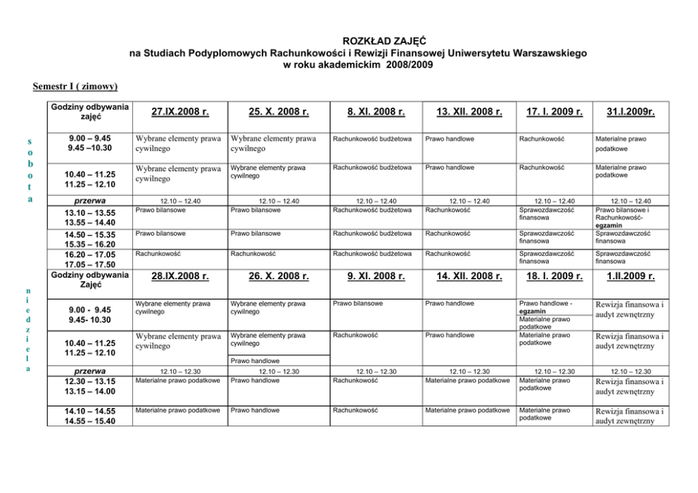 ROZKŁAD ZAJĘĆ na Studiach Podyplomowych Rachunkowości i Rewizji Finansowej Uniwersytetu Warszawskiego w roku akademickim 2008/2009 Semestr I ( zimowy) s o b o t a n i e d z i e l a Godziny odbywania zajęć 27.IX.2008 r. 9.00 – 9.45 9.45 –10.30 Wybrane elementy prawa cywilnego Wybrane elementy prawa cywilnego Rachunkowość budżetowa Wybrane elementy prawa cywilnego Wybrane elementy prawa cywilnego Rachunkowość budżetowa Prawo handlowe Rachunkowość Materialne prawo podatkowe 12.10 – 12.40 Prawo bilansowe 12.10 – 12.40 Prawo bilansowe 12.10 – 12.40 Rachunkowość budżetowa 12.10 – 12.40 Rachunkowość 12.10 – 12.40 Sprawozdawczość finansowa Prawo bilansowe Prawo bilansowe Rachunkowość budżetowa Rachunkowość Sprawozdawczość finansowa 12.10 – 12.40 Prawo bilansowe i Rachunkowośćegzamin Sprawozdawczość finansowa Rachunkowość Rachunkowość Rachunkowość budżetowa Rachunkowość Sprawozdawczość finansowa Sprawozdawczość finansowa 10.40 – 11.25 11.25 – 12.10 przerwa 13.10 – 13.55 13.55 – 14.40 14.50 – 15.35 15.35 – 16.20 16.20 – 17.05 17.05 – 17.50 Godziny odbywania Zajęć 9.00 - 9.45 9.45- 10.30 10.40 – 11.25 11.25 – 12.10 28.IX.2008 r. 25. X. 2008 r. 26. X. 2008 r. 8. XI. 2008 r. 13. XII. 2008 r. Prawo handlowe 17. I. 2009 r. Rachunkowość 31.I.2009r. Materialne prawo podatkowe 9. XI. 2008 r. 14. XII. 2008 r. Wybrane elementy prawa cywilnego Wybrane elementy prawa cywilnego Prawo bilansowe Prawo handlowe Wybrane elementy prawa cywilnego Wybrane elementy prawa cywilnego Rachunkowość Prawo handlowe 18. I. 2009 r. 1.II.2009 r. Prawo handlowe egzamin Materialne prawo podatkowe Materialne prawo podatkowe Rewizja finansowa i audyt zewnętrzny 12.10 – 12.30 Rewizja finansowa i audyt zewnętrzny Prawo handlowe przerwa 12.30 – 13.15 13.15 – 14.00 12.10 – 12.30 Materialne prawo podatkowe 12.10 – 12.30 Prawo handlowe 12.10 – 12.30 Rachunkowość 12.10 – 12.30 Materialne prawo podatkowe 12.10 – 12.30 Materialne prawo podatkowe 14.10 – 14.55 14.55 – 15.40 Materialne prawo podatkowe Prawo handlowe Rachunkowość Materialne prawo podatkowe Materialne prawo podatkowe Rewizja finansowa i audyt zewnętrzny Rewizja finansowa i audyt zewnętrzny Semestr II (letni) s o b o t a Godziny odbywania zajęć 9.00 – 9.45 9.45 –10.30 Wybrane elementy prawa pracy 14. III. 2009 r. Rachunkowość podatkowa 28. III. 2009 r. Rachunkowość podatkowa 18. IV. 2009 r. Rachunkowość podatkowa - egzamin 16. V. 2009 30.V.2009 r. 27.VI.2009 r. Rachunek kosztów Rachunkowość grup kapitałowych Rachunkowość grup kapitałowych Zobowiązania podatkowe 10.40 – 11.25 11.25 – 12.10 Przerwa 13.10 – 13.55 13.55 – 14.40 14.50 – 15.35 15.35 – 16.20 16.20 – 17.05 17.05 – 17.50 Godziny odbywania zajęć n i e d z i e l a 14. II. 2009 r. 9.00 - 9.45 9.45- 10.30 Wybrane elementy prawa pracy 12.10 – 12.40 Rachunkowość podatkowa Rachunkowość podatkowa Zobowiązania podatkowe Rachunek kosztów Rachunkowość grup kapitałowych Rachunkowość grup kapitałowych 12.10 – 12.40 Controlling finansowy na potrzeby rewizji finansowej 12.10 – 12.40 Postępowanie podatkowe 12.10 – 12.40 Postępowanie podatkowe 12.10 – 12.40 Instrumenty finansowe rynku kapitałowego Controlling finansowy na potrzeby rewizji finansowej Postępowanie podatkowe Postępowanie podatkowe Instrumenty finansowe rynku kapitałowego 12.10 – 12.40 Postępowanie sądowoadministracyjne w sprawach zobowiązań podatkowych Postępowanie sądowoadministracyjne w sprawach zobowiązań podatkowych Zobowiązania podatkowe Controlling finansowy na potrzeby rewizji finansowej Postępowanie podatkowe Seminarium dyplomowe Instrumenty finansowe rynku kapitałowego 15. III. 2009r. 29. III. 2009 r. 19. IV. 2009 r. 12.10 – 12.40 Rachunkowość podatkowa Zobowiązania podatkowe Rachunkowość podatkowa Zobowiązania podatkowe Rachunkowość podatkowa 15. II. 2009 r. Wybrane elementy prawa pracy Międzynarodowe Standardy Rachunkowości i Sprawozdawczości Finansowej Zobowiązania podatkowe Wybrane elementy prawa pracy Międzynarodowe Standardy Rachunkowości i Sprawozdawczości Finansowej Rachunek kosztów Międzynarodowe Standardy Rachunkowości i Sprawozdawczości Finansowej 12.10 – 12.30 Zobowiązania podatkowe 12.10 – 12.30 Seminarium dyplomowe 12.10 – 12.30 Międzynarodowe Standardy Rachunkowości i Sprawozdawczości Finansowej 12.10 – 12.30 Seminarium dyplomowe 12.10 – 12.30 Seminarium dyplomowe Materialne prawo podatkowe- egzamin Zobowiązania podatkowe 10.40 – 11.25 11.25 – 12.10 przerwa 12.30 – 13.15 13.15 – 14.00 17. V. 2009 r. Rachunek kosztów Międzynarodowe Standardy Rachunkowości i Sprawozdawczości Finansowej 31.V.2009 r. Postępowanie sądowoadministracyjne w sprawach zobowiązań podatkowych Postępowanie sądowoadministracyjne w sprawach zobowiązań podatkowych 12.10 – 12.30 Postępowanie sądowoadministracyjne w sprawach zobowiązań podatkowych 28. VI. 2009 r. Instrumenty finansowe rynku kapitałowego Instrumenty finansowe rynku kapitałowego 12.10 – 12.30 Zakończenie roku wręczenie świadectw