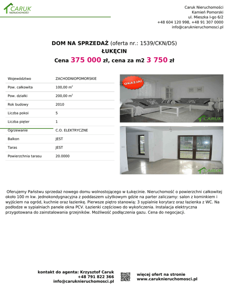 DOM NA SPRZEDAŻ (oferta nr.: 1539/CKN/DS) ŁUKĘCIN Cena 375