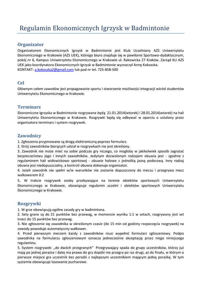 Regulamin Ekonomicznych Igrzysk w Badmintonie Organizator Organizatorem Ekonomicznych Igrzysk w Badmintonie jest Klub Uczelniany AZS Uniwersytetu Ekonomicznego w Krakowie (AZS UEK), którego biuro znajduje się w pawilonie Sportowo-dydaktycznym, pokój nr 6, Kampus Uniwersytetu Ekonomicznego w Krakowie ul. Rakowicka 27 Kraków. Zarząd KU AZS UEK jako koordynatora Ekonomicznych Igrzysk w Badmintonie wyznaczył Annę Kokoszka. KONTAKT: [email protected] lub pod nr tel. 725-858-500 Cel Głównym celem zawodów jest propagowanie sportu i stworzenie możliwości integracji wśród studentów Uniwersytetu Ekonomicznego w Krakowie. Terminarz Ekonomiczne Igrzyska w Badmintonie rozgrywane będą 21.01.2014(wtorek) i 28.01.2014(wtorek) na hali Uniwersytetu Ekonomicznego w Krakowie. Rozgrywki będą się odbywać w oparciu o ustalony przez organizatora terminarz i system rozgrywek. Zawodnicy 1. Zgłoszenia przyjmowane są drogą elektroniczną poprzez formularz. 2. Strój zawodników biorących udział w rozgrywkach nie jest określony. 3. Zawodnik nie może mieć na sobie podczas gry niczego, co mogłoby w jakikolwiek sposób zagrażać bezpieczeństwu jego i innych zawodników. Jedynym dozwolonym rodzajem obuwia jest - zgodnie z regulaminem hali widowiskowo sportowej - obuwie halowe z jednolitą jasną podeszwą. Inny rodzaj obuwia jest niedopuszczalny, a kontroli obuwia dokonuje organizator. 4. Jeżeli zawodnik nie spełni w/w warunków nie zostanie dopuszczony do meczu i przegrywa mecz walkowerem 0:2 5. W trakcie rozgrywek osoby przebywające na terenie obiektów sportowych Uniwersytetu Ekonomicznego w Krakowie, obowiązuje regulamin uczelni i obiektów sportowych Uniwersytetu Ekonomicznego w Krakowie. Rozgrywki 1. W grze obowiązują ogólne zasady gry w badmintona. 2. Sety grane są do 21 punktów bez przewag, w momencie wyniku 1:1 w setach, rozgrywany jest set trzeci do 15 punktów bez przewag. 3. Nie zgłoszenie się zawodnika w określonym czasie (do 15 min od godziny rozpoczęcia rozgrywek) na zawody powoduje automatyczny walkower. 4. Przed pierwszym meczem każdy z zawodników musi wypełnić formularz zgłoszeniowy. Podpis zawodnika na formularzu zgłoszeniowym oznacza jednocześnie akceptację przez niego niniejszego regulaminu. 5. System rozgrywek: „do dwóch przegranych” Przegrywający spada do grupy uczestników, którzy już mają po jednej porażce i dalej ma prawo do gry dopóki nie przegra po raz drugi, aż do finału, w którym o pierwsze miejsce gra uczestnik bez porażki z najlepszym uczestnikiem mającym jedną porażkę. W tym systemie obowiązuje losowanie pucharowe. Ogólne postanowienia 1. Zawodników obowiązuje zasada fair-play 2. Zawodnicy biorą udział w Igrzyskach Ekonomicznych na własną odpowiedzialność. Organizator nie ponosi odpowiedzialności za kontuzje oraz wypadki, jakie mogą ponieść zawodnicy w trakcie rozgrywek. Organizator nie ubezpiecza zawodników biorących udział w rozgrywkach. 3. Organizator wszelkich zmianach poinformuje: mailowo oraz zamieści informacje na wydarzeniu tematycznym facebook „Ekonomiczne Igrzyska: badminton” . 4. Regulamin Ekonomicznych Igrzysk w Badmintonie podpisują wszyscy uczestnicy rozgrywek, co stanowi, że zostali zaznajomieni z w/w regulaminem, regulaminem wynajmu pomieszczeń Hali Sportowej, ogólnym regulaminem obiektu i potwierdzają wolę jego przestrzegania. 5. Wyniki drużyny będą wliczane do klasyfikacji kierunkowej i indywidualnej Ekonomicznych Igrzysk. 6. Regulamin techniczny Ekonomicznych Igrzysk w Badmintonie podlega Ogólnemu Regulaminowi Ekonomicznych Igrzysk UEK. 7. W sprawach nieuregulowanych niniejszym regulaminem rozstrzyga organizator rozgrywek.