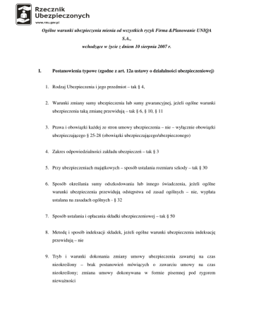 Ogólne warunki ubezpieczenia mienia od wszystkich ryzyk Firma &Planowanie UNIQA S.A., wchodzące w życie z dniem 10 sierpnia 2007 r. I. Postanowienia typowe (zgodne z art. 12a ustawy o działalności ubezpieczeniowej) 1. Rodzaj Ubezpieczenia i jego przedmiot – tak § 4, 2. Warunki zmiany sumy ubezpieczenia lub sumy gwarancyjnej, jeżeli ogólne warunki ubezpieczenia taką zmianę przewidują – tak § 6, § 10, § 11 3. Prawa i obowiązki każdej ze stron umowy ubezpieczenia – nie – wyłącznie obowiązki ubezpieczającego § 25-28 (obowiązki ubezpieczającego/ubezpieczonego) 4. Zakres odpowiedzialności zakładu ubezpieczeń – tak § 3 5. Przy ubezpieczeniach majątkowych – sposób ustalania rozmiaru szkody – tak § 30 6. Sposób określania sumy odszkodowania lub innego świadczenia, jeżeli ogólne warunki ubezpieczenia przewidują odstępstwa od zasad ogólnych – nie, wypłata ustalana na zasadach ogólnych - § 32 7. Sposób ustalania i opłacania składki ubezpieczeniowej – tak § 50 8. Metodę i sposób indeksacji składek, jeżeli ogólne warunki ubezpieczenia indeksację przewidują – nie 9. Tryb i warunki dokonania zmiany umowy ubezpieczenia zawartej na czas nieokreślony – brak postanowień mówiących o zawarciu umowy na czas nieokreślony; zmiana umowy dokonywana w formie pisemnej pod rygorem nieważności 10. Przesłanki i terminy wypowiedzenia umowy przez każdą ze stron, a także tryb i warunki wypowiedzenia, jeżeli ogólne warunki ubezpieczenia przewidują taką możliwość – tak § 23 II. Przedmiot i zakres odpowiedzialności ubezpieczyciela Ubezpieczenie obejmuje mienie stanowiące własność Ubezpieczającego, jak również mienie będące w udokumentowanym posiadaniu ubezpieczającego w związku z prowadzoną przez niego działalnością gospodarczą. Wskazane mienie objęte jest ubezpieczeniem wyłącznie w miejscu określonym w ubezpieczeniu. (§ 4) Tak więc przedmiotem ubezpieczenia pozostają środki trwałe, środki obrotowe, mienie przyjęte od osób trzecich, z wyłączeniem wartości pieniężnych, przyjęte do sprzedaży komisowej lub w celu użytkowania. Ubezpieczenie zawierane jest w systemie „do pierwszego ryzyka” (§ 4 ust. 1 pkt 1 e) oraz pkt 3.) Przedmiotem ubezpieczenia mogą być również nakłady poniesione przez ubezpieczającego na ulepszenia w środkach trwałych. III. Wyłączenia bądź ograniczenia odpowiedzialności ubezpieczyciela Przechodząc do omówienia katalogu wyłączeń trzeba się odnieść przede wszystkim do wyłączeń o charakterze ogólnym. TU FILAR S.A. nie odpowiada za szkody: w inwentarzu, aktach, dokumentach, gruntach Ochroną ubezpieczeniową nie są objęte szkody spowodowane przez ubezpieczonego umyślnie lub w wyniku rażącego niedbalstwa, a także w ten sposób wyrządzone szkody przez osoby pozostające z ubezpieczonym w jednym gospodarstwie domowym (§ 4 ust. 2). Ponadto ochroną nie są objęte szkody: powstałe w wyniku opadów atmosferycznych, jeżeli budynek nie posiadał zadaszenia i zamkniętych otworów okiennych i drzwiowych, w budynkach przeznaczonych do rozbiórki, w budynkach przeznaczonych wyłącznie do prowadzenia działalności gospodarczej, których wartość nie przekracza 500 zł. (§ 7) Nadto wyłączone są spod ochrony: sprzęt audiowizualny, fotograficzny, elektroniczny i komputerowy oraz instrumenty muzyczne, wartości pieniężne, wyroby ze srebra, złota, kamieni szlachetnych i pereł, a także platyny i pozostałych metali z grupy platynowców oraz monety złote i srebrne, a także srebro, złoto, platyna w złomie i sztabach, kamienie szlachetne, półszlachetne, syntetyczne oraz szlachetne substancje organiczne (perły, bursztyny, korale), nie stanowiące wyrobu użytkowego, dzieła sztuki, antyki oraz zbiory kolekcjonerskie, broń wszelkiego rodzaju, paliwa napędowe, przedmioty w ilościach wskazujących na ich przeznaczenie handlowe, przedmioty służące działalności handlowej, usługowej lub produkcyjnej. Zakres ochrony nie obejmuje także szkód powstałych w wyniku: działań wojennych stanu wojennego, zamieszek, rozruchów, trzęsienia ziemi, strajków, i lokautów, terroryzmu, sabotażu itp.(§ 8), a także działania prądu, działania energii atomowej, skażenia radioaktywnego, promieni laserowych i maserowych oraz pola magnetycznego i elektromagnetycznego, zamarzania i rozmarzania wody w urządzeniach i instalacjach, w tym także zalania spowodowanego przez rozmarzanie wody, samoistnego i ciągłego przenikania wód gruntowych. IV. Warto zwrócić uwagę Poza mało korzystnymi klauzulami dotyczącymi ograniczenia odpowiedzialności ubezpieczyciela, w tym wysokiej franszyzy, na uwagę zasługuje fakt dosyć ściśle ujętych definicji zdarzeń losowych, co skutkuje znacznym ograniczeniem rzeczywistego zakresu odpowiedzialności zakładu ubezpieczeń. Zauważyć należy również nie korespondujący z postanowieniami kodeksu cywilnego zapis § 32 ust. 2 i 3 o.w.u. uzależniający wejście nabywcy nieruchomości w miejsce ubezpieczonego od wyrażenia zgody przez ubezpieczyciela. Za postanowienie nietypowe, acz korzystne dla ubezpieczonych jest wprowadzenie numeru telefonu, pod którym każdy, z każdego miejsca w Polsce w stanie poinformować o powstałej szkodzie. V. Postanowienia nietypowe Wśród postanowień nietypowych na uwagę zasługują jedynie umożliwienie ubezpieczonemu poinformowania o powstałej szkodzie drogą telefoniczną pod jednym, ustalonym bezpłatnym numerem telefonu.