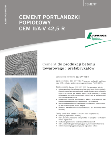 KARTA PRODUKTOWA CEMENT CEMENT PORTLANDZKI POPIOŁOWY CEM II/A-V 42,5 R Cement do produkcji betonu towarowego i prefabrykatów Oznaczenie normowe. CEM II/A-V 42,5 R Opis produktu. CEM II/A-V 42,5 R to cement portlandzki popiołowy klasy 42,5 o składzie zgodnym z wymaganiami normy PN-EN 197-1. Zastosowania. Cement CEM II/A-V 42,5 R przeznaczony jest do: wytwarzania betonów na fundamenty i elementy konstrukcyjne budowli, elementy monolityczne oraz elementy prefabrykowane, przy wykonaniu których wymagana jest wysoka wytrzymałość wczesna, a proces dojrzewania zachodzi w warunkach naturalnych, w podwyższonej lub obniżonej temperaturze wytwarzania betonów komórkowych, lekkich kruszywowych oraz elementów prefabrykowanych wykonanych z tych betonów produkcji prefabrykowanych elementów infrastruktury kanalizacyjnej, np. rur kanalizacyjnych, studni, kręgów produkcji prefabrykatów wibroprasowanych, np. betonowej kostki brukowej Cechy produktu. Cement CEM II/A-V 42,5 R wyróżnia się: wysoką wytrzymałością wczesną dobrą dynamiką narastania wytrzymałości na początku i w dłuższym okresie dojrzewania możliwością dojrzewania w obniżonych temperaturach dobrą urabialnością powstałej przy jego użyciu mieszanki betonowej niskim skurczem przygotowanego przy jego użyciu betonu Korzyści z zastosowania produktu. Użycie cementu CEM II/ A-V 42,5 R: skraca czas budowy oraz proces produkcji prefabrykatów dzięki szybszemu rozformowaniu elementów konstrukcji i prefabrykatów zwiększa bezpieczeństwo konstrukcji podczas wznoszenia oraz po zakończeniu prac budowlanych poprawia urabialność i pompowalność świeżej mieszanki betonowej oraz ogranicza zużycie energii potrzebnej do dobrego zagęszczenia mieszanki zmniejsza ryzyko powstawania wykwitów węglanowych wydłuża okres, w którym możliwe jest prowadzenie prac betoniarskich, dzięki możliwości dojrzewania w obniżonych temperaturach ogranicza koszty związane z nagrzewaniem mieszanki betonowej Warunki stosowania. Cement CEM II/A-V 42,5 R przy dozowaniu zgodnym z europejską normą PN-EN 206-1 oraz polską PN-B-06265 może być stosowany we wszystkich klasach ekspozycji - oddziaływania środowiska na beton, z wyjątkiem klas XA2 oraz XA3 tj. agresji chemicznej wywołanej siarczanami (z wyjątkiem ich pochodzenia morskiego). Zdrowie i bezpieczeństwo. Cement jest sklasyfikowany jako substancja drażniąca. Częste wdychanie dużych ilości pyłu cementowego może powodować ryzyko wystąpienia chorób. Kontakt cementu (suchego lub mokrego) z oczami może powodować poważne i nieodwracalne obrażenia. Dodatkowe informacje, w tym dotyczące kontroli rozpuszczalnego chromu sześciowartościowego, zawarte są w Karcie Charakterystyki dla Cementu zamieszczonej na stronie www.lafarge.pl. Gwarancja. Cement CEM II/A-V 42,5 R objęty jest 60-dniową gwarancją obejmującą utrzymanie normowych parametrów jakościowych i redukcji Cr(VI). Warunki przechowywania. Okres przechowywania w zbiornikach lub silosach nie powinien być dłuższy od okresu gwarantowanego utrzymania parametrów jakościowych. Rekomendacja Techniczna IBDiM RT/2011-02-0079 dla cementu portlandzkiego popiołowego CEM II/A-V 42,5 R dostępna jest na stronie www.lafarge.pl. Właściwości fizyko-chemiczne produktu (wartości średnie)* wytwarzanego w cementowni Kujawy wytwarzanego w cementowni Małogoszcz 4 173 cm2/g 3 556 cm2/g Początek czasu wiązania 171 min 224 min Koniec czasu wiązania 214 min 298 min Wytrzymałość na ściskanie po 2 dniach, badana zgodnie z PN-EN 196-1 27,8 MPa 26,0 MPa Wytrzymałość na ściskanie po 28 dniach, badana zgodnie z PN-EN 196-1 53,1 MPa 54,6 MPa Gęstość właściwa 2,94 g/cm3 2,97 g/cm3 27,5% 29,5% Zawartość siarczanów SO3 2,68% 2,89% Zawartość chlorków Cl 0,069% 0,069% Zawartość alkaliów (eq Na2O) 0,96% 1,01% Powierzchnia właściwa Wodożądność - * Podane wartości są wartościami średnimi za okres od VI do XI 2013 r. Wartości te nie są gwarantowane przez producenta, nie stanowią oferty w rozumieniu przepisów kodeksu cywilnego i nie mogą stanowić podstaw do jakichkolwiek roszczeń. LAFARGE CEMENT SA ul. Warszawska 110 28-366 Małogoszcz 01.2014 www.lafarge.pl Telefony Doradztwo techniczne tel. +48 41 248 75 33