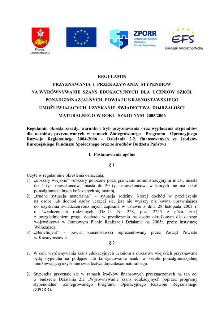 REGULAMIN PRZYZNAWANIA I PRZEKAZYWANIA STYPENDIÓW NA WYRÓWNYWANIE SZANS EDUKACYJNYCH DLA UCZNIÓW SZKÓŁ PONADGIMNAZJALNYCH POWIATU KRASNOSTAWSKIEGO UMOŻLIWIAJĄCYCH UZYSKANIE ŚWIADECTWA DOJRZAŁOŚCI MATURALNEGO W ROKU SZKOLNYM 2005/2006 Regulamin określa zasady, warunki i tryb przyznawania oraz wypłacania stypendiów dla uczniów, przyznawanych w ramach Zintegrowanego Programu Operacyjnego Rozwoju Regionalnego 2004-2006 – Działania 2.2, finansowanych ze środków Europejskiego Funduszu Społecznego oraz ze środków Budżetu Państwa. I. Postanowienia ogólne §1 Użyte w regulaminie określenia oznaczają: 1) „obszary wiejskie” –obszary położone poza granicami administracyjnymi miast, miasta do 5 tys. mieszkańców, miasta do 20 tys. mieszkańców, w których nie ma szkół ponadgimnazjalnych kończących się maturą, 2) „trudna sytuacja materialna” – sytuacja rodziny, której dochód w przeliczeniu na osobę lub dochód osoby uczącej się, jest nie wyższy niż kwota uprawniająca do uzyskania świadczeń rodzinnych zapisana w ustawie z dnia 28 listopada 2003 r. o świadczeniach rodzinnych (Dz. U. Nr 228, poz. 2255 z późn. zm.) z uwzględnieniem progu dochodu w przeliczeniu na osobę określonym dla danego województwa w Ramowym Planie Realizacji Działania na 2005r. przez Instytucję Wdrażającą, 3) „Beneficjent” – powiat krasnostawski reprezentowany przez Zarząd Powiatu w Krasnymstawie. §2 1. W celu wyrównywania szans edukacyjnych uczniom z obszarów wiejskich przyznawane będą stypendia na podjęcie lub kontynuowanie nauki w szkole ponadgimnazjalnej umożliwiającej uzyskanie świadectwa dojrzałości/maturalnego. 2. Stypendia przyznaje się w ramach środków finansowych przeznaczonych na ten cel w budżecie Działania 2.2 „Wyrównywanie szans edukacyjnych poprzez programy stypendialne” Zintegrowanego Programu Operacyjnego Rozwoju Regionalnego (ZPORR). §3 Regulamin przyznawania i przekazywania stypendiów, jest zgodny z zapisami Ramowego Planu Realizacji Działania na rok 2005 przyjętego przez Urząd Marszałkowski Województwa Lubelskiego. §4 1. Stypendia, o których mowa w § 2 przyznawane są przez szkolną komisję ds. pomocy materialnej, zwaną dalej „komisją” na wniosek ucznia. 2. W skład komisji, o której mowa w ust. 1 może wchodzić przedstawiciel Beneficjenta. 3. Lista stypendystów podlega zatwierdzeniu przez Dyrektora szkoły. 4. Komisję na okres roku szkolnego, powołuje Dyrektor szkoły. II. Formy pomocy §5 1. Stypendia są przekazywane na cele szczegółowo określone w ust. 2 niniejszego paragrafu w formie: 1) dofinansowania opłat związanych z pobieraniem nauki, 2) refundacji kosztów związanych z pobieraniem nauki. 2. 1) 2) 3) 4) 5) 6) - Stypendia mogą być przekazane na całkowite lub częściowe pokrycie kosztów: zakwaterowania w internacie, posiłków w stołówce szkoły, internatu oraz inne formy dożywiania, zakupu podręczników do nauki w szkołach ponadgimnazjalnych, związanych z transportem do i ze szkoły, czesnego za naukę w szkole ponadgimnazjalnej niepublicznej posiadającej uprawnienia szkoły publicznej, dodatkowych opłat i wydatków wymaganych obligatoryjnie przez szkołę oraz wynikających z realizacji programowej: odzież sportowa (obuwie, bluzka sportowa, bluzeczka gimnastyczna, strój kąpielowy), odzież robocza, obuwie robocze wymagane przez szkołę, pomoce naukowe, przybory uczniowskie, obuwie „miękkie” obowiązujące na terenie szkoły, koszty kursu prawa jazdy wymaganego przez szkołę. 3. Decyzję o wyborze rodzaju świadczeń podejmują stypendyści. III. Zasady i warunki przyznawania stypendium §6 1. Do ubiegania się o stypendium uprawnieni są uczniowie, którzy spełniają łącznie następujące kryteria: 1) rozpoczynają lub kontynuują naukę w szkołach ponadgimnazjalnych umożliwiających uzyskanie świadectwa dojrzałości/maturalnego, z wyłączeniem szkół dla dorosłych, albo rozpoczynają lub kontynuują naukę w dwuletnich uzupełniających liceach ogólnokształcących lub trzyletnich technikach uzupełniających, z wyłączeniem szkół dla dorosłych, prowadzonych lub dotowanych przez powiat krasnostawski, 2) posiadają stałe zameldowanie na terenach położonych poza granicami administracyjnymi miast, w miastach do 5 tys. mieszkańców lub w miastach do 20 tys. mieszkańców, w których nie ma szkół ponadgimnazjalnych kończących się maturą, 3) pochodzą z rodzin znajdujących się w trudnej sytuacji materialnej, tzn. o dochodzie rodziny w przeliczeniu na osobę lub dochodzie osoby uczącej się nie wyższym niż kwota uprawniająca do uzyskania świadczeń rodzinnych zapisana w ustawie z dnia 28 listopada 2003 r. o świadczeniach rodzinnych (Dz. U. Nr 228, poz. 2255 z późn. zm.), tj. 504 zł netto lub 583 zł netto, gdy członkiem rodziny jest dziecko legitymujące się orzeczeniem o niepełnosprawności lub orzeczeniem o umiarkowanym albo o znacznym stopniu niepełnosprawności, (zmiana dochodu w trakcie roku szkonego nie ma wpływu na prawo do wypłaty stypendium). Dochód rodziny w przeliczeniu na osobę lub dochód osoby uczącej się oraz dochód ucznia samodzielnego finansowo jest naliczany na podstawie art. 5 ust. 1-7 oraz ust.9 i 10 ustawy z dnia 28 listopada 2003r. o świadczeniach rodzinnych (Dz. U. Nr 228, poz. 2255, z póżń. zm.), a w przypadku, gdy rodzina lub osoba ucząca się oraz uczeń samodzielny finansowo utrzymuje się z gospodarstwa rolnego, przyjmuje się za podstawę obliczenia dochodu przeciętny dochód z 1 ha przeliczeniowego, ogłaszany do 30 pażdziernika każdego roku przez GUS, na podstawie przepisów ustawy z dnia 15 listopada 1984rr. o podatku rolnym (Dz. U. z 1993r. Nr. 94 poz. 431, z póżń. zm. ). Zgodnie z metodologią obliczeń przyjętych przez GUS, roczny dochód z 1 ha przeliczeniowego w 2005 r. będzie wyznaczony na podstawie dochodu z 2003r. , tj. będzie wynosił 1086zł. Miesięczną wysok