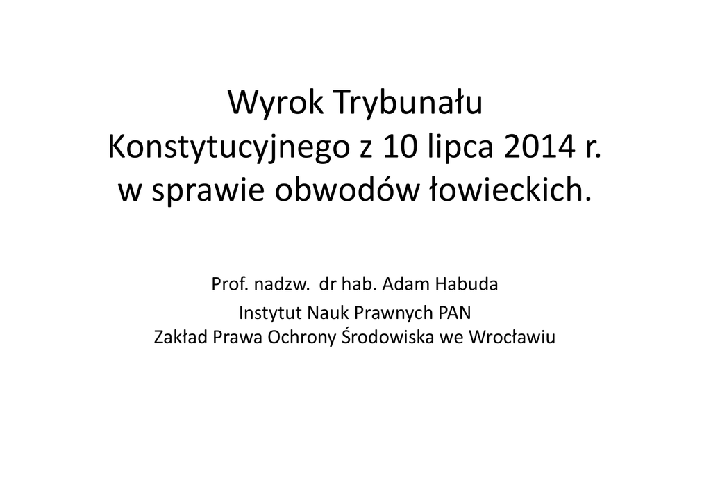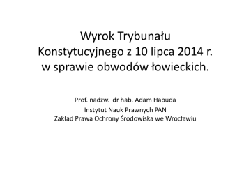 Wyrok Trybunału Konstytucyjnego z 10 lipca 2014 r. w sprawie obwodów łowieckich. Prof. nadzw. dr hab. Adam Habuda Instytut Nauk Prawnych PAN Zakład Prawa Ochrony Środowiska we Wrocławiu Okoliczności, które sprawiły, że Trybunał Konstytucyjny zajął się obwodami łowieckimi Naczelny Sąd Administracyjny rozpoznawał skargę kasacyjną od orzeczenia Wojewódzkiego Sądu Administracyjnego. Przed WSA trafiła skarga na uchwałę sejmiku województwa w sprawie podziału województwa na obwody łowieckie. Nieruchomość jednego ze skarżących weszła w skład obwodu łowieckiego. Właściciel nieruchomości uznał, że jego interes prawny doznał uszczerbku przez naruszenie prawa własności. WSA skargę oddalił, co zaowocowało kolejną skargą – tym razem kasacyjną. Naczelny Sąd Administracyjny uznał, Ŝe w skardze „jest coś na rzeczy”, a swoje wątpliwości skierował do Trybunału Konstytucyjnego w formie pytania prawnego o następującej treści: czy art. 26 i art. 27 ust. 1 ustawy Prawo łowieckie w zakresie, w jakim dopuszczają utworzenie obwodu łowieckiego obejmującego nieruchomość prywatną wbrew woli właściciela nieruchomości, są zgodne z: • art. 64 ust. 1 w związku z art. 64 ust. 3 i art. 31 ust. 3 Konstytucji przez to, Ŝe wprowadzają nieproporcjonalne ograniczenie prawa własności, •art. 64 ust. 3 w związku z art. 31 ust. 3 Konstytucji przez to, Ŝe naruszają istotę prawa własności Argumenty NSA • Po pierwsze, mamy do czynienia z ingerencją w prawo własności. • Po drugie, właścicielowi nie przysługuje rekompensata finansowa, a ponadto następuje obniżenie wartości nieruchomości. • Po trzecie, właściciel w zasadzie nie może rozporządzać nieruchomością i pobierać z niej pożytków, a nieruchomości są wydzierżawiane kołom łowieckim bez jego udziału. Argumenty NSA • Po czwarte, ograniczenia własności nie są wprowadzone ustawą. • Po piąte, uzasadnienie celów ze względu na które wprowadza się ograniczenia są nieproporcjonalne do tych ograniczeń. Nieproporcjonalność z kolei może naruszyć istotę prawa własności. • Po szóste, ustanowienie obwodu łowieckiego wynika z jednostronnego władczego aktu, w wydawaniu którego zainteresowani właściciele nie uczestniczą – nie przysługują im bowiem żadne instrumenty prawne (zgoda, czy choćby opinia). Wstępna ocena Trybunału – dwie kwestie podstawowe • czy na gruncie Konstytucji dopuszczalne jest tworzenie obwodów łowieckich i zmiana ich granic bez żadnych prawnych form udziału właścicieli nieruchomości w tym procesie, w sytuacji, w której objęcie danej nieruchomości granicami obwodu powoduje, że na jej właścicielu ciąży szereg obowiązków, • czy to, że podział na obwody łowieckie oraz zmiana granic tych obwodów są dokonywane w formie uchwały sejmiku województwa nie narusza zasady wyłączności ustawy w ograniczaniu korzystania z konstytucyjnych wolności i praw. Wstępna ocena Trybunału Przedmiotem kontroli Trybunału nie są więc: •sama przez się procedura tworzenia obwodów łowieckich ani •same przez się ograniczenia prawa własności wprowadzone przepisami prawa łowieckiego, lecz przyjęta w ustawie procedura ze względu na automatyczne skutki, które wywołuje jej zastosowanie, a którymi są ograniczenia prawa własności. W argumentacji Trybunału rysuje się pogląd, Ŝe wątpliwości konstytucyjne są uzasadnione. W szczególności sąd konstytucyjny wskazuje: • prawo wykonywania polowania na cudzym gruncie wchodzącym w skład obwodu łowieckiego, niepowiązane z obowiązkami w zakresie informowania właścicieli tych nieruchomości stanowią zatem istotne ograniczenie prawa • właścicielom nieruchomości wchodzących w skład obwodu łowieckiego nie przysługują zarazem żadne środki prawne umożliwiające wyrażenie sprzeciwu wobec wykonywania polowania na gruntach będących przedmiotem ich własności • włączenie nieruchomości do obwodu aktualizuje liczne ograniczenia w zakresie korzystania z własności • wykonywanie polowania na cudzym gruncie wiąże się również z ryzykiem powstania szkód w mieniu (szkody łowieckie). Sedno problemu Sprawą kluczową jest – według Trybunału - ustalenie czy istnieją (a jeśli tak, to jakie) środki prawne umoŜliwiające właścicielowi nieruchomości udział w procesie stanowienia uchwały o podziale województwa na obwody łowieckie lub uchwały o zmianie granic tych obwodów oraz jakie warunki muszą być spełnione, by obwód łowiecki utworzyć. Takie środki istnieją na gruncie na przykład ustawy o ochronie przyrody, czy w procesie zagospodarowania przestrzennego. „Właściwa” ocena dokonana przez Trybunał • w odniesieniu do przygotowywania i stanowienia uchwał sejmików województw w przedmiocie podziału województwa na obwody łowieckie oraz zmian granic tych obwodów ustawodawca nie przewidział żadnych prawnych form udziału właścicieli nieruchomości w procesie uchwałodawczym, w szczególności nie przyznał im kompetencji opiniodawczych czy uzgodnieniowych. • Co więcej, nie przewidział także innych instrumentów umożliwiających właścicielowi nieruchomości, która ma być objęta granicami obwodu łowieckiego, ochronę jego interesów prawnych. Dochodzenie przez właścicieli nieruchomości objętych granicami obwodów łowieckich odszkodowań za ograniczenie możliwości korzystania z tych nieruchomości może odbywać się wyłącznie na zasadach ogólnych określonych w art. 417-421 k.c. „Właściwa” ocena Trybunału • możliwość partycypacji właściciela nieruchomości w procedurze tworzenia lub zmiany granic obwodów łowieckich przewidują przepisy inne niż prawo łowieckie – art. 10a ust. 1 ustawy o samorządzie województwa, regulujący przeprowadzenie przez organy samorządowe konsultacji z mieszkańcami województwa w przypadkach przewidzianych ustawą oraz w innych sprawac