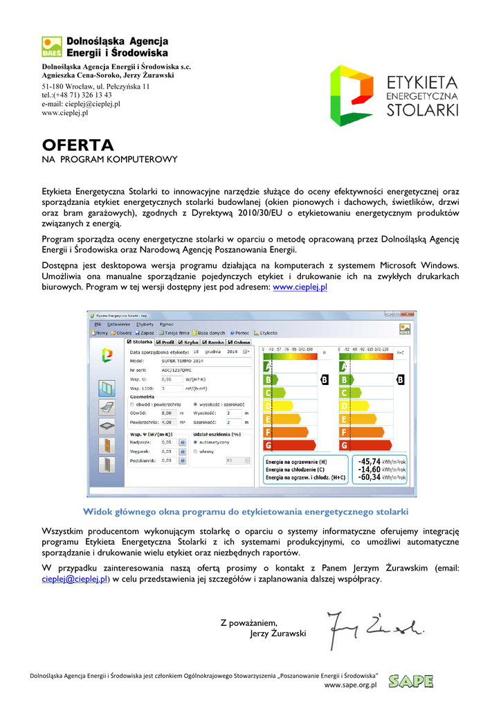 Dolnośląska Agencja Energii i Środowiska s.c. Agnieszka Cena-Soroko, Cena Soroko, Jerzy Żurawski 51 180 Wrocław, ul. 51-180 ul Pełczyńska 11 tel.:(+48 71) 326 13 43 e--mail: [email protected] www.cieplej.pl OFERTA NA PROGRAM KOMPUTEROWY Etykieta Energetyczna Stolarki to innowacyjne innowacyjne narzędzie służące do oceny efektywności energetycznej oraz sporządzania etykiet energetycznych stolarki budowlanej (okien pionowych i dachowych, świetlików, drzwi oraz bram garażowych), garażowych), zgodnych z Dyrektywą 2010/30/EU o etykietowaniu energetycznym produktów związanych z energią. Program sporządza sporządza oceny energetyczne stolarki w oparciu o metodę opracowaną przez Dolnośląską Agencję Energii i Środowiska oraz Narodową Agencję Poszanowania Energii. Dostępna jest desktopowa wersja programu działająca na komputerach z systemem Microsoft Windows. Umożliwia ona manualne sporządzanie pojedynczych etykiet i drukowanie ich na zwykłych drukarkach biur biurowych. Program w tej wersji dostępny jest pod adresem: www.cieplej.pl Widok głównego okna programu do etykietowania energetycznego stolarki Wszystkim producentom producentom wykonującym stolarkę o oparciu o systemy informatyczne oferujemy integrację programu Etykieta Energetyczna Stolarki z ich systemami systemami produkcyjnymi, co umożliwi automatyczne sporządzanie i drukowanie wielu etykiet oraz niezbędnych niezbędnych raportów. raportów W przypadku zainteresowania naszą ofertą prosimy o kontakt z Panem Jerzym Żurawskim (email: email: [email protected]) w celu przedstawienia jej szczegółów i zaplanowania dalszej współpracy. Z poważaniem, Jerzy Żurawski Żurawsk Dolnośląska Agencja Energii i Środowiska jest członkiem Ogólnokrajowego Stowarzyszenia „Poszanowanie Energii i Środowiska” www.sape.org.pl Dolnośląska Agencja Energii i Środowiska s.c. Agnieszka Cena-Soroko, Cena Soroko, Jerzy Żurawski 51 180 Wrocław, ul. 51-180 ul Pełczyńska 11 tel.:(+48 71) 326 13 43 e--mail: [email protected] www.cieplej.pl OFERTA NA PROGRAM KOMPUTEROWY Program komputerowy OPTIMA to nowatorskie i kompleksowe narzędzie do modelowania energetycznego i optymalizacji energetycznej budynków, przeznaczone przede wszystkim dla architektów, projektantów, inżynierów i doradców energetycznych. OPTIMA umożliwia – na poziomie koncepcyjnym: • • • projektowanie nowych budynków, ocenę istniejących budynków, optymalizację budynków zarówno nowych (audyt udyt projektowy) jak i istniejących (audyt energetyczny). Niewątpliwymi zaletami OPTIMY są jej szybkość, intuicyjność i prostota obsługi, dzięki czemu model energetyczny budynku można sporządzić i zoptymalizować w ciągu kilku minut. Na fali szybko rosnącej rosnącej popularności pogram OPTIMA został niedawno wyposażony w innowacyjny moduł optymalizacji stolarki budowlanej, umożliwiający automatyczny, indywidualny i precyzyjny dobór optymalnych energetycznie i ekonomicznie okien, drzwi, bram garażowych oraz rolet. Proponujemy zamieszczenie produktów Państwa firmy w dystrybuowanym przez naszą agencję programie. Proponujemy programie Dzięki temu będą one mogły być rekomendowane przez autorów licznych projektów sporządzanych w OPTIMIE. Dodatkowo proponujemy Państwu wykonanie dedykowanej wersji wersji programu OPTIMA. Będzie ona dostosowana do Państwa wymogów zarówno po stronie wizualnej (kolory, czcionki, logotypy itp. w interfejsie użytkownika oraz w wydrukach) jak i w zakresie dostępnej stolarki. Pozwoli w rzetelny i zarazem błyskawiczny sposób wykazać wykazać korzyści płynące płynące ze stosowania Państwa wyrobów. Na dedykowaną wersję programu można otrzymać licencję niewyłączną, nieograniczoną terytorialnie ani czasowo wraz z prawem do udzielania sublicencji użytkownikom końcowym. W praktyce daje to pełną swobodę w zakresie dystrybucji programu np. Państwa doradcom i przedstawicielom handlowym, czy też swobodę partnerskim pracowniom projektowym i architektonicznym. W przypadku zainteresowania naszą ofertą prosimy o kontakt z Panem Jerzym Żurawskim (email: email: [email protected]) w celu przedstawienia jej szczegółów i zaplanowania dalszej współpracy. Z poważaniem, Jerzy Żurawski Dolnośląska Agencja Energii i Środowiska jest członkiem Ogólnokrajowego Stowarzyszenia „Poszanowanie Energii i Środowiska” www.sape.org.pl