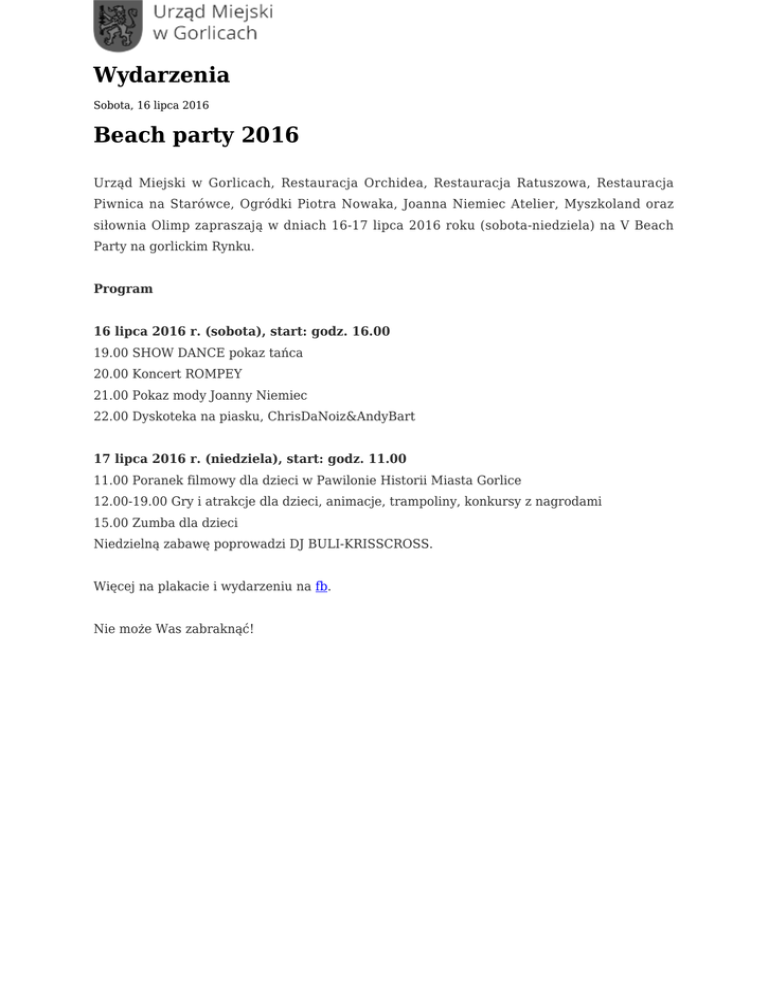 Wydarzenia Sobota, 16 lipca 2016 Beach party 2016 Urząd Miejski w Gorlicach, Restauracja Orchidea, Restauracja Ratuszowa, Restauracja Piwnica na Starówce, Ogródki Piotra Nowaka, Joanna Niemiec Atelier, Myszkoland oraz siłownia Olimp zapraszają w dniach 16-17 lipca 2016 roku (sobota-niedziela) na V Beach Party na gorlickim Rynku. Program 16 lipca 2016 r. (sobota), start: godz. 16.00 19.00 SHOW DANCE pokaz tańca 20.00 Koncert ROMPEY 21.00 Pokaz mody Joanny Niemiec 22.00 Dyskoteka na piasku, ChrisDaNoiz&AndyBart 17 lipca 2016 r. (niedziela), start: godz. 11.00 11.00 Poranek filmowy dla dzieci w Pawilonie Historii Miasta Gorlice 12.00-19.00 Gry i atrakcje dla dzieci, animacje, trampoliny, konkursy z nagrodami 15.00 Zumba dla dzieci Niedzielną zabawę poprowadzi DJ BULI-KRISSCROSS. Więcej na plakacie i wydarzeniu na fb. Nie może Was zabraknąć!