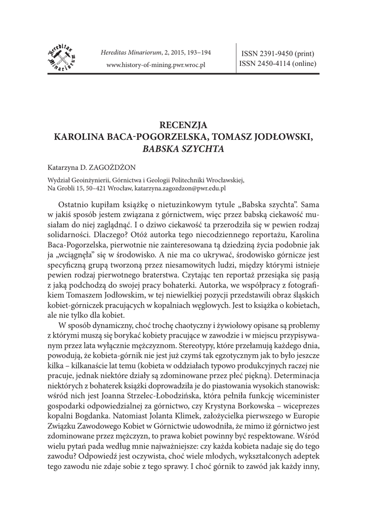 Hereditas Minariorum, 2, 2015, 193−194 www.history-of-mining.pwr.wroc.pl ISSN 2391-9450 (print) ISSN 2450-4114 (online) RECENZJA KAROLINA BACA-POGORZELSKA, TOMASZ JODŁOWSKI, BABSKA SZYCHTA Katarzyna D. ZAGOŻDŻON Wydział Geoinżynierii, Górnictwa i Geologii Politechniki Wrocławskiej, Na Grobli 15, 50–421 Wrocław, [email protected] Ostatnio kupiłam książkę o nietuzinkowym tytule „Babska szychta”. Sama w jakiś sposób jestem związana z górnictwem, więc przez babską ciekawość musiałam do niej zaglądnąć. I o dziwo ciekawość ta przerodziła się w pewien rodzaj solidarności. Dlaczego? Otóż autorka tego niecodziennego reportażu, Karolina Baca-Pogorzelska, pierwotnie nie zainteresowana tą dziedziną życia podobnie jak ja „wciągnęła” się w środowisko. A nie ma co ukrywać, środowisko górnicze jest specyficzną grupą tworzoną przez niesamowitych ludzi, między którymi istnieje pewien rodzaj pierwotnego braterstwa. Czytając ten reportaż przesiąka się pasją z jaką podchodzą do swojej pracy bohaterki. Autorka, we współpracy z fotografikiem Tomaszem Jodłowskim, w tej niewielkiej pozycji przedstawili obraz śląskich kobiet-górniczek pracujących w kopalniach węglowych. Jest to książka o kobietach, ale nie tylko dla kobiet. W sposób dynamiczny, choć trochę chaotyczny i żywiołowy opisane są problemy z którymi muszą się borykać kobiety pracujące w zawodzie i w miejscu przypisywanym przez lata wyłącznie mężczyznom. Stereotypy, które przełamują każdego dnia, powodują, że kobieta-górnik nie jest już czymś tak egzotycznym jak to było jeszcze kilka – kilkanaście lat temu (kobieta w oddziałach typowo produkcyjnych raczej nie pracuje, jednak niektóre działy są zdominowane przez płeć piękną). Determinacja niektórych z bohaterek książki doprowadziła je do piastowania wysokich stanowisk: wśród nich jest Joanna Strzelec-Łobodzińska, która pełniła funkcję wiceminister gospodarki odpowiedzialnej za górnictwo, czy Krystyna Borkowska – wiceprezes kopalni Bogdanka. Natomiast Jolanta Klimek, założycielka pierwszego w Europie Związku Zawodowego Kobiet w Górnictwie udowodniła, że mimo iż górnictwo jest zdominowane przez mężczyzn, to prawa kobiet powinny być respektowane. Wśród wielu pytań pada według mnie najważniejsze: czy każda kobieta nadaje się do tego zawodu? Odpowiedź jest oczywista, choć wiele młodych, wykształconych adeptek tego zawodu nie zdaje sobie z tego sprawy. I choć górnik to zawód jak każdy inny, 194 Recenzje trzeba mieć do niego powołanie i predyspozycje. I obiektywnie patrząc w najbliższym czasie nie ma szans na parytety w górnictwie. Jednak obraz górnictwa bez kobiet jest obrazem niepełnym. Obecność kobiet tym zawodzie zaznaczała się już w wiekach średnich, więc jest rzeczą naturalną, że kobiety nadal pracują w tym trudnym zawodzie. I nie jest to głównie praca za biurkiem, czasem nawet bywa ona cięższa niż ta wykonywana przez mężczyzn. Książka traktuje również o przepięknych, bogatych zwyczajach stanu górniczego. Przywiązanie do tych tradycji, nie jest charakterystyczne tylko dla Ślązaków, choć właśnie tam ma ono często charakter rodzinny, a nawet pokoleniowy. „Babska szychta” wydana jest przez wydawnictwo Tartak Wyrazów. Jest to druga książka Karoliny Bacy-Pogorzelskiej, dziennikarki związanej z „Rzeczpospolitą” obok „Drugiego życia kopalń”. Obraz godny polecenia nie tylko dla feministek. Piękne, wyraziste fotografie Tomasza Jodłowskiego pokazują inną, subtelniejszą twarz górnictwa. REVIEW KAROLINA BACA-POGORZELSKA, TOMASZ JODŁOWSKI, “LADIES ON SHIFTS” I recently bought a book under the title of “Ladies on shifts”. The author of this unusual reportage, Karolina Baca-Pogorzelska, originally not interested in mining, gradually become fascinated by it, captivated by the atmosphere surrounding miners, atmosphere created by unusual people, between whom there is some kind of unique brotherhood. While reading this report we feel the passion with which the book heroes – women working in the mining industry – approach their work. The author, in collaboration with photographer Tomasz Jodłowski, presents the Silesian women miners working in the coal mines. It is a book about women, but addressed not to women only. In a dynamic, though a little chaotic way, the book describes the problems of women who work in a profession and a place that for years had been reserved exclusively for men. The stereotypes they have to break each day help the female-miners become a little less exotic phenomenon than before. The determination of some of the book heroes leads them to hold high positions, such as the deputy minister of economy, responsible for mining, the vice-chairman of a big mine or a founder of Europe’s first trade union for women working in mining. Among the many questions the book poses the most important one seems to be whether every woman is suited for this profession? The answer seems to be obvious, although many young ladies, educated adepts of this profession, may not be aware of it. The book also shows beautiful and rich traditions of the mining profession. Cherishing those traditions is not unique to the Silesians, they however give these traditions a new family and generational character. The book was published by the publishing house Tartak Wyrazów. This is the second book of Karolina Baca-Pogorzelska (after “Drugie życie kopalń” – “Second life of mines”), journalist associated with the “Rzeczpospolita” journal. Beautiful, expressive photographs of Tomasz Jodłowski show another, a more subtle face of mining.