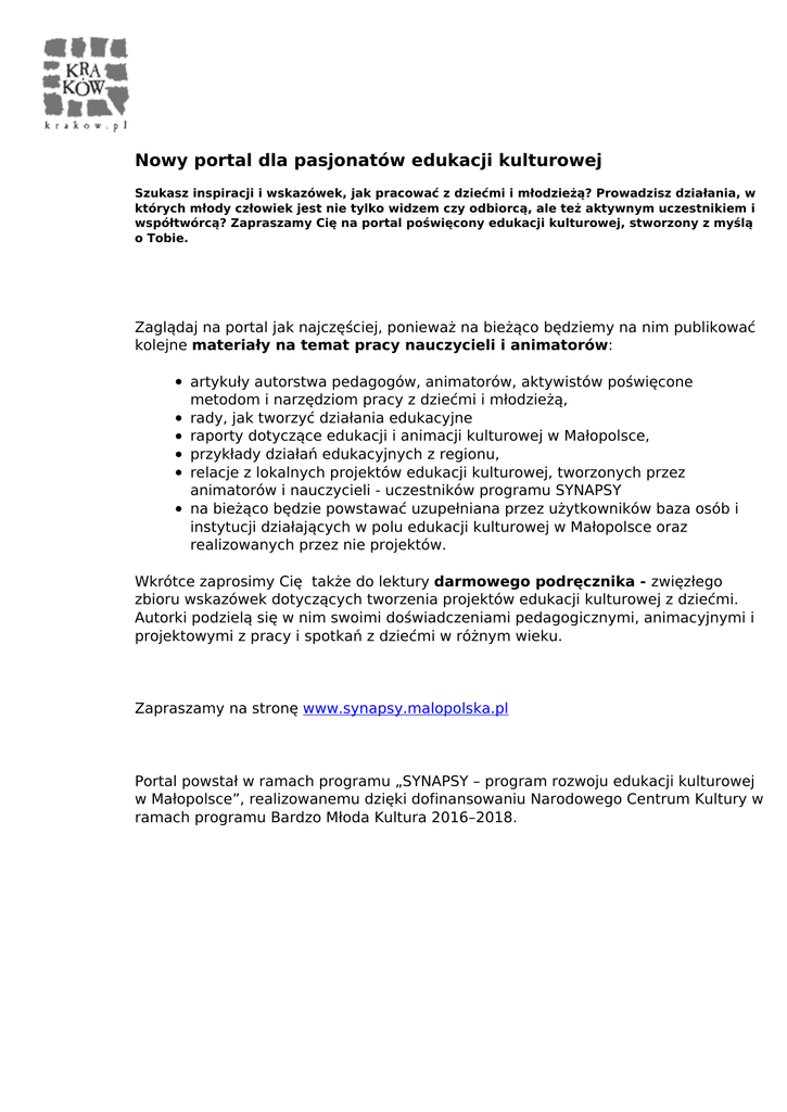 Nowy portal dla pasjonatów edukacji kulturowej Szukasz inspiracji i wskazówek, jak pracować z dziećmi i młodzieżą? Prowadzisz działania, w których młody człowiek jest nie tylko widzem czy odbiorcą, ale też aktywnym uczestnikiem i współtwórcą? Zapraszamy Cię na portal poświęcony edukacji kulturowej, stworzony z myślą o Tobie. Zaglądaj na portal jak najczęściej, ponieważ na bieżąco będziemy na nim publikować kolejne materiały na temat pracy nauczycieli i animatorów: artykuły autorstwa pedagogów, animatorów, aktywistów poświęcone metodom i narzędziom pracy z dziećmi i młodzieżą, rady, jak tworzyć działania edukacyjne raporty dotyczące edukacji i animacji kulturowej w Małopolsce, przykłady działań edukacyjnych z regionu, relacje z lokalnych projektów edukacji kulturowej, tworzonych przez animatorów i nauczycieli - uczestników programu SYNAPSY na bieżąco będzie powstawać uzupełniana przez użytkowników baza osób i instytucji działających w polu edukacji kulturowej w Małopolsce oraz realizowanych przez nie projektów. Wkrótce zaprosimy Cię także do lektury darmowego podręcznika - zwięzłego zbioru wskazówek dotyczących tworzenia projektów edukacji kulturowej z dziećmi. Autorki podzielą się w nim swoimi doświadczeniami pedagogicznymi, animacyjnymi i projektowymi z pracy i spotkań z dziećmi w różnym wieku. Zapraszamy na stronę www.synapsy.malopolska.pl Portal powstał w ramach programu „SYNAPSY – program rozwoju edukacji kulturowej w Małopolsce”, realizowanemu dzięki dofinansowaniu Narodowego Centrum Kultury w ramach programu Bardzo Młoda Kultura 2016–2018. Powered by TCPDF (www.tcpdf.org)