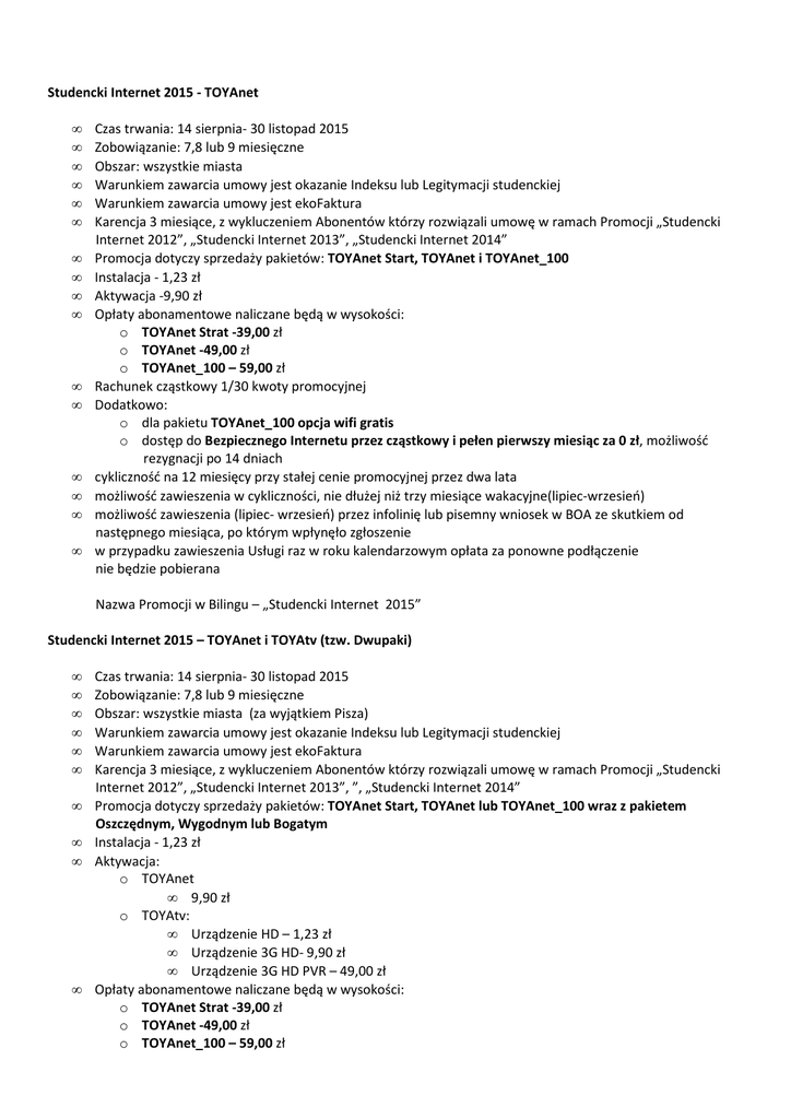 Studencki Internet 2015 - TOYAnet • • • • • • • • • • • • • • • • Czas trwania: 14 sierpnia- 30 listopad 2015 Zobowiązanie: 7,8 lub 9 miesięczne Obszar: wszystkie miasta Warunkiem zawarcia umowy jest okazanie Indeksu lub Legitymacji studenckiej Warunkiem zawarcia umowy jest ekoFaktura Karencja 3 miesiące, z wykluczeniem Abonentów którzy rozwiązali umowę w ramach Promocji „Studencki Internet 2012”, „Studencki Internet 2013”, „Studencki Internet 2014” Promocja dotyczy sprzedaży pakietów: TOYAnet Start, TOYAnet i TOYAnet_100 Instalacja - 1,23 zł Aktywacja -9,90 zł Opłaty abonamentowe naliczane będą w wysokości: o TOYAnet Strat -39,00 zł o TOYAnet -49,00 zł o TOYAnet_100 – 59,00 zł Rachunek cząstkowy 1/30 kwoty promocyjnej Dodatkowo: o dla pakietu TOYAnet_100 opcja wifi gratis o dostęp do Bezpiecznego Internetu przez cząstkowy i pełen pierwszy miesiąc za 0 zł, możliwość rezygnacji po 14 dniach cykliczność na 12 miesięcy przy stałej cenie promocyjnej przez dwa lata możliwość zawieszenia w cykliczności, nie dłużej niż trzy miesiące wakacyjne(lipiec-wrzesień) możliwość zawieszenia (lipiec- wrzesień) przez infolinię lub pisemny wniosek w BOA ze skutkiem od następnego miesiąca, po którym wpłynęło zgłoszenie w przypadku zawieszenia Usługi raz w roku kalendarzowym opłata za ponowne podłączenie nie będzie pobierana Nazwa Promocji w Bilingu – „Studencki Internet 2015” Studencki Internet 2015 – TOYAnet i TOYAtv (tzw. Dwupaki) • • • • • • • • • • Czas trwania: 14 sierpnia- 30 listopad 2015 Zobowiązanie: 7,8 lub 9 miesięczne Obszar: wszystkie miasta (za wyjątkiem Pisza) Warunkiem zawarcia umowy jest okazanie Indeksu lub Legitymacji studenckiej Warunkiem zawarcia umowy jest ekoFaktura Karencja 3 miesiące, z wykluczeniem Abonentów którzy rozwiązali umowę w ramach Promocji „Studencki Internet 2012”, „Studencki Internet 2013”, ”, „Studencki Internet 2014” Promocja dotyczy sprzedaży pakietów: TOYAnet Start, TOYAnet lub TOYAnet_100 wraz z pakietem Oszczędnym, Wygodnym lub Bogatym Instalacja - 1,23 zł Aktywacja: o TOYAnet • 9,90 zł o TOYAtv: • Urządzenie HD – 1,23 zł • Urządzenie 3G HD- 9,90 zł • Urządzenie 3G HD PVR – 49,00 zł Opłaty abonamentowe naliczane będą w wysokości: o TOYAnet Strat -39,00 zł o TOYAnet -49,00 zł o TOYAnet_100 – 59,00 zł • • • • • • o Oszczędny – 19,00 zł o Wygodny- 39,00 zł o Bogaty – 54,00 zł Rachunek cząstkowy 1/30 kwoty promocyjnej Dodatkowo: o dla pakietu TOYAnet_100 opcja wifi gratis o dostęp do Bezpiecznego Internetu przez cząstkowy i pełen pierwszy miesiąc za 0 zł, możliwość rezygnacji po 14 dniach cykliczność na 12 miesięcy przy stałej cenie promocyjnej przez dwa lata możliwość zawieszenia w cykliczności, nie dłużej niż trzy miesiące wakacyjne(lipiec-wrzesień) możliwość zawieszenia (lipiec- wrzesień) przez infolinię lub pisemny wniosek w BOA ze skutkiem od następnego miesiąca, po którym wpłynęło zgłoszenie w przypadku zawieszenia Usługi raz w roku kalendarzowym opłata za ponowne podłączenie nie będzie pobierana Nazwa Promocji w Bilingu: • „Studencki Internet 2015 Net + TV” dla Łodzi, Mysłowic, Kutna i Przemyśla • „Studencki Internet 2015 Net + TV Pb PT ” dla Pabianic i Piotrkowa