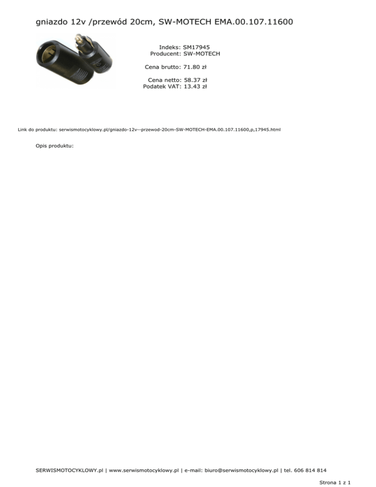 gniazdo 12v /przewód 20cm, SW-MOTECH EMA.00.107.11600 Indeks: SM17945 Producent: SW-MOTECH Cena brutto: 71.80 zł Cena netto: 58.37 zł Podatek VAT: 13.43 zł Link do produktu: serwismotocyklowy.pl/gniazdo-12v--przewod-20cm-SW-MOTECH-EMA.00.107.11600,p,17945.html Opis produktu: SERWISMOTOCYKLOWY.pl | www.serwismotocyklowy.pl | e-mail: [email protected] | tel. 606 814 814 Strona 1 z 1