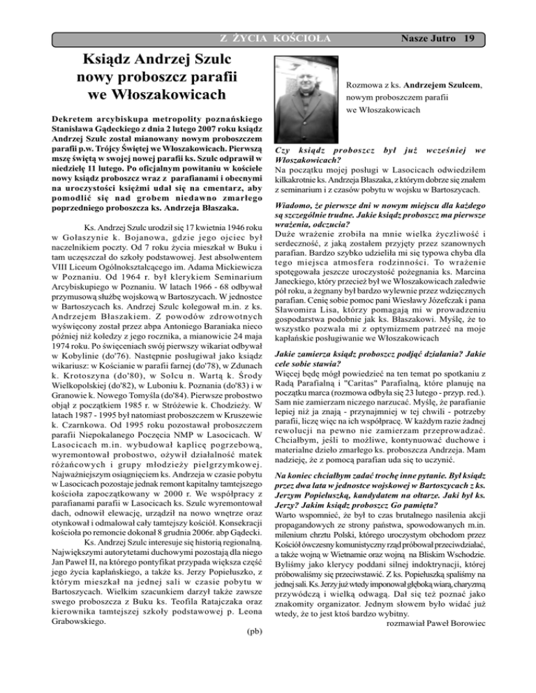 Z ¯YCIA KOCIO£A Ksi¹dz Andrzej Szulc nowy proboszcz parafii we W³oszakowicach Dekretem arcybiskupa metropolity poznañskiego Stanis³awa G¹deckiego z dnia 2 lutego 2007 roku ksi¹dz Andrzej Szulc zosta³ mianowany nowym proboszczem parafii p.w. Trójcy wiêtej we W³oszakowicach. Pierwsz¹ mszê wiêt¹ w swojej nowej parafii ks. Szulc odprawi³ w niedzielê 11 lutego. Po oficjalnym powitaniu w kociele nowy ksi¹dz proboszcz wraz z parafianami i obecnymi na uroczystoci ksiê¿mi uda³ siê na cmentarz, aby pomodliæ siê nad grobem niedawno zmar³ego poprzedniego proboszcza ks. Andrzeja B³aszaka. Ks. Andrzej Szulc urodzi³ siê 17 kwietnia 1946 roku w Go³aszynie k. Bojanowa, gdzie jego ojciec by³ naczelnikiem poczty. Od 7 roku ¿ycia mieszka³ w Buku i tam uczêszcza³ do szko³y podstawowej. Jest absolwentem VIII Liceum Ogólnokszta³c¹cego im. Adama Mickiewicza w Poznaniu. Od 1964 r. by³ klerykiem Seminarium Arcybiskupiego w Poznaniu. W latach 1966 - 68 odbywa³ przymusow¹ s³u¿bê wojskow¹ w Bartoszycach. W jednostce w Bartoszycach ks. Andrzej Szulc kolegowa³ m.in. z ks. Andrzejem B³aszakiem. Z powodów zdrowotnych wywiêcony zosta³ przez abpa Antoniego Baraniaka nieco póniej ni¿ koledzy z jego rocznika, a mianowicie 24 maja 1974 roku. Po wiêceniach swój pierwszy wikariat odbywa³ w Kobylinie (do'76). Nastêpnie pos³ugiwa³ jako ksi¹dz wikariusz: w Kocianie w parafii farnej (do'78), w Zdunach k. Krotoszyna (do'80), w Solcu n. Wart¹ k. rody Wielkopolskiej (do'82), w Luboniu k. Poznania (do'83) i w Granowie k. Nowego Tomyla (do'84). Pierwsze probostwo obj¹³ z pocz¹tkiem 1985 r. w Stró¿ewie k. Chodzie¿y. W latach 1987 - 1995 by³ natomiast proboszczem w Kruszewie k. Czarnkowa. Od 1995 roku pozostawa³ proboszczem parafii Niepokalanego Poczêcia NMP w Lasocicach. W Lasocicach m.in. wybudowa³ kaplicê pogrzebow¹, wyremontowa³ probostwo, o¿ywi³ dzia³alnoæ matek ró¿añcowych i grupy m³odzie¿y pielgrzymkowej. Najwa¿niejszym osi¹gniêciem ks. Andrzeja w czasie pobytu w Lasocicach pozostaje jednak remont kapitalny tamtejszego kocio³a zapocz¹tkowany w 2000 r. We wspó³pracy z parafianami parafii w Lasocicach ks. Szulc wyremontowa³ dach, odnowi³ elewacjê, urz¹dzi³ na nowo wnêtrze oraz otynkowa³ i odmalowa³ ca³y tamtejszy koció³. Konsekracji kocio³a po remoncie dokona³ 8 grudnia 2006r. abp G¹decki. Ks. Andrzej Szulc interesuje siê histori¹ regionaln¹. Najwiêkszymi autorytetami duchowymi pozostaj¹ dla niego Jan Pawe³ II, na którego pontyfikat przypada wiêksza czêæ jego ¿ycia kap³añskiego, a tak¿e ks. Jerzy Popie³uszko, z którym mieszka³ na jednej sali w czasie pobytu w Bartoszycach. Wielkim szacunkiem darzy³ tak¿e zawsze swego proboszcza z Buku ks. Teofila Ratajczaka oraz kierownika tamtejszej szko³y podstawowej p. Leona Grabowskiego. (pb) Nasze Jutro 19 Rozmowa z ks. Andrzejem Szulcem, nowym proboszczem parafii we W³oszakowicach Czy ksi¹dz proboszcz by³ ju¿ wczeniej we W³oszakowicach? Na pocz¹tku mojej pos³ugi w Lasocicach odwiedzi³em kilkakrotnie ks. Andrzeja B³aszaka, z którym dobrze siê zna³em z seminarium i z czasów pobytu w wojsku w Bartoszycach. Wiadomo, ¿e pierwsze dni w nowym miejscu dla ka¿dego s¹ szczególnie trudne. Jakie ksi¹dz proboszcz ma pierwsze wra¿enia, odczucia? Du¿e wra¿enie zrobi³a na mnie wielka ¿yczliwoæ i serdecznoæ, z jak¹ zosta³em przyjêty przez szanownych parafian. Bardzo szybko udzieli³a mi siê typowa chyba dla tego miejsca atmosfera rodzinnoci. To wra¿enie spotêgowa³a jeszcze uroczystoæ po¿egnania ks. Marcina Janeckiego, który przecie¿ by³ we W³oszakowicach zaledwie pó³ roku, a ¿egnany by³ bardzo wylewnie przez wdziêcznych parafian. Ceniê sobie pomoc pani Wies³awy Józefczak i pana S³awomira Lisa, którzy pomagaj¹ mi w prowadzeniu gospodarstwa podobnie jak ks. B³aszakowi. Mylê, ¿e to wszystko pozwala mi z optymizmem patrzeæ na moje kap³añskie pos³ugiwanie we W³oszakowicach Jakie zamierza ksi¹dz proboszcz podj¹æ dzia³ania? Jakie cele sobie stawia? Wiêcej bêdê móg³ powiedzieæ na ten temat po spotkaniu z Rad¹ Parafialn¹ i "Caritas" Parafialn¹, które planujê na pocz¹tku marca (rozmowa odby³a siê 23 lutego - przyp. red.). Sam nie zamierzam niczego narzucaæ. Mylê, ¿e parafianie lepiej ni¿ ja znaj¹ - przynajmniej w tej chwili - potrzeby parafii, liczê wiêc na ich wspó³pracê. W ka¿dym razie ¿adnej rewolucji na pewno nie zamierzam przeprowadzaæ. Chcia³bym, jeli to mo¿liwe, kontynuowaæ duchowe i materialne dzie³o zmar³ego ks. proboszcza Andrzeja. Mam nadziejê, ¿e z pomoc¹ parafian uda siê to uczyniæ. Na koniec chcia³bym zadaæ trochê inne pytanie. By³ ksi¹dz przez dwa lata w jednostce wojskowej w Bartoszycach z ks. Jerzym Popie³uszk¹, kandydatem na o³tarze. Jaki by³ ks. Jerzy? Jakim ksi¹dz proboszcz Go pamiêta? Warto wspomnieæ, ¿e by³ to czas brutalnego nasilenia akcji propagandowych ze strony pañstwa, spowodowanych m.in. milenium chrztu Polski, którego uroczystym obchodom przez Koció³ ówczesny komunistyczny rz¹d próbowa³ przeciwdzia³aæ, a tak¿e wojn¹ w Wietnamie oraz wojn¹ na Bliskim Wschodzie. Bylimy jako klerycy poddani silnej indoktrynacji, której próbowalimy siê przeciwstawiæ. Z ks. Popie³uszk¹ spalimy na jednej sali. Ks. Jerzy ju¿ wtedy imponowa³ g³êbok¹ wiar¹, charyzm¹ przywódcz¹ i wielk¹ odwag¹. Da³ siê te¿ poznaæ jako znakomity organizator. Jednym s³owem by³o widaæ ju¿ wtedy, ¿e to jest kto bardzo wybitny. rozmawia³ Pawe³ Borowiec