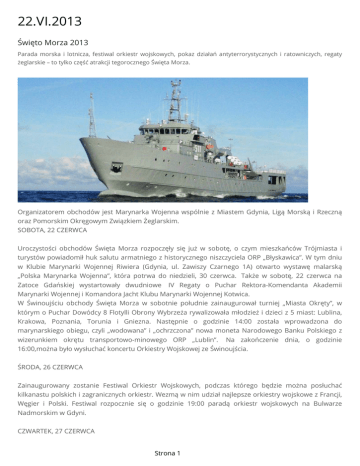 22.VI.2013 Święto Morza 2013 Parada morska i lotnicza, festiwal orkiestr wojskowych, pokaz działań antyterrorystycznych i ratowniczych, regaty żeglarskie – to tylko część atrakcji tegorocznego Święta Morza. Organizatorem obchodów jest Marynarka Wojenna wspólnie z Miastem Gdynia, Ligą Morską i Rzeczną oraz Pomorskim Okręgowym Związkiem Żeglarskim. SOBOTA, 22 CZERWCA Uroczystości obchodów Święta Morza rozpoczęły się już w sobotę, o czym mieszkańców Trójmiasta i turystów powiadomił huk salutu armatniego z historycznego niszczyciela ORP „Błyskawica”. W tym dniu w Klubie Marynarki Wojennej Riwiera (Gdynia, ul. Zawiszy Czarnego 1A) otwarto wystawę malarską „Polska Marynarka Wojenna”, która potrwa do niedzieli, 30 czerwca. Także w sobotę, 22 czerwca na Zatoce Gdańskiej wystartowały dwudniowe IV Regaty o Puchar Rektora-Komendanta Akademii Marynarki Wojennej i Komandora Jacht Klubu Marynarki Wojennej Kotwica. W Świnoujściu obchody Święta Morza w sobotnie południe zainaugurował turniej „Miasta Okręty”, w którym o Puchar Dowódcy 8 Flotylli Obrony Wybrzeża rywalizowała młodzież i dzieci z 5 miast: Lublina, Krakowa, Poznania, Torunia i Gniezna. Następnie o godzinie 14:00 została wprowadzona do marynarskiego obiegu, czyli „wodowana” i „ochrzczona” nowa moneta Narodowego Banku Polskiego z wizerunkiem okrętu transportowo-minowego ORP „Lublin”. Na zakończenie dnia, o godzinie 16:00,można było wysłuchać koncertu Orkiestry Wojskowej ze Świnoujścia. ŚRODA, 26 CZERWCA Zainaugurowany zostanie Festiwal Orkiestr Wojskowych, podczas którego będzie można posłuchać kilkanastu polskich i zagranicznych orkiestr. Wezmą w nim udział najlepsze orkiestry wojskowe z Francji, Węgier i Polski. Festiwal rozpocznie się o godzinie 19:00 paradą orkiestr wojskowych na Bulwarze Nadmorskim w Gdyni. CZWARTEK, 27 CZERWCA Strona 1 W ramach Festiwalu Orkiestr Wojskowych, w Klubie 3. Flotylli Okrętów na Oksywiu, od godziny 19:00 orkiestry zagrają koncert inauguracyjny. Podczas koncertu zaprezentują się orkiestry z Francji i Węgier oraz Orkiestry Reprezentacyjne Marynarki Wojennej i Wojsk Lądowych. PIĄTEK, 28 CZERWCA Na wodach Zatoki Gdańskiej rozpoczną się kolejne dwudniowe Regaty. Tym razem żeglarze będą rywalizować o Puchar Dowódcy Marynarki Wojennej. Tego dnia, o godzinie 14:00 rozpocznie się również pokaz działań antyterrorystycznych i ratowniczych. W pokazie ratowniczym będzie można zobaczyć śmigłowiec Marynarki Wojennej Mi-14 PŁ/R, którego załoga zaprezentuje różne techniki ratowania rozbitków. O godzinie 21:00 na placu przed Oceanarium Gdyńskim będzie można wysłuchać pierwszego koncertu galowego Festiwalu Orkiestr Wojskowych. SOBOTA, 29 CZERWCA W godzinach popołudniowych będzie można wejść na pokłady dwóch polskich okrętów. Dla mieszkańców Trójmiasta oraz turystów zostanie udostępniony okręt rakietowy ORP „Piorun” i niszczyciel min ORP „Czajka”. Obie jednostki cumować będą w basenie Prezydenta, przy molo Marynarki Wojennej (początek Nabrzeża Pomorskiego). Otwarty dla zwiedzających będzie również historyczny niszczyciel ORP „Błyskawica”, który cumował będzie na końcu Alei Jana Pawła II, naprzeciwko Oceanarium Gdyńskiego. O godzinie 21:00 na placu przed Oceanarium Gdyńskim będzie można wysłuchać drugiego koncertu galowego Festiwalu Orkiestr Wojskowych. Po występie muzyków wojskowych, około 22:30 na scenie pojawi się zespół Lady Pank, a podsumowaniem całego dnia będzie pokaz sztucznych ogni w rytmie utworów granych przez orkiestry. W Świnoujściu od godziny 10:00 będzie można wejść na pokłady dwóch okrętów: transportowo-minowego i trałowca, które zacumowane będą w Basenie Północnym (Basen Żeglarski). O godzinie 15:00 rozpocznie się natomiast pokaz sprzętu 8 Flotylli Obrony Wybrzeża. Swoje wyposażenie zaprezentują saperzy, chemicy, przeciwlotniczy i nurkowie-minerzy. Godzinę później wystąpią zespoły i grupy artystyczne z Klubu 8 FOW. Uroczystości w Świnoujściu zakończą się o godzinie 20:00. NIEDZIELA, 30 CZERWCA Kulminacyjnym punktem obchodów Święta Morza będzie Święto Marynarki Wojennej, jak co roku przypadające w ostatnią niedzielę czerwca. Marynarze uczczą pamięć o swoich poprzednikach składając o godzinie 10:45 na Cmentarzu MW (Gdynia-Oksywie, ul. Muchowskiego) wiązanki kwiatów na płytach twórców Marynarki Wojennej. 15 minut później, ulicą Świętojańska, od Urzędu Miasta do skweru Kościuszki, przemaszerują orkiestry wojskowe. Wezmą one udział w centralnych uroczystościach Święta Marynarki Wojennej przy Płycie Pomnika Marynarza Polskiego. Ostatnią okazją do posłuchania utworów w wykonaniu orkiestr wojskowych będzie koncert na molo w Gdyni - Redłowie, który rozpocznie się o godzinie 14:30. O godzinie 14:15 rozpocznie się najatrakcyjniejsza część obchodów Święta Morza i Marynarki Wojennej – Parada Morska i Lotnicza, w której weźmie udział kilkanaście polskich i zagranicznych (z Litwy, Łotwy i Rosji) okrętów oraz lotnictwo morskie. Nad idącymi w szyku okrętami przelecą samoloty i śmigłowce MW. W paradzie udział wezmą jednostki reprezentujące wszystkie najważniejsze klasy okrętów będące na wyposażeniu Marynarki Wojennej. Będzie można zobaczyć fregatę rakietową, okręt podwodny, okręt transportowo-minowy, okręt rakietowy, niszczyciel min, trałowiec, okręt ratowniczy, rozpoznawczy, Strona 2 hydrograficzny oraz zbiornikowiec. W paradzie udział weźmie także litewski niszczyciel min, łotewski katamaran pilotowy oraz rosyjski trałowiec. kmdr por. Bartosz Zajda rzecznik prasowy Dowódcy Marynarki Wojennej tel. 601-412-722 Strona 3
