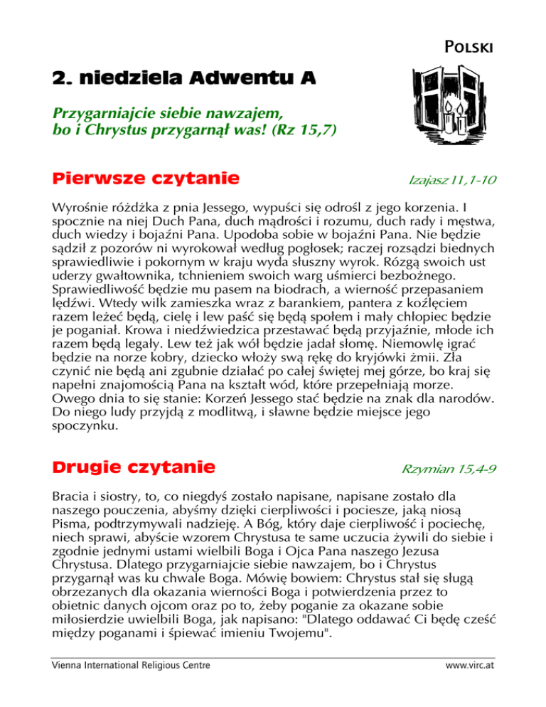 Polski Przygarniajcie siebie nawzajem, bo i Chrystus przygarnął was! (Rz 15,7) Wyrośnie różdżka z pnia Jessego, wypuści się odrośl z jego korzenia. I spocznie na niej Duch Pana, duch mądrości i rozumu, duch rady i męstwa, duch wiedzy i bojaźni Pana. Upodoba sobie w bojaźni Pana. Nie będzie sądził z pozorów ni wyrokował według pogłosek; raczej rozsądzi biednych sprawiedliwie i pokornym w kraju wyda słuszny wyrok. Rózgą swoich ust uderzy gwałtownika, tchnieniem swoich warg uśmierci bezbożnego. Sprawiedliwość będzie mu pasem na biodrach, a wierność przepasaniem lędźwi. Wtedy wilk zamieszka wraz z barankiem, pantera z koźlęciem razem leżeć będą, cielę i lew paść się będą społem i mały chłopiec będzie je poganiał. Krowa i niedźwiedzica przestawać będą przyjaźnie, młode ich razem będą legały. Lew też jak wół będzie jadał słomę. Niemowlę igrać będzie na norze kobry, dziecko włoży swą rękę do kryjówki żmii. Zła czynić nie będą ani zgubnie działać po całej świętej mej górze, bo kraj się napełni znajomością Pana na kształt wód, które przepełniają morze. Owego dnia to się stanie: Korzeń Jessego stać będzie na znak dla narodów. Do niego ludy przyjdą z modlitwą, i sławne będzie miejsce jego spoczynku. Bracia i siostry, to, co niegdyś zostało napisane, napisane zostało dla naszego pouczenia, abyśmy dzięki cierpliwości i pociesze, jaką niosą Pisma, podtrzymywali nadzieję. A Bóg, który daje cierpliwość i pociechę, niech sprawi, abyście wzorem Chrystusa te same uczucia żywili do siebie i zgodnie jednymi ustami wielbili Boga i Ojca Pana naszego Jezusa Chrystusa. Dlatego przygarniajcie siebie nawzajem, bo i Chrystus przygarnął was ku chwale Boga. Mówię bowiem: Chrystus stał się sługą obrzezanych dla okazania wierności Boga i potwierdzenia przez to obietnic danych ojcom oraz po to, żeby poganie za okazane sobie miłosierdzie uwielbili Boga, jak napisano: "Dlatego oddawać Ci będę cześć między poganami i śpiewać imieniu Twojemu". Vienna International Religious Centre www.virc.at W owym czasie wystąpił Jan Chrzciciel i głosił na Pustyni Judzkiej te słowa: "Nawróćcie się, bo bliskie jest królestwo niebieskie". Do niego to odnosi się słowo proroka Izajasza, gdy mówi: "Głos wołającego na pustyni: Przygotujcie drogę Panu, prostujcie ścieżki dla Niego". Sam zaś Jan nosił odzienie z sierści wielbłądziej i pas skórzany około bioder, a jego pokarmem była szarańcza i miód leśny. Wówczas ciągnęły do niego Jerozolima oraz cała Judea i cała okolica nad Jordanem. Przyjmowano od niego chrzest w rzece Jordanie, wyznając przy tym swe grzechy. A gdy widział, że przychodzi do chrztu wielu spośród faryzeuszów i saduceuszów, mówił im: "Plemię żmijowe, kto wam pokazał, jak uciec przed nadchodzącym gniewem? Wydajcie więc godny owoc nawrócenia, a nie myślcie, że możecie sobie mówić: 'Abrahama mamy za ojca', bo powiadam wam, że z tych kamieni może Bóg wzbudzić dzieci Abrahamowi. Już siekiera do korzenia drzew jest przyłożona. Każde więc drzewo, które nie wydaje dobrego owocu, będzie wycięte i w ogień wrzucone. Ja was chrzczę wodą dla nawrócenia; lecz Ten, który idzie za mną, mocniejszy jest ode mnie; ja nie jestem godzien nosić Mu sandałów. On was chrzcić będzie Duchem Świętym i ogniem. Ma On wiejadło w ręku i oczyści swój omłot: pszenicę zbierze do spichrza, a plewy spali w ogniu nieugaszonym". Liczne sekty i ich różnorodne ryty oczyszczenia powstawały w czasach Jezusa na pustyni – tradycyjnym miejscu spotkania z Bogiem i wewnętrznego nawrócenia. Na czoło, choć całkiem odmiennie, wysuwał się wśród nich, jako pojedyncza osobowość, Jan Chrzciciel. Domagał się on jedynie chrztu wobec nadchodzącego sądu Bożego. Z jasnością właściwą prorokom widzi on siekierę, której uderzenia wstrząsają już korzeniami świata. W swoich mowach o nadejściu królestwa Bożego Chrzciciel zapowiada bliski przewrót. Nadchodzącemu kryzysowi ludzie mogą sprostać jedynie przez pokutę, której owocem jest nawrócenie. Wielu jego słuchaczy należy do religijnej elity narodu, która potem będzie utrudniać życie Jezusowi. Jan rozpoznaje ich nastawienie i proroczo widzi jako płonącą słomę po żniwach. Nawet on, "głos" Mesjasza, nie jest godny, aby Jego poprzedzać. On wie, że chrzci wodą, a nie Duchem. Za pośrednictwem twardych słów, które ten prawdziwy i szczery prorok rzuca nam w twarz, wprowadza nas w zakłopotanie i wyzwala nieprzyjemne odczucia. Czyżby nie miała końca historia z przerażającym i nieugiętym Bogiem Starego Przymierza, który swoją moc objawiał w huczących grzmotach? Jan Chrzciciel stoi jednak w punkcie zwrotnym czasu: stare nie musi nas już więcej przygniatać, gdyż jesteśmy dziećmi królestwa Miłości i Łaski! Nowina Chrzciciela nie chce nas zastraszać. Jej celem jest uświadomienie nam, jak wielkie znaczenie dla wiary i relacji z Bogiem mają nasze kryzysy i nasza wina. Tym samym Janowe słowa są dzisiaj bardziej aktualne niż kiedykolwiek. Jeżeli weźmiemy je na serio, wówczas także współcześnie, okazują moc zmiany kierunku życia – od królestwa grzechu do królestwa miłości. Zmianę tę poprzedza zawsze miłość Boga i przyjęcie przez Niego naszej słabości. Jan Chrzciciel zaprasza nas do tego, abyśmy nie odrzucali lekkomyślnie Bożej miłości. Jego wezwanie rozbrzmiewa w nastroju oczekiwania, wówczas i obecnie, i upomina nas, byśmy spoglądali w przyszłość, na przyjście Pana oddzielającego ziarno od plew. Vienna International Religious Centre [email protected]