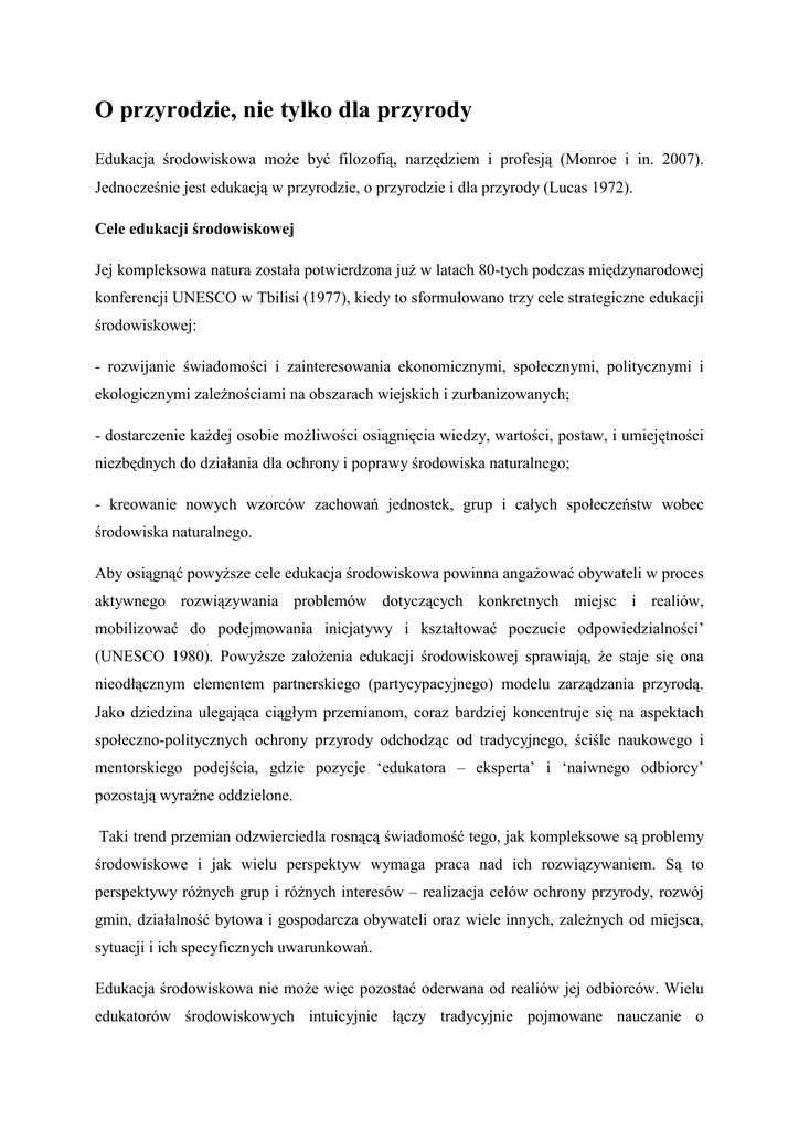 O przyrodzie, nie tylko dla przyrody Edukacja środowiskowa moŜe być filozofią, narzędziem i profesją (Monroe i in. 2007). Jednocześnie jest edukacją w przyrodzie, o przyrodzie i dla przyrody (Lucas 1972). Cele edukacji środowiskowej Jej kompleksowa natura została potwierdzona juŜ w latach 80-tych podczas międzynarodowej konferencji UNESCO w Tbilisi (1977), kiedy to sformułowano trzy cele strategiczne edukacji środowiskowej: - rozwijanie świadomości i zainteresowania ekonomicznymi, społecznymi, politycznymi i ekologicznymi zaleŜnościami na obszarach wiejskich i zurbanizowanych; - dostarczenie kaŜdej osobie moŜliwości osiągnięcia wiedzy, wartości, postaw, i umiejętności niezbędnych do działania dla ochrony i poprawy środowiska naturalnego; - kreowanie nowych wzorców zachowań jednostek, grup i całych społeczeństw wobec środowiska naturalnego. Aby osiągnąć powyŜsze cele edukacja środowiskowa powinna angaŜować obywateli w proces aktywnego rozwiązywania problemów dotyczących konkretnych miejsc i realiów, mobilizować do podejmowania inicjatywy i kształtować poczucie odpowiedzialności’ (UNESCO 1980). PowyŜsze załoŜenia edukacji środowiskowej sprawiają, Ŝe staje się ona nieodłącznym elementem partnerskiego (partycypacyjnego) modelu zarządzania przyrodą. Jako dziedzina ulegająca ciągłym przemianom, coraz bardziej koncentruje się na aspektach społeczno-politycznych ochrony przyrody odchodząc od tradycyjnego, ściśle naukowego i mentorskiego podejścia, gdzie pozycje ‘edukatora – eksperta’ i ‘naiwnego odbiorcy’ pozostają wyraźne oddzielone. Taki trend przemian odzwierciedla rosnącą świadomość tego, jak kompleksowe są problemy środowiskowe i jak wielu perspektyw wymaga praca nad ich rozwiązywaniem. Są to perspektywy róŜnych grup i róŜnych interesów – realizacja celów ochrony przyrody, rozwój gmin, działalność bytowa i gospodarcza obywateli oraz wiele innych, zaleŜnych od miejsca, sytuacji i ich specyficznych uwarunkowań. Edukacja środowiskowa nie moŜe więc pozostać oderwana od realiów jej odbiorców. Wielu edukatorów środowiskowych intuicyjnie łączy tradycyjnie pojmowane nauczanie o przyrodzie z działaniem, organizując zajęcia, warsztaty czy projekty pozwalające wykorzystać zdobytą wiedzę i umiejętności. Wydaje się jednak, Ŝe takie podejście nadal potrzebuje wsparcia i popularyzacji. Teoretycy tacy jak Monroe i in. starają się wspierać jego rozwój poprzez dostarczanie pewnych ram pojęciowych, modeli i schematów, pozwalających dostosować odpowiednie działania i narzędzia edukacyjne do potrzeb konkretnych sytuacji. Działania edukacji środowiskowej W ramach zintegrowanej edukacji środowiskowej wyodrębniają oni cztery kategorie działań: - dostarczenie informacji - celem jest dostarczenie informacji o problemie i zwiększenie świadomości; choć jest to istotny element edukacji, ma charakter jednostronny i zwykle jest pozbawiony partnerstwa, co przyczynia się do jego małej efektywności, jeŜeli pozostaje odosobnionym działaniem; - budowanie zrozumienia – ma charakter dwustronnej interakcji pomiędzy edukatorem, a odbiorcami, umoŜliwiając kształtowanie koncepcji, przekonań, wartości; celem jest wymiana poglądów i dialog, umoŜliwiające zrozumienie informacji i problemów; - zdobywanie umiejętności – celem jest wyjście poza zdobycie wiedzy, zrozumienia i zdobycie umiejętności, które mogą być wykorzystane w praktyce, w konkretnych sytuacjach i do rozwiązywania konkretnych problemów; - podejmowanie konkretnych działań – w procesie tym edukator i odbiorcy pracują razem nad zdefiniowaniem celów i metod interwencji dla rozwiązania konkretnego problemu, pozycje edukatora i odbiorcy mają wymienny charakter, a jednoczesna analiza róŜnych punktów widzenia moŜe się przyczynić do re-definicji problemu i wyłonienia nowych pomysłów i rozwiązań. Dobre praktyki z areny międzynarodowej Tak pojmowana edukacja środowiskowa staje się nieodłącznym elementem partnerskiego modelu zarządzania przyrodą, który jest alternatywą dla odgórnie narzucanych decyzji. Zakładając współpracę róŜnych grup społecznych i zawodowych pozwala zrozumieć róŜne interesy i preferencje, określić, jakie informacje posiadają poszczególne grupy, a jakich im brak, jakie są niejasności i z czego one wynikają. Edukacja środowiskowa jako zintegrowany element zarządzania przyrodą nie jest tylko pojęciem abstrakcyjnym, a partnerski model zarządzania przyrodą to nie tylko hasło moŜliwe do realizacji wyłącznie w krajach wysoko rozwiniętych jak Niemcy, Finlandia czy Stany Zjednoczone. Przykłady z krajów takich jak Ekwador czy Uganda wskazują, Ŝe jest to sposób działania i współdziałania moŜliwy do zaadoptowania na bardzo róŜnorodnym gruncie społeczno-kulturowym. Uwarunkowania polityczne i ekonomiczne sprawiają, Ŝe często jest proces wymagający czasu i wieloetapowych działań, jednak ostateczne efekty w postaci trwale funkcjonujących zmian, są motywacją do podjęcia wyzwania. Przykład z Ekwadoru Proces uspołecznienia zarządzania przyrodą w Ekwadorze dotyczył obszarów leśnych w rejonie Esmeraldas, które charakteryzują się ogromną bioróŜnorodnością, a jednocześnie znajdują się pod presją intensywnej i wielokierunkowej działalności człowieka. Przemysł zajmujący się produkcją oleju palmowego, ogromne plantacje, produkcja drewna oraz kopalnie złota przyczyniają się do gwałtownego wylesiania (22 500 ha rocznie). Od roku 2000 niemiecka organizacja na rzecz rozwoju GTZ (Gesellschaft für Technische Zusammenarbeit) rozpoczęła swoją działalność w Esmeraldas w celu poprawy sytuacji środowiska przyrodniczego regionu i zamieszkujących go społeczności. ZałoŜeniem GTZ była wielostronna komunikacja na kaŜdym etapie projektu pomiędzy wszystkimi jego uczestnikami. Miało to przyczynić się do