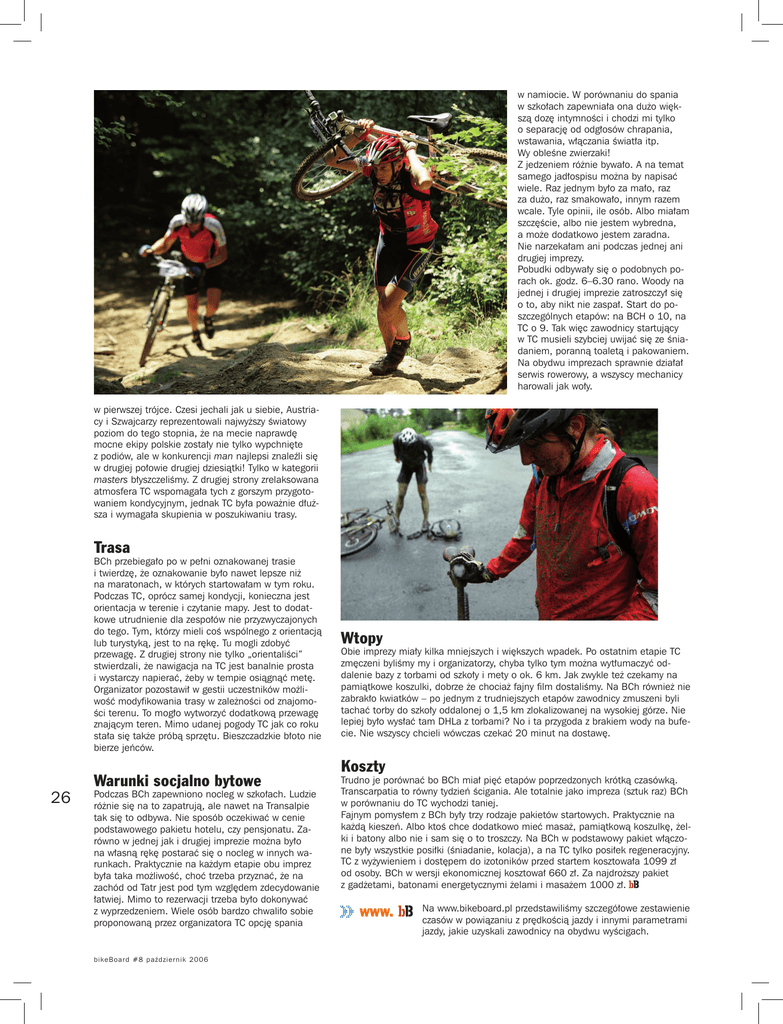 w namiocie. W porównaniu do spania w szkołach zapewniała ona dużo większą dozę intymności i chodzi mi tylko o separację od odgłosów chrapania, wstawania, włączania światła itp. Wy obleśne zwierzaki! Z jedzeniem różnie bywało. A na temat samego jadłospisu można by napisać wiele. Raz jednym było za mało, raz za dużo, raz smakowało, innym razem wcale. Tyle opinii, ile osób. Albo miałam szczęście, albo nie jestem wybredna, a może dodatkowo jestem zaradna. Nie narzekałam ani podczas jednej ani drugiej imprezy. Pobudki odbywały się o podobnych porach ok. godz. 6–6.30 rano. Woody na jednej i drugiej imprezie zatroszczył się o to, aby nikt nie zaspał. Start do poszczególnych etapów: na BCH o 10, na TC o 9. Tak więc zawodnicy startujący w TC musieli szybciej uwijać się ze śniadaniem, poranną toaletą i pakowaniem. Na obydwu imprezach sprawnie działał serwis rowerowy, a wszyscy mechanicy harowali jak woły. w pierwszej trójce. Czesi jechali jak u siebie, Austriacy i Szwajcarzy reprezentowali najwyższy światowy poziom do tego stopnia, że na mecie naprawdę mocne ekipy polskie zostały nie tylko wypchnięte z podiów, ale w konkurencji man najlepsi znaleźli się w drugiej połowie drugiej dziesiątki! Tylko w kategorii masters błyszczeliśmy. Z drugiej strony zrelaksowana atmosfera TC wspomagała tych z gorszym przygotowaniem kondycyjnym, jednak TC była poważnie dłuższa i wymagała skupienia w poszukiwaniu trasy. Trasa BCh przebiegało po w pełni oznakowanej trasie i twierdzę, że oznakowanie było nawet lepsze niż na maratonach, w których startowałam w tym roku. Podczas TC, oprócz samej kondycji, konieczna jest orientacja w terenie i czytanie mapy. Jest to dodatkowe utrudnienie dla zespołów nie przyzwyczajonych do tego. Tym, którzy mieli coś wspólnego z orientacją lub turystyką, jest to na rękę. Tu mogli zdobyć przewagę. Z drugiej strony nie tylko „orientaliści” stwierdzali, że nawigacja na TC jest banalnie prosta i wystarczy napierać, żeby w tempie osiągnąć metę. Organizator pozostawił w gestii uczestników możliwość modyfikowania trasy w zależności od znajomości terenu. To mogło wytworzyć dodatkową przewagę znającym teren. Mimo udanej pogody TC jak co roku stała się także próbą sprzętu. Bieszczadzkie błoto nie bierze jeńców. Wtopy Obie imprezy miały kilka mniejszych i większych wpadek. Po ostatnim etapie TC zmęczeni byliśmy my i organizatorzy, chyba tylko tym można wytłumaczyć oddalenie bazy z torbami od szkoły i mety o ok. 6 km. Jak zwykle też czekamy na pamiątkowe koszulki, dobrze że chociaż fajny film dostaliśmy. Na BCh również nie zabrakło kwiatków – po jednym z trudniejszych etapów zawodnicy zmuszeni byli tachać torby do szkoły oddalonej o 1,5 km zlokalizowanej na wysokiej górze. Nie lepiej było wysłać tam DHLa z torbami? No i ta przygoda z brakiem wody na bufecie. Nie wszyscy chcieli wówczas czekać 20 minut na dostawę. Koszty Warunki socjalno bytowe 26 Podczas BCh zapewniono nocleg w szkołach. Ludzie różnie się na to zapatrują, ale nawet na Transalpie tak się to odbywa. Nie sposób oczekiwać w cenie podstawowego pakietu hotelu, czy pensjonatu. Zarówno w jednej jak i drugiej imprezie można było na własną rękę postarać się o nocleg w innych warunkach. Praktycznie na każdym etapie obu imprez była taka możliwość, choć trzeba przyznać, że na zachód od Tatr jest pod tym względem zdecydowanie łatwiej. Mimo to rezerwacji trzeba było dokonywać z wyprzedzeniem. Wiele osób bardzo chwaliło sobie proponowaną przez organizatora TC opcję spania bi k eBoar d #8 październik 2006 Trudno je porównać bo BCh miał pięć etapów poprzedzonych krótką czasówką. Transcarpatia to równy tydzień ścigania. Ale totalnie jako impreza (sztuk raz) BCh w porównaniu do TC wychodzi taniej. Fajnym pomysłem z BCh były trzy rodzaje pakietów startowych. Praktycznie na każdą kieszeń. Albo ktoś chce dodatkowo mieć masaż, pamiątkową koszulkę, żelki i batony albo nie i sam się o to troszczy. Na BCh w podstawowy pakiet włączone były wszystkie posiłki (śniadanie, kolacja), a na TC tylko posiłek regeneracyjny. TC z wyżywieniem i dostępem do izotoników przed startem kosztowała 1099 zł od osoby. BCh w wersji ekonomicznej kosztował 660 zł. Za najdroższy pakiet z gadżetami, batonami energetycznymi żelami i masażem 1000 zł. www. Na www.bikeboard.pl przedstawiliśmy szczegółowe zestawienie czasów w powiązaniu z prędkością jazdy i innymi parametrami jazdy, jakie uzyskali zawodnicy na obydwu wyścigach.