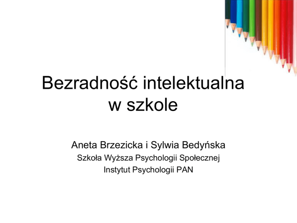 Bezradność intelektualna w szkole Aneta Brzezicka i Sylwia Bedyńska Szkoła Wyższa Psychologii Społecznej Instytut Psychologii PAN Czy problem bezradności intelektualnej dotyczy polskich szkół? • Program Międzynarodowej Oceny Umiejętności Uczniów OECD PISA • „Rozwijanie umiejętności samodzielnego myślenia, rozumowania naukowego, modelowania i rozumowania matematycznego, formułowania hipotez, zwięzłego zapisania wniosków, dostrzegania alternatywnych rozwiązań problemu, stanowi piętę achillesową polskiej oświaty” • System kształcenia promujący odtwórcze podejście do przyswajania wiedzy, bez nacisku na rozwój różnych form myślenia (rozumowania) to doskonała pożywka dla syndromu bezradności intelektualnej www.ifispan.waw.pl/ifis/badania/program_pisa/ Kiedy uczniowie „opowiadają dyrdymały” - ćwiczenie Uczniowskie strategie… przetrwalnikowe • Unikanie wzroku nauczyciela • Bezmyślne potakiwanie • Ściągawki, podpowiedzi • Słowotok • Udawanie (choroby), kłamstwo (na temat np. pogrzebu) Symptomy bezradności intelektualnej (wyczerpanie poznawcze) Emocjonalne: złość, smutek, zniechęcenie, przygnębienie, brak radości z uczenia się przedmiotu Motywacyjne: Poznawcze: zanik motywacji wewnętrznej (nie lubię tego przedmiotu) mniejsza liczba generowanych pomysłów jak rozwiązać zadanie, odczucie pustki w głowie, niepewność co do rozwiązania sytuacyjne „zawieszenie się” myślenia Wyuczona bezradność.. początki • Martin Seligman i współpracownicy (lata 70 XX wieku) – Eksperymenty „z klatką” na psach – Przypadkowe odkrycie psiej „bezmyślności” i trudności w jej pokonaniu Wyuczona bezradność • Wyuczona bezradność (learned helplessness) to utrwalenie przekonań o braku związku przyczynowego między własnym działaniem (reakcją), a jego konsekwencjami (wzmocnieniem) • Uprzedni kontakt z nierozwiązywalną (niekontrolowalną) sytuacją prowadzi do pojawienia się (w nowej sytuacji zadaniowej) deficytów: – Poznawczych (oczekiwanie braku kontroli) – Motywacyjnych (spadek zainteresowania i zaangażowania) – Emocjonalnych (obniżenie nastroju) Bezradność intelektualna poczucie braku kontroli • Wypalenie zawodowe („nie rozumiem co mam robić, żeby byli ze mnie zadowoleni”) • Bezrobocie („nie wiem jakie mam spełniać warunki, żeby dostać pracę”; „nawet jak na głowie stanę, to i tak nic się nie zmieni”) • Depresja („te myśli same przychodzą mi do głowy i nie mogę ich odsunąć”) Bezradność - przyczyny • Uczenie się braku zależności między własnym działaniem a otrzymywanym rezultatem zostało nazwane treningiem bezradności • Powtarzające się sytuacje treningu bezradności prowadzić mogą nie tylko do zaniku inicjatywy (bezrobotni), ale także do rozwinięcia się depresji • Pesymistyczny styl wyjaśniania zdarzeń jako czynnik ryzyka dla wystąpienia wyuczonej bezradności – trudności w działaniu przypisujemy czynnikom stałym, wewnętrznym i ogólnym, np. brakowi zdolności • Trening bezradności - przykład Warunek 1 r Tak Warunek 1 r Nie Warunek 1 r Tak Wybierz odpowiedź 1. 2. 3. 4. 5. Litera r Brak litery r Mały trójkąt Biały trójkąt Szary trójkąt Warunek 2 r Tak Warunek 2 r Nie Warunek 2 r Nie Wybierz odpowiedź 1. 2. 3. 4. 5. 6. Litera r Brak litery r Mały trójkąt Duży trójkąt Biały trójkąt Szary trójkąt Trening bezradności Zadania z warunku 1 są rozwiązywalne. W warunku 2 mimo intensywnego wysiłku nie można znaleźć rozwiązania. Osoba badane nie wie, że zadania są nierozwiązywalne co powoduje, że testuje hipotezy intensywnie ale bez zysku poznawczego w postaci znalezienia rozwiązania. Informacyjny model wyuczonej bezradności (Kofta i Sędek, 1983) • Kluczowe dla powstania syndromu wyuczonej bezradności – brak postępu poznawczego w rozwiązywaniu problemu pomimo intensywnego wysiłku intelektualnego (a nie jedynie dostrzeżenie braku zależności między reakcją i wzmocnieniem) • Przedłużające się „walenie głową w mur” doprowadza do wyczerpania poznawczego • Wyczerpanie = demobilizacja poznawcza – Pogorszenie wykonywania złożonych zadań („pustka w głowie”) – Zanik kreatywności, generowania nowych sposobów rozwiązania zadania – Zanik motywacji wewnętrznej Bezradność intelektualna w szkole • Model Kofty i Sędka w zastosowaniu do warunków szkolnych postuluje, że także w trakcie lekcji może odbywać się trening bezradności • Wtedy gdy uczeń ponawia wysiłki mające na celu opanowanie nowego materiału, lecz jest to bezoowocne • Jeśli uczeń w pewnym momencie swojej kariery szkolnej zostanie zniechęcony do aktywnego i twórczego myślenia w danym obszarze wiedzy – może to być przyczyną częściowego (swoistego) „ogłupienia” (Sędek, 1995) Błędne koło bezradności Nowy, trudny materiał Zmotywowany uczeń próbuje zrozumieć Sposób podawania nowej wiedzy, „aktywne” strategie przyswajania wiedzy Brak zrozumienia materiału Uczeń o pesymistycznym stylu wyjaśniania Uczeń o optymistycznym stylu wyjaśniania Wyczulenie na sygnały niezrozumienia, zadawanie pytań wymagających manipulacji wiedzą a nie jej odtwarzania, promowanie myślenia itp. Brak wsparcia ze strony nauczyciela/ bliskich Nie umiem, bo nie mam zdolności Brak motywacji do dalszej nauki, stosowanie strategii obronnych Nie umiem, ale się nauczę Kolejny materiał, nawet prosty, trudny do przyswojenia Uczeń bezradny intelektualnie – leń? • Uczeń bezradny intelektualnie – Nie tyle opanowuje materiał wolniej niż uczniowie osiągający dobre wyniki w danym przedmiocie – Co przestaje używać swoich „normalnych” możliwości poznawczych do rozwiązywania problemów w danej dziedzinie Jak rozpoznać ucznia bezradnego intelektualnie • Jeśli uczeń: – Nie zna odpowiedzi na pytanie, w którym miesiącu wybuchło Powstanie Listopadowe – Bez wahani