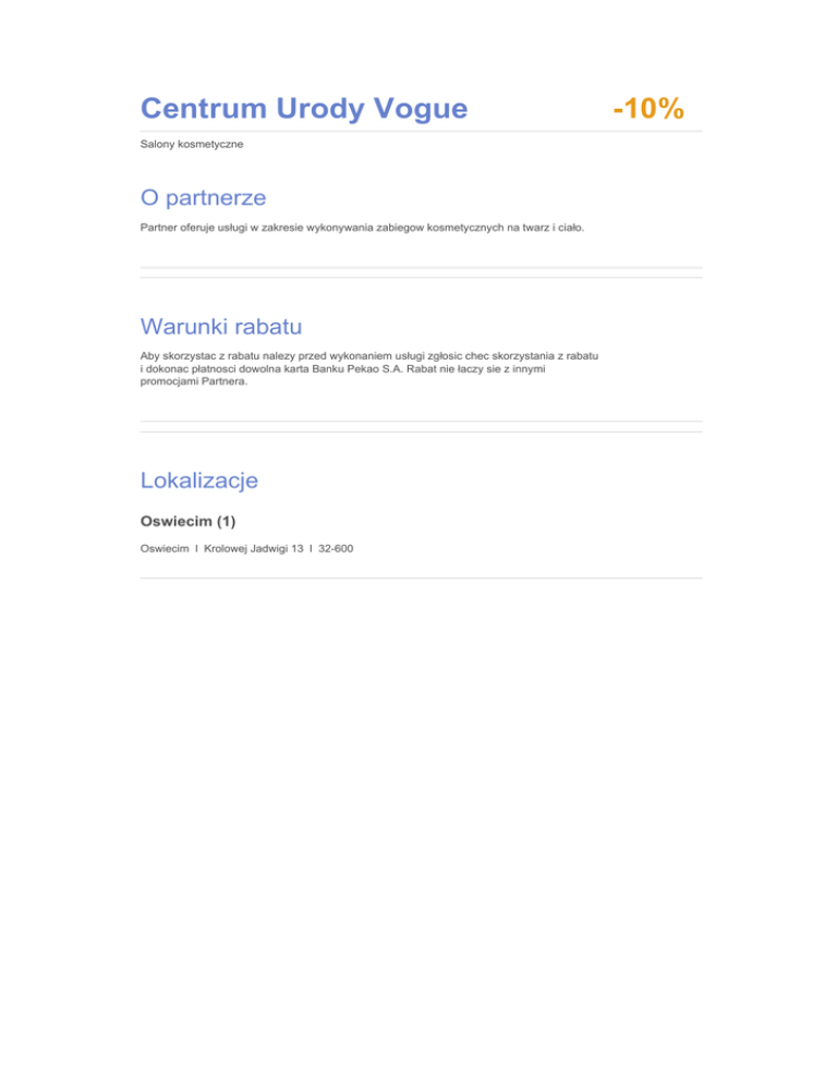 Centrum Urody Vogue Salony kosmetyczne O partnerze Partner oferuje usługi w zakresie wykonywania zabiegow kosmetycznych na twarz i ciało. Warunki rabatu Aby skorzystac z rabatu nalezy przed wykonaniem usługi zgłosic chec skorzystania z rabatu i dokonac płatnosci dowolna karta Banku Pekao S.A. Rabat nie łaczy sie z innymi promocjami Partnera. Lokalizacje Oswiecim (1) Oswiecim l Krolowej Jadwigi 13 l 32-600 -10%