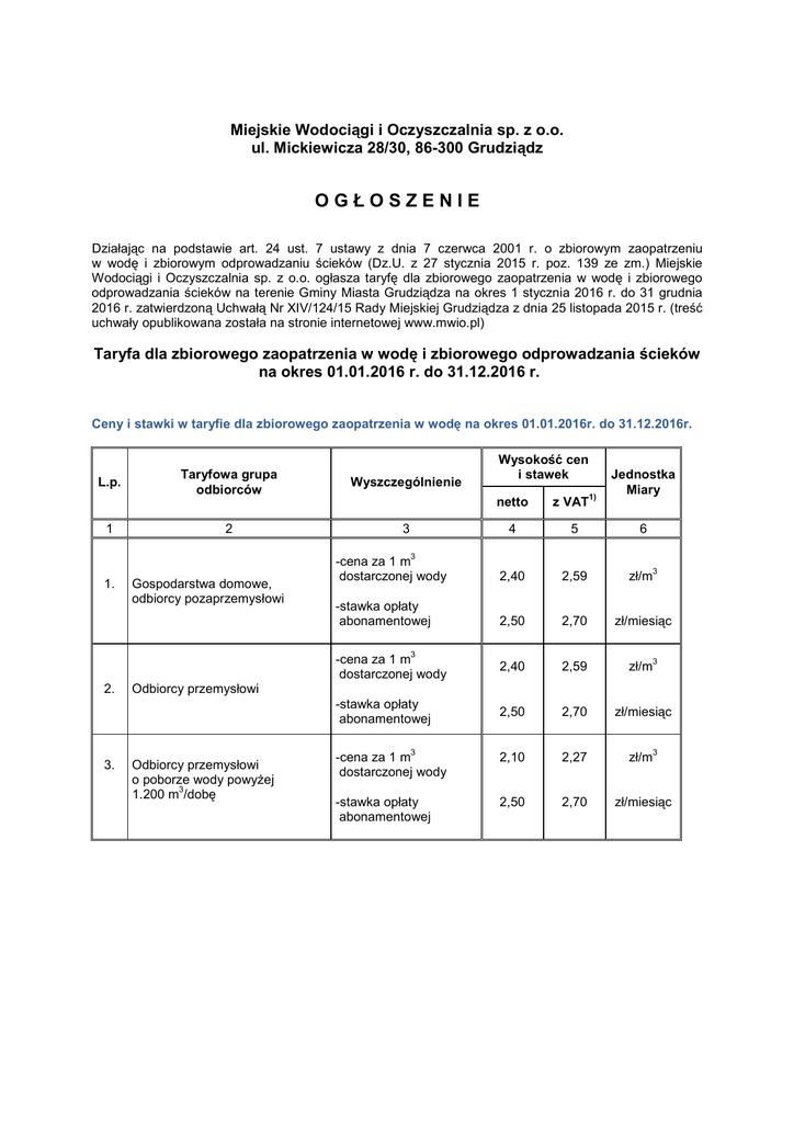 Miejskie Wodociągi i Oczyszczalnia sp. z o.o. ul. Mickiewicza 28/30, 86-300 Grudziądz OGŁOSZENIE Działając na podstawie art. 24 ust. 7 ustawy z dnia 7 czerwca 2001 r. o zbiorowym zaopatrzeniu w wodę i zbiorowym odprowadzaniu ścieków (Dz.U. z 27 stycznia 2015 r. poz. 139 ze zm.) Miejskie Wodociągi i Oczyszczalnia sp. z o.o. ogłasza taryfę dla zbiorowego zaopatrzenia w wodę i zbiorowego odprowadzania ścieków na terenie Gminy Miasta Grudziądza na okres 1 stycznia 2016 r. do 31 grudnia 2016 r. zatwierdzoną Uchwałą Nr XIV/124/15 Rady Miejskiej Grudziądza z dnia 25 listopada 2015 r. (treść uchwały opublikowana została na stronie internetowej www.mwio.pl) Taryfa dla zbiorowego zaopatrzenia w wodę i zbiorowego odprowadzania ścieków na okres 01.01.2016 r. do 31.12.2016 r. Ceny i stawki w taryfie dla zbiorowego zaopatrzenia w wodę na okres 01.01.2016r. do 31.12.2016r. L.p. 1 Taryfowa grupa odbiorców 2 Wyszczególnienie Wysokość cen i stawek Jednostka Miary netto z VAT1) 4 5 6 -cena za 1 m dostarczonej wody 2,40 2,59 zł/m -stawka opłaty abonamentowej 2,50 2,70 zł/miesiąc -cena za 1 m dostarczonej wody 2,40 2,59 zł/m -stawka opłaty abonamentowej 2,50 2,70 zł/miesiąc -cena za 1 m dostarczonej wody 2,10 2,27 zł/m -stawka opłaty abonamentowej 2,50 2,70 zł/miesiąc 3 3 1. Gospodarstwa domowe, odbiorcy pozaprzemysłowi 3 2. 3 Odbiorcy przemysłowi 3 3. 3 Odbiorcy przemysłowi o poborze wody powyżej 3 1.200 m /dobę 3 Ceny w taryfie dla zbiorowego odprowadzania ścieków na okres 01.01.2016 r. do 31.12.2016 r. L.p. 1 Cena Taryfowa grupa odbiorców Wyszczególnienie 2 3 netto z VAT Jednostka Miary 4 5 6 4,65 5,02 zł/m 5,20 5,62 zł/m 4,65 5,02 zł/m3 1) 3 1. cena za 1 m odprowadzonych ścieków Gospodarstwa domowe, odbiorcy pozaprzemysłowi 3 3 cena za 1 m odprowadzonych ścieków 2. Odbiorcy przemysłowi 3. Odbiorcy przemysłowi odprowadzający ścieki powyżej 3 850 m /dobę 3 3 cena za 1 m odprowadzonych ścieków Stawki opłat za przekroczenie warunków wprowadzania ścieków przemysłowych do urządzeń kanalizacyjnych na okres 01.01.2016 r. do 31.12.2016 r. L.p. stawka Przekroczenie wskaźnika zanieczyszczeń 1 2 0 3 1) netto z VAT 3 4 1,00 zł 1,08 zł 1. Temperatura – za przekroczenie o 1 C w m 2. Odczyn – za przekroczenie o 1pH w m 5,00 zł 5,40 zł 3. Substancje ekstrahujące się eterem naftowym, +6 Węglowodory ropopochodne, Chrom , Chrom ogólny, Nikiel, Miedź, Kadm, Rtęć, Ołów, Cynk, Cyjanki związane 3 – za 1g przekroczenia w m 5,20 zł 5,62 zł 4. Azot amonowy, Fosfor ogólny 3 – za 1g przekroczenia w m 0,52 zł 0,56 zł 5. ChZT, BZT5, Zawiesina ogólna, Siarczany, Chlorki 3 – za 1kg przekroczenia w m 5,20 zł 5,62 zł 3 1) Ceny brutto z VAT zawierają 8% podatku VAT według stanu prawnego na dzień podjęcia uchwały. W przypadku zmiany stawki będzie ona naliczana w obowiązującej wysokości i dodana do cen netto wody i ścieków oraz stawek opłat. Tak skorygowana cena obowiązywać będzie z dniem wprowadzenia zmian.